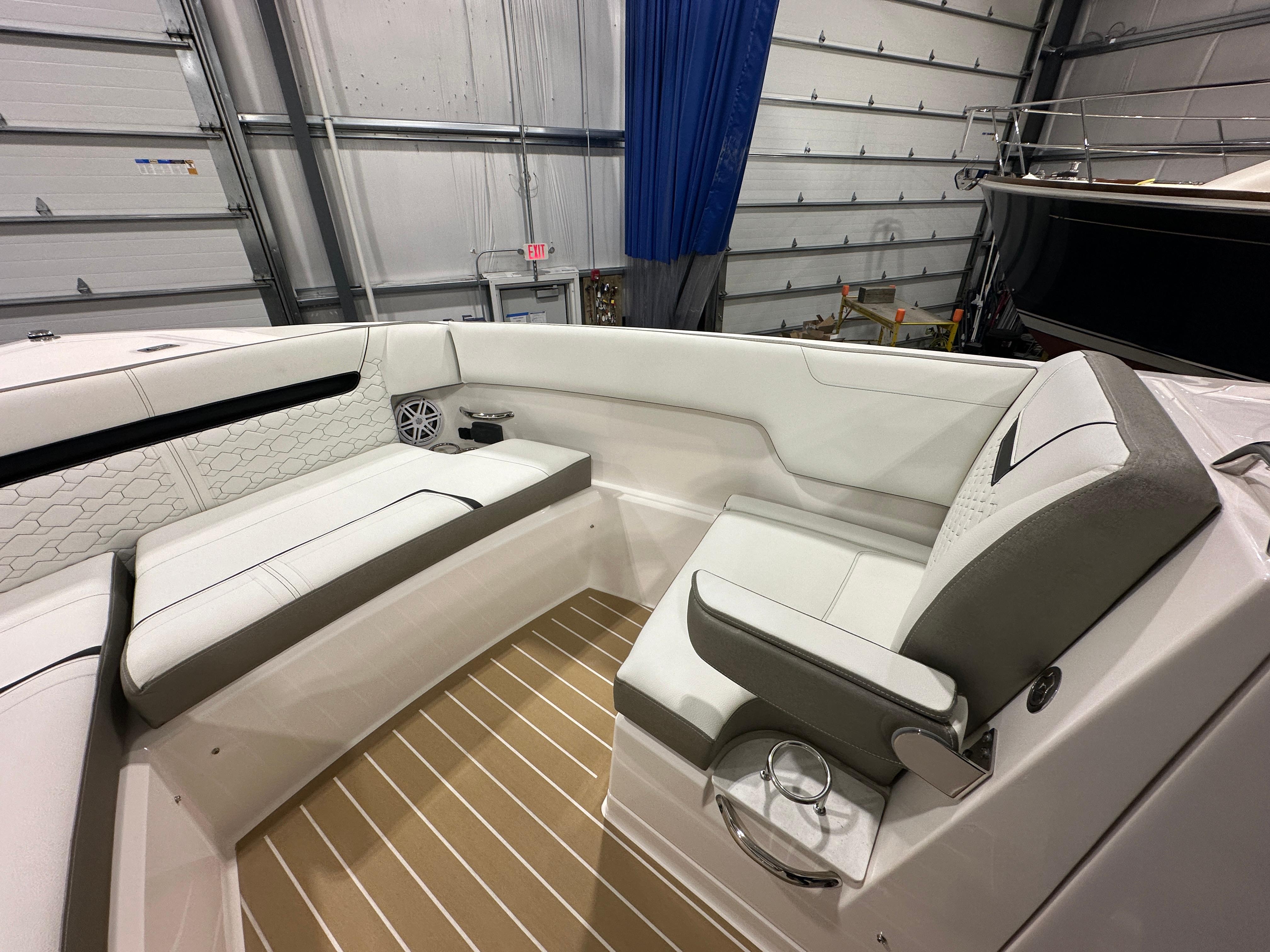 A traditional bow rider layout, the 34 LX provides comfortable forward seating accessed via a centerline pass through. The forward smart storage allows space for beach and water gear as well as boat equipment. Aft, the transformational seats convert individually to chaise lounges or sun pads based on guests’ needs aboard. Standard amenities include a sunroof, powered aft cockpit sunshade and private head adding comfort for everyone aboard.