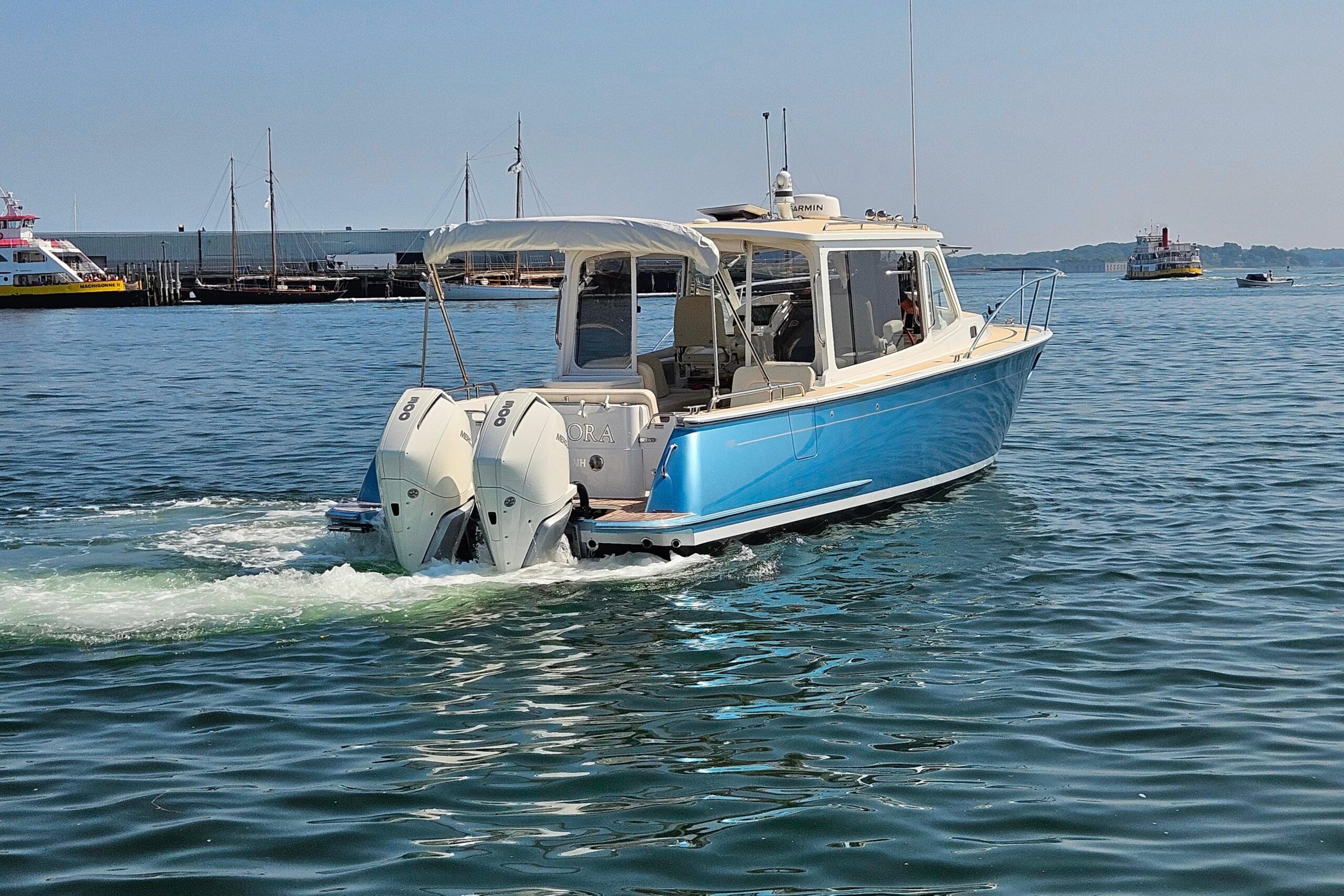 Love the performance of outboards? The MJM 35 offers elegant, high-tech comfort and epic performance. Along with protection from the wind, sun and spray, the indoor/outdoor pilothouse delivers an incredibly versatile day yachting experience with 360-degree views. Experience the responsive power and sports car handling of the advanced hull geometry along with a quiet, smooth ride thanks to her vacuum infused Epoxy composite construction. The open layout brings friends and family together in three social zones. Whether you are enjoying a relaxing harbor cruise, entertaining guests, or a day on the water making memories, the MJM 35 is well suited to your boating lifestyle. Unwind below in classic nautical styling that features large head, full galley, and roomy V-berth.