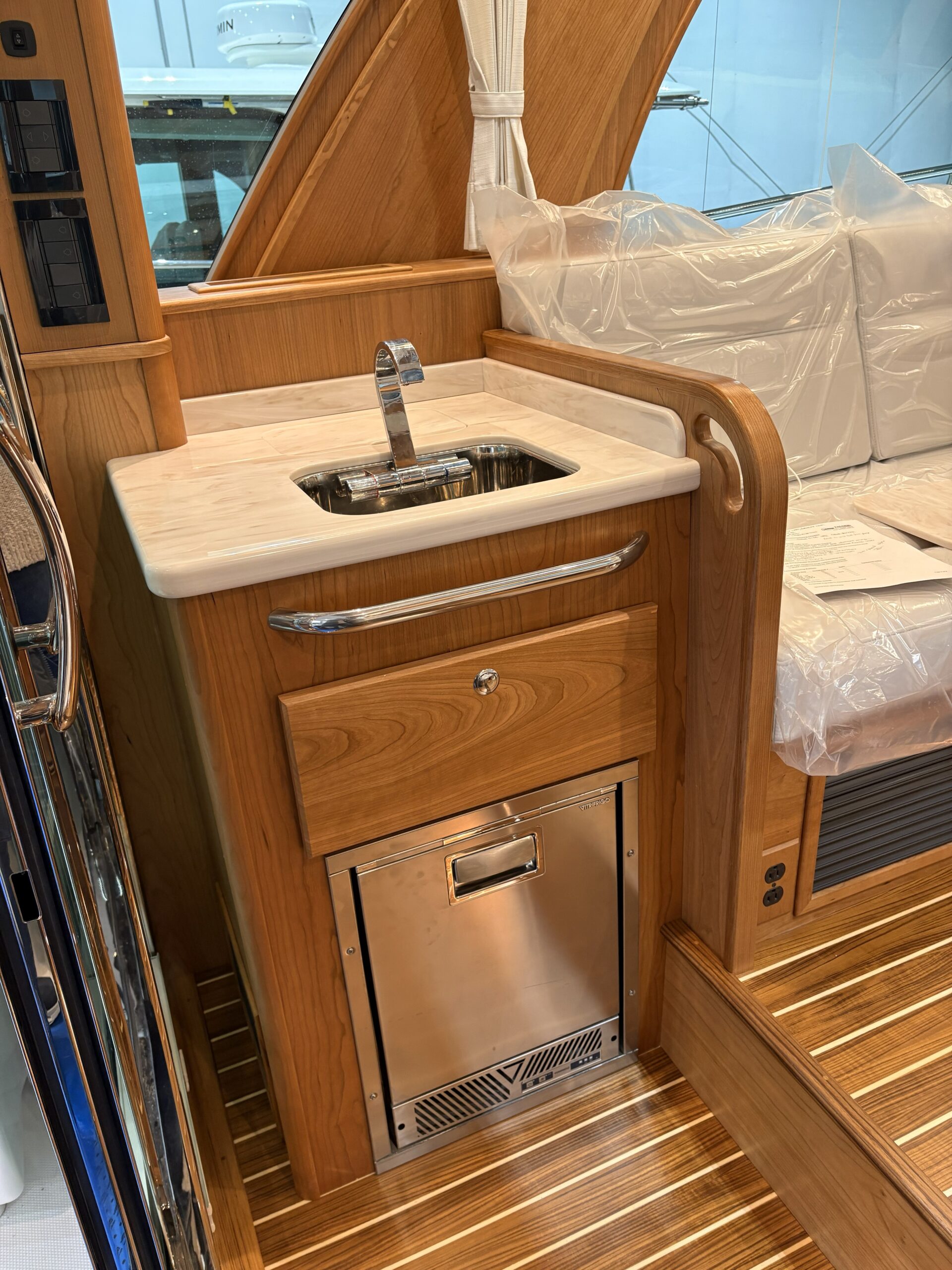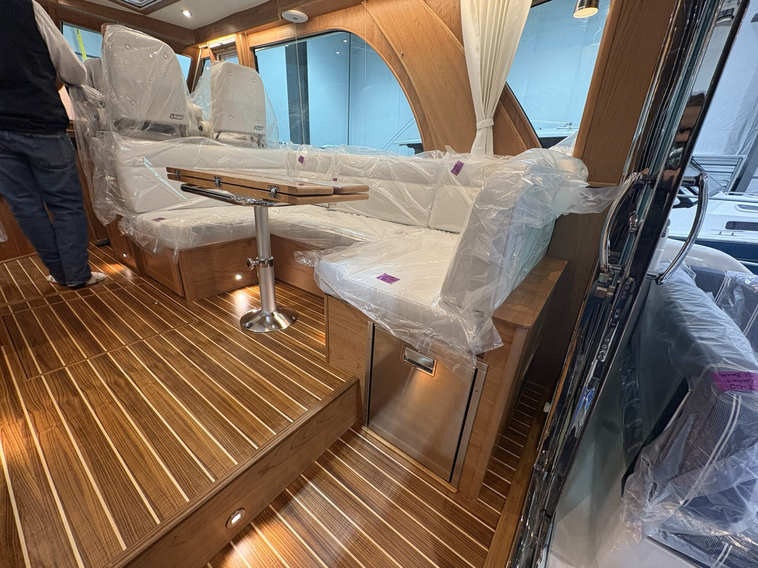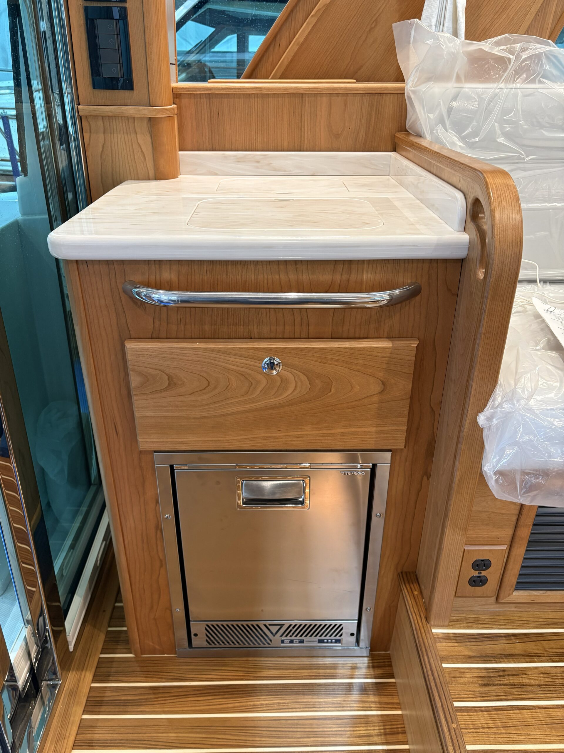 Upon stepping into the spacious aft cockpit, you’re immediately greeted by an abundance of comfortable seating centered around a stunning high-gloss Release Marine table. This inviting space is ideal for gathering with friends and family, whether cruising or relaxing dockside. Hull 2 is equipped with the optional cockpit grill cabinet, thoughtfully positioned in the corner for convenient access. The cabinet offers generous storage while maintaining a sleek, unobtrusive profile—perfect for the chef!