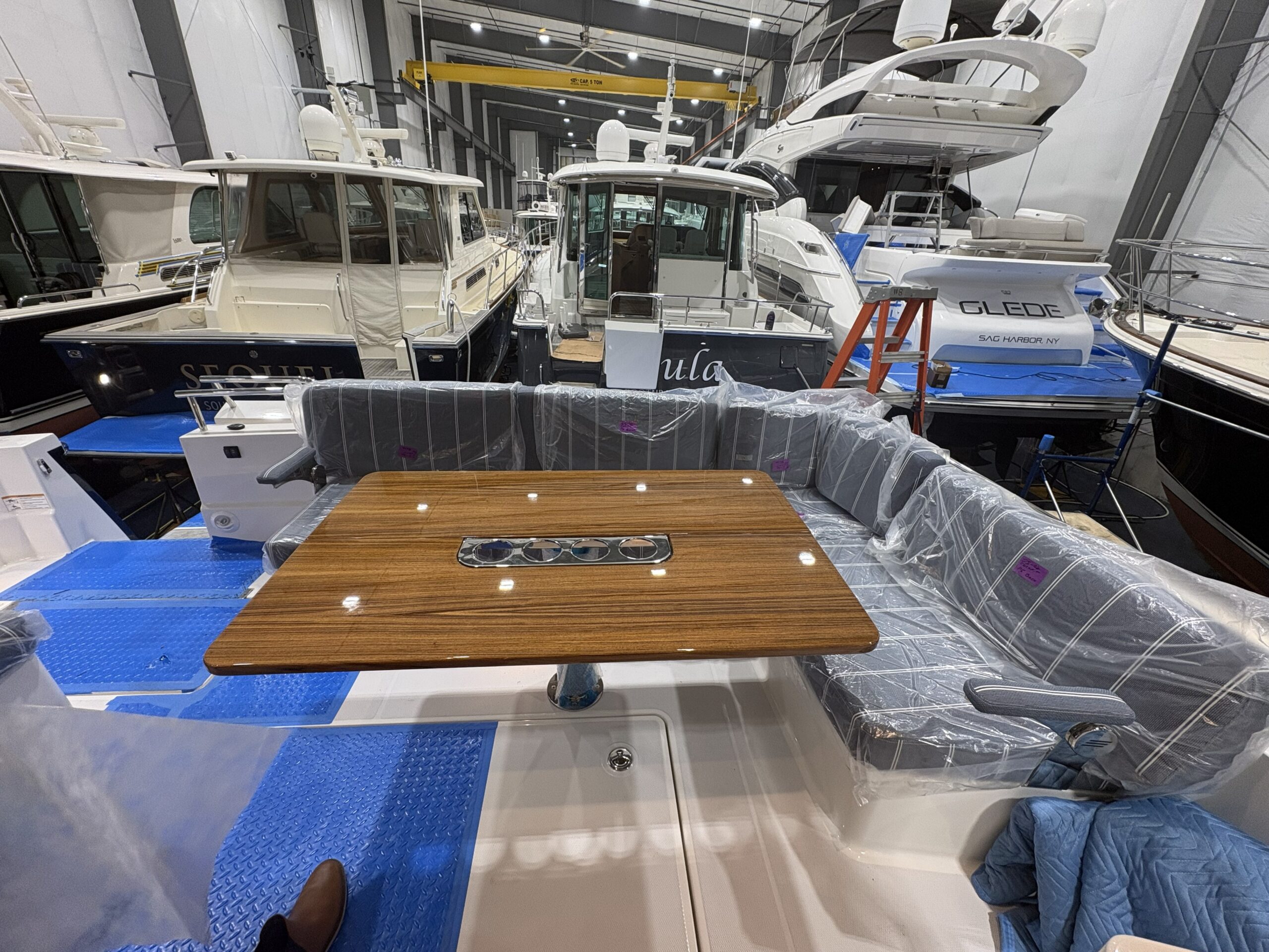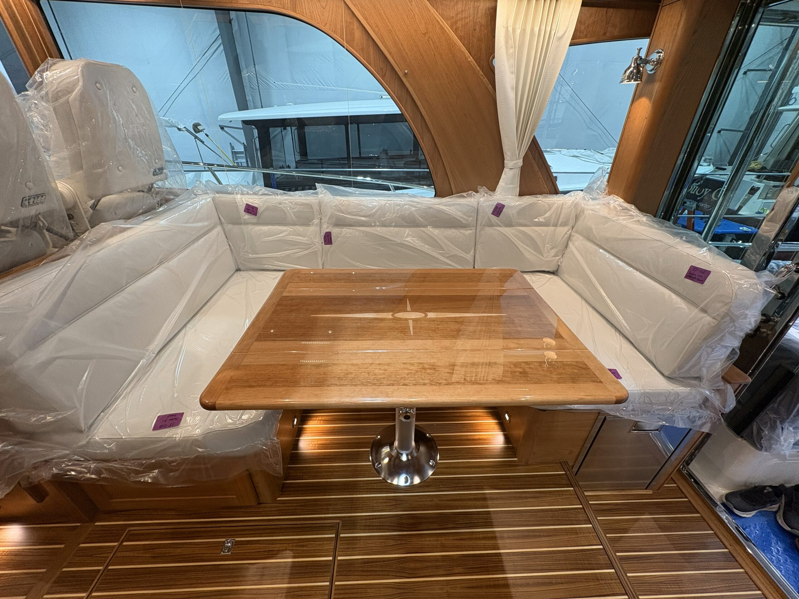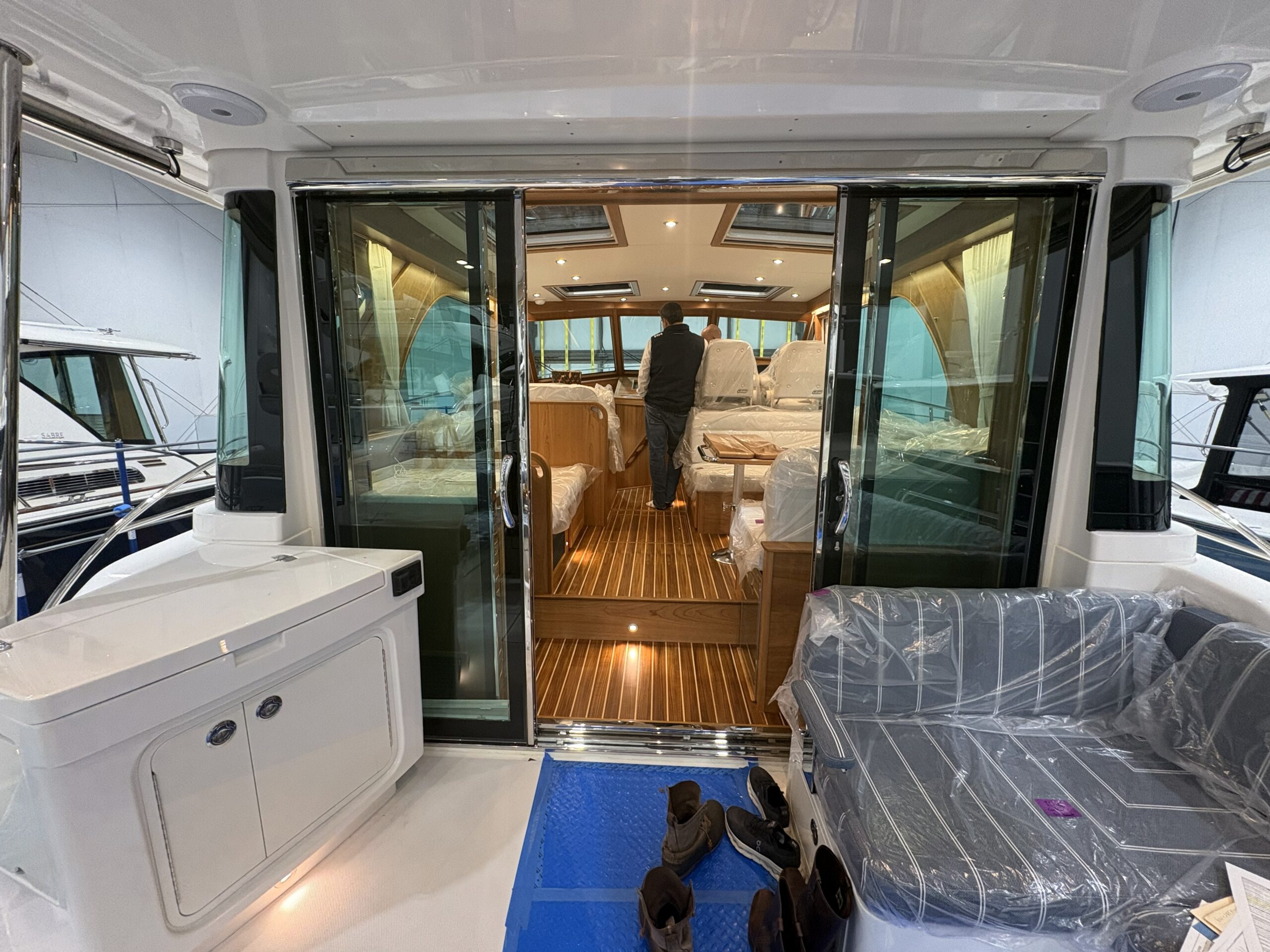 Upon stepping into the spacious aft cockpit, you’re immediately greeted by an abundance of comfortable seating centered around a stunning high-gloss Release Marine table. This inviting space is ideal for gathering with friends and family, whether cruising or relaxing dockside. Hull 2 is equipped with the optional cockpit grill cabinet, thoughtfully positioned in the corner for convenient access. The cabinet offers generous storage while maintaining a sleek, unobtrusive profile—perfect for the chef!