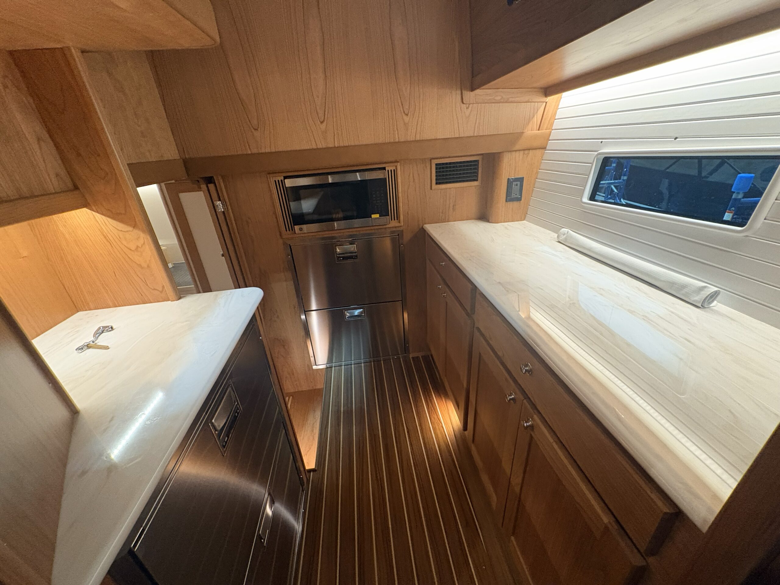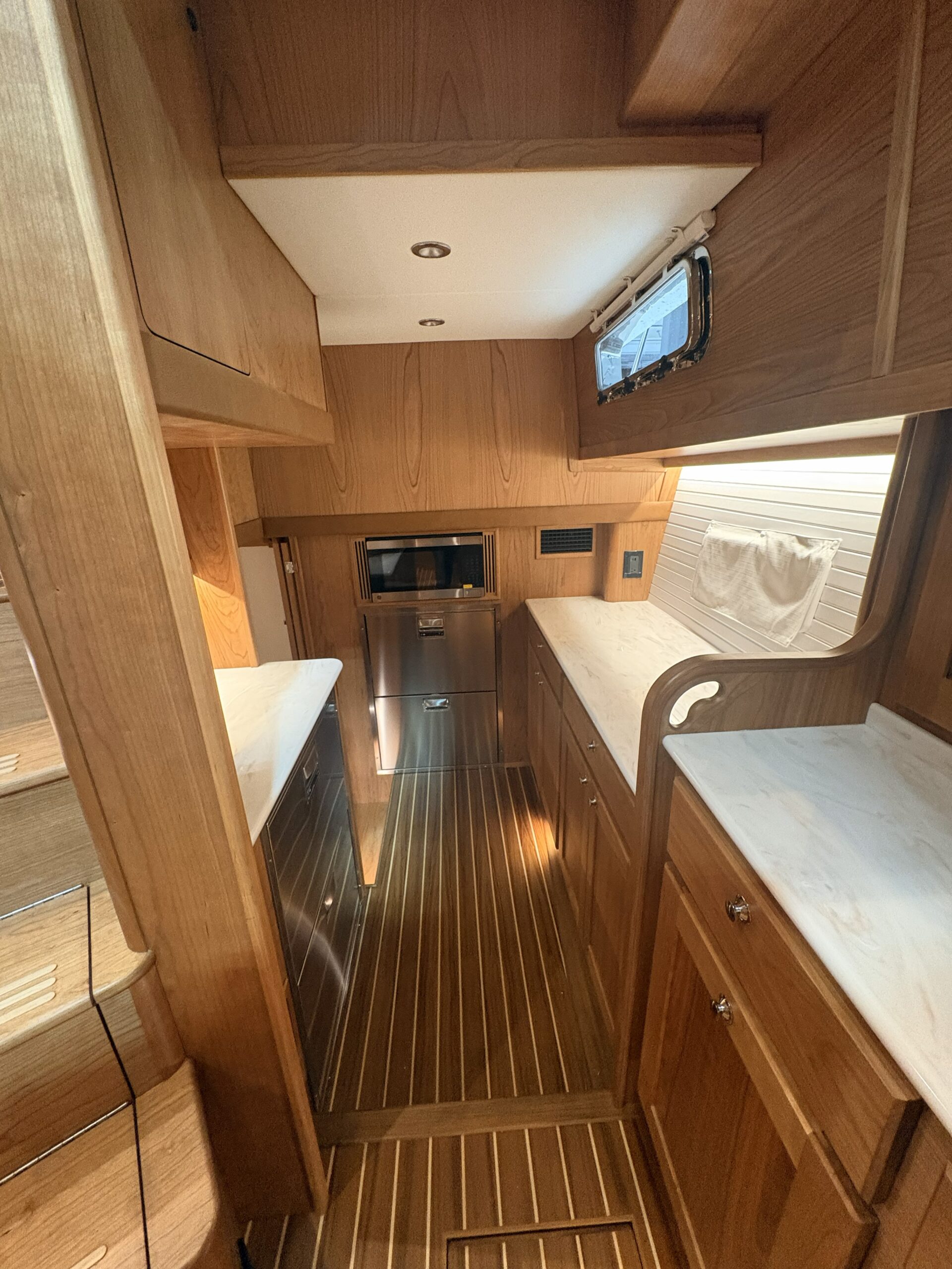 Descending below, you’re welcomed by the galley and pantry. The pantry is a standout feature and one our team is particularly excited about. With an impressive amount of additional storage, it’s truly a game changer for owners who enjoy cooking and entertaining onboard.