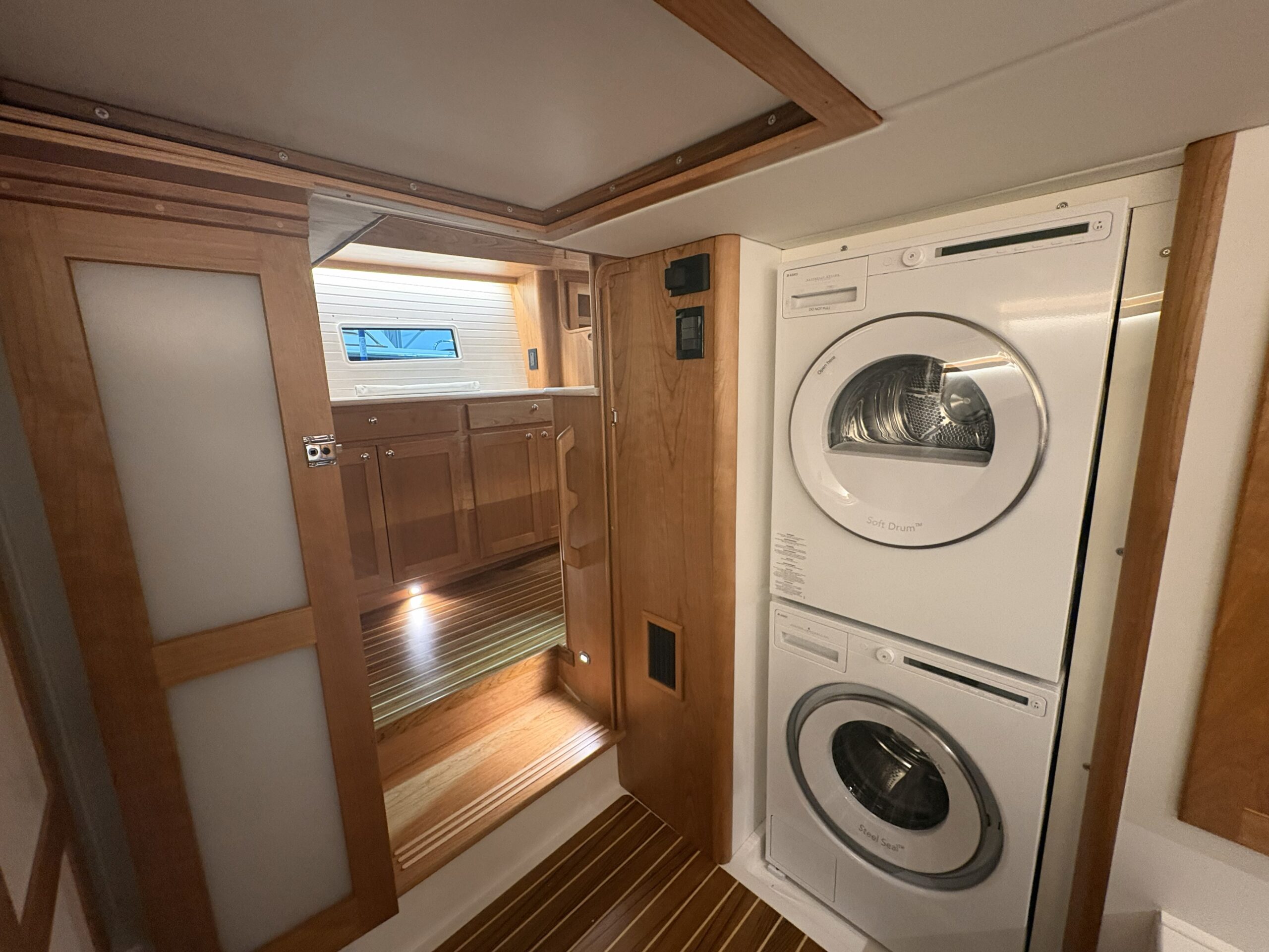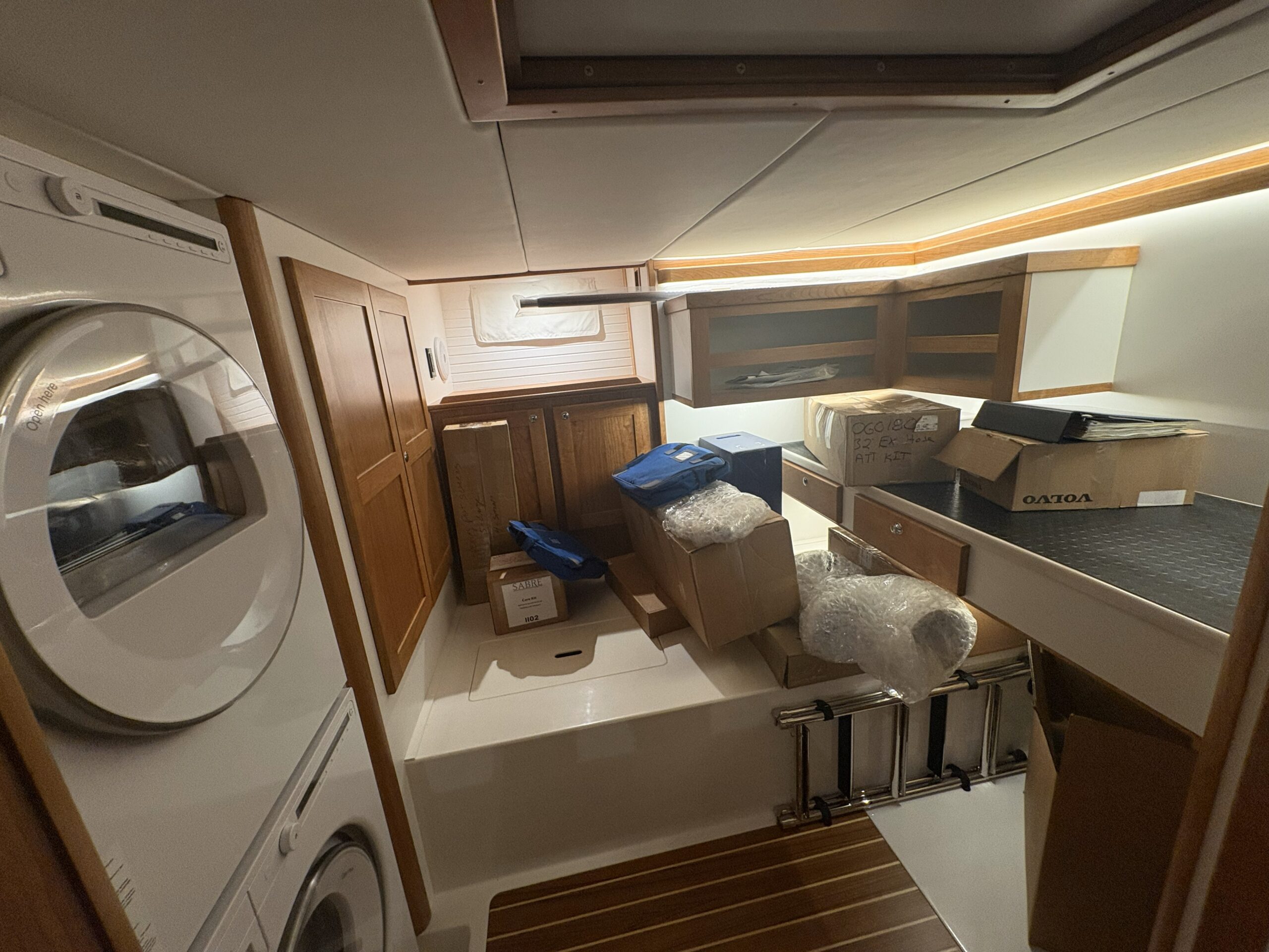 Just off the pantry is the utility space, offering easy access to onboard laundry facilities along with additional storage—another thoughtful touch that enhances both comfort and practicality aboard the Sabre 51.