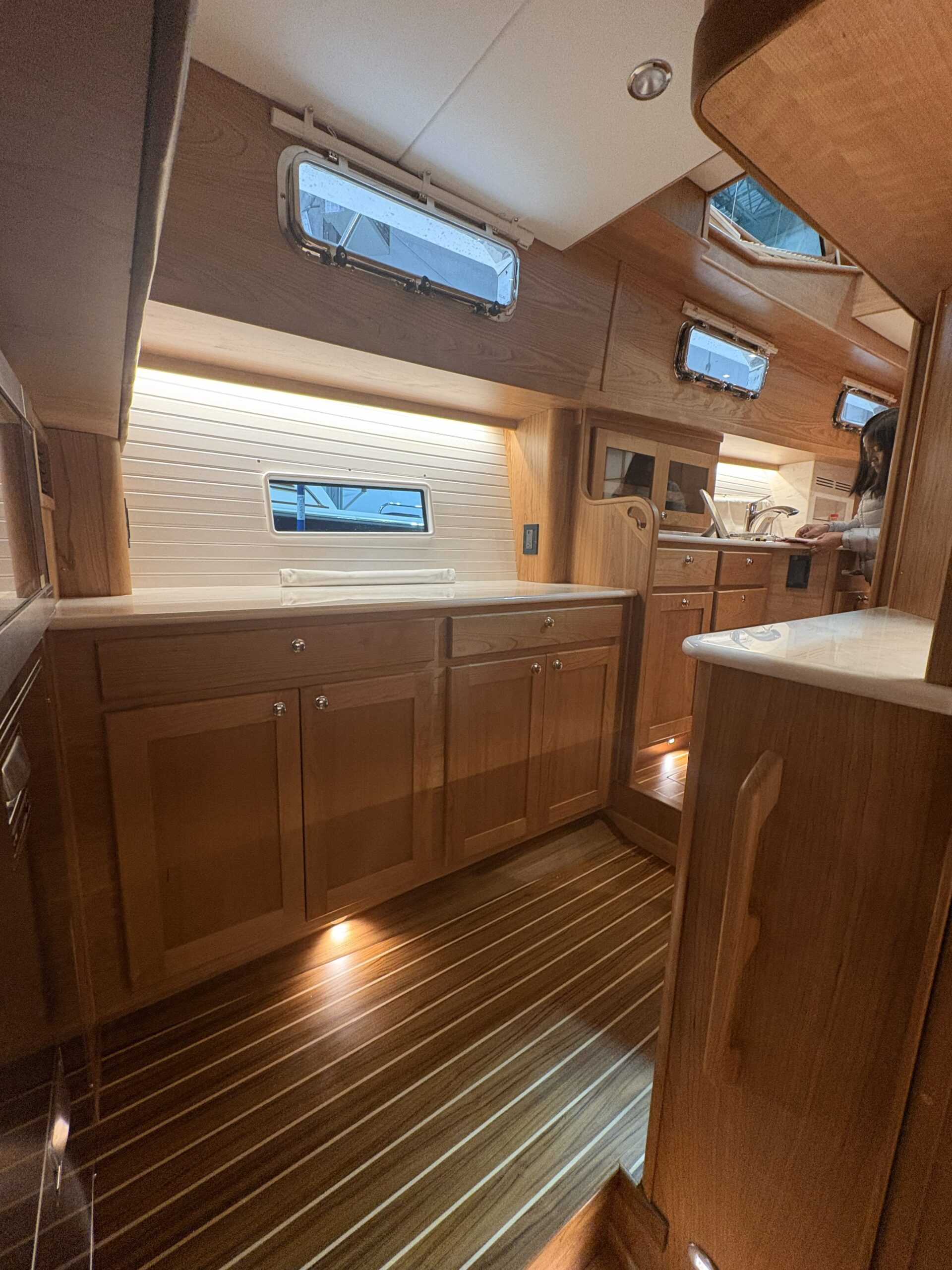 Entering the salon through the sliding aft doors, you’ll find a well-appointed wet bar, ideally located for entertaining both in the cockpit and the main salon. The salon itself features settees on both the port and starboard sides, providing ample seating for guests underway or during cozy evenings aboard on cooler summer nights.