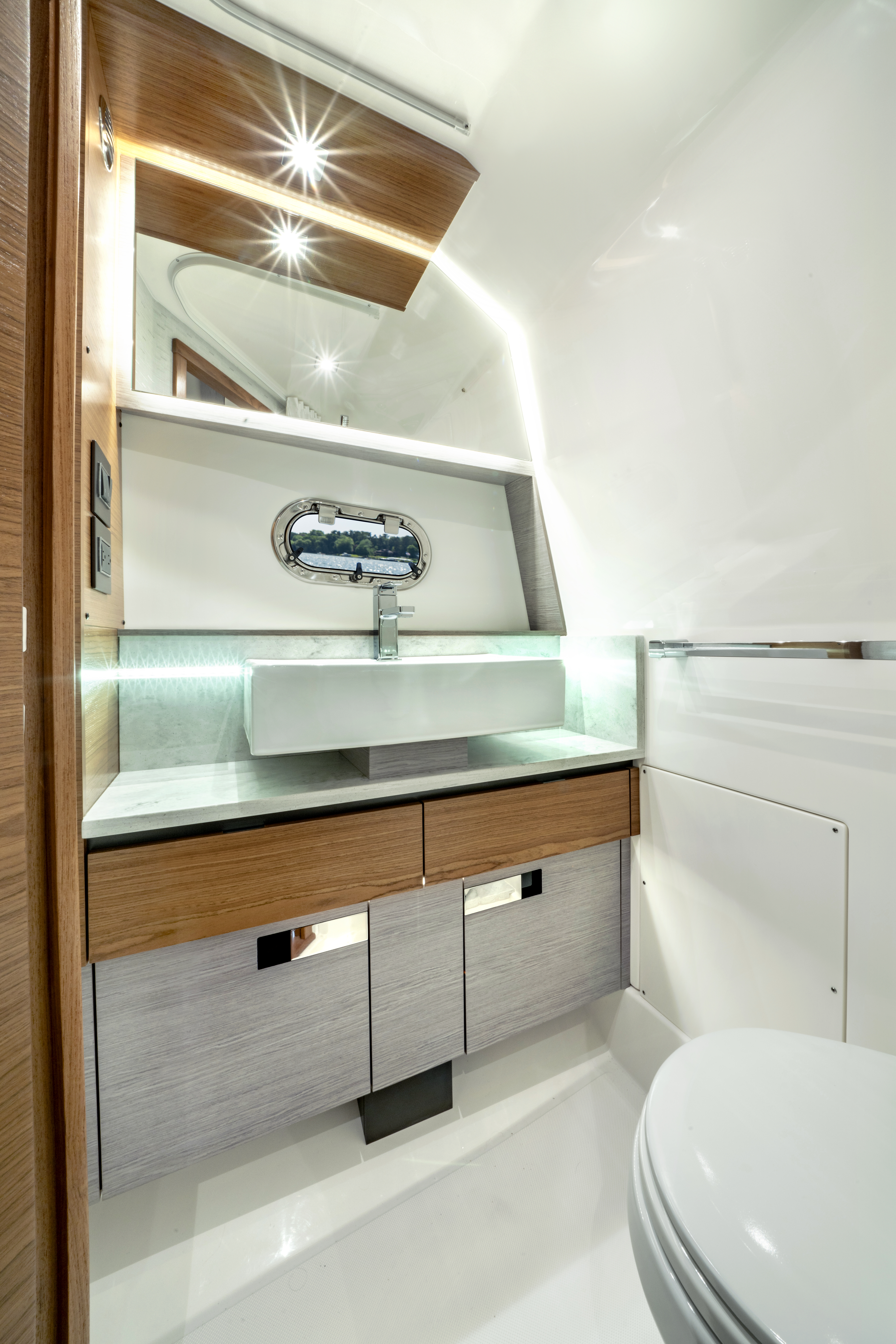 Step inside the Tiara 43 LS and discover a cabin that blends modern design with ultimate comfort. Large hullside windows flood the space with natural light, creating an open and inviting atmosphere. The main spacious berth and private head with fully enclosed shower provide all the comforts needed for an overnight stay. The mid-cabin berth includes a foldable mattress to allow for additional guests or storage.
