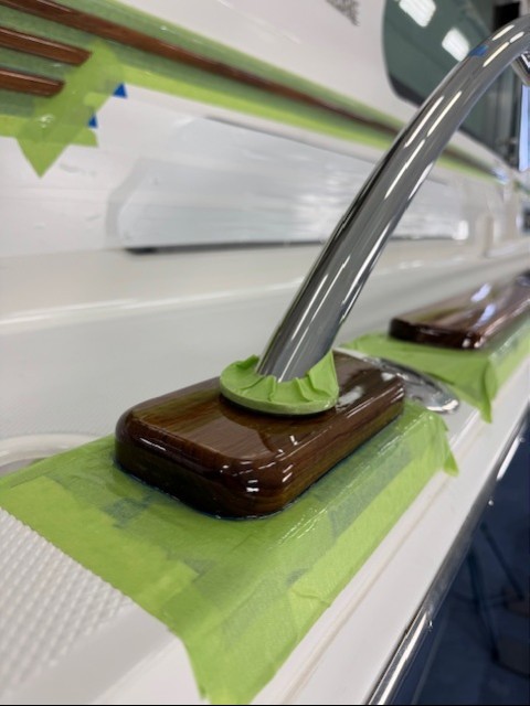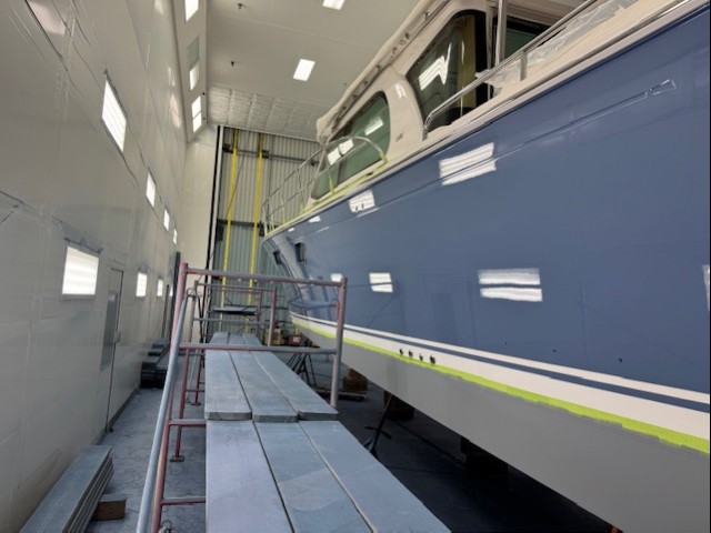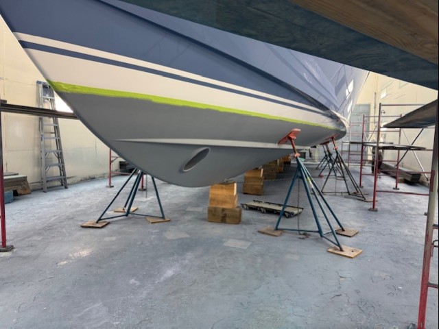 This Sabre 51 received its stunning makeover at Great Island Boat Yard, with a rich pigeon blue hull paired perfectly with a sleek gray barrier coat below the waterline. The contrast is sharp, timeless, and built to stand out whether she’s at the dock or underway. The cove stripe and name will be going on soon, bringing the whole look together and making her truly one of a kind.