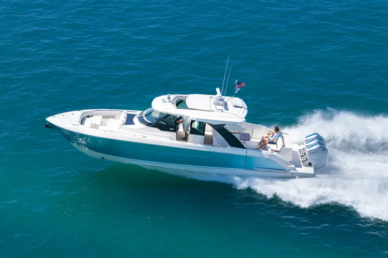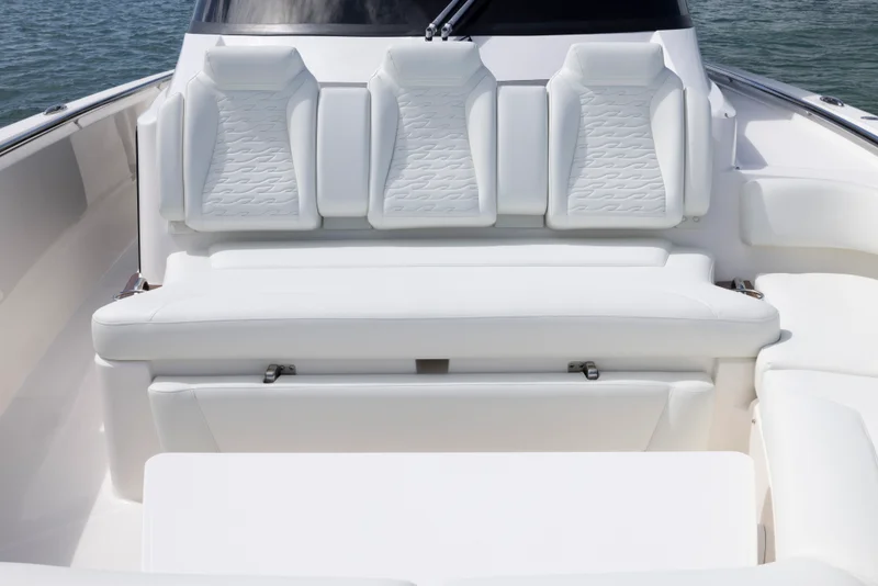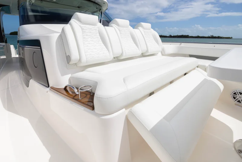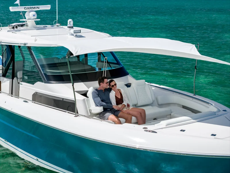 The bow on the Tiara 46 LS is designed for effortless relaxation and connection. The wrap around layout creates a comfortable, social space up front, perfect for relaxing or entertaining on the water. A forward facing chaise adds laid back comfort, while thoughtful details keep everything within reach.