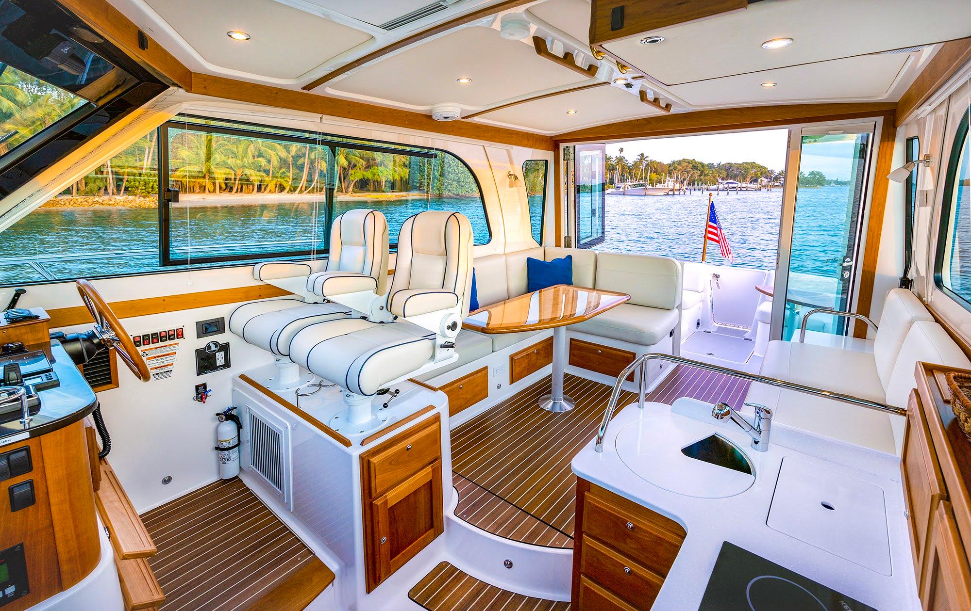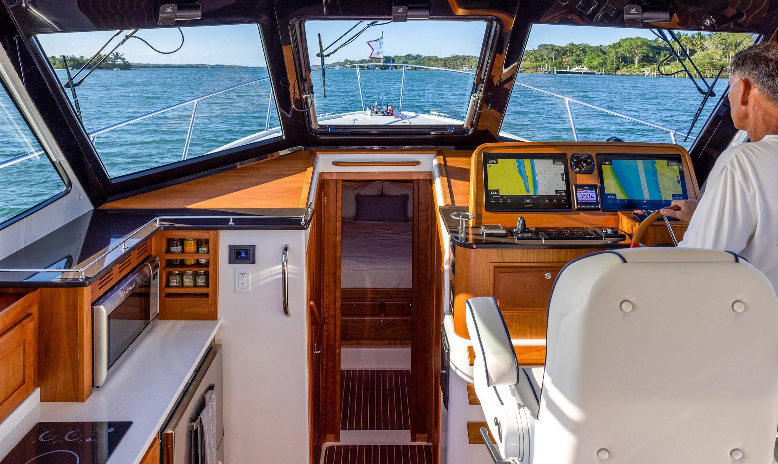 The genius of the 372’s cockpit lies in its ability to connect you to the elements while offering protection. The hardtop, with its opening sunroof and the option for a full enclosure, shields occupants from sun, spray, or a sudden downpour without isolating them from the world outside. Large opening side windows and a massive aft window/door that slides open wide blur the lines between interior and exterior, allowing a refreshing breeze to flow through the space.