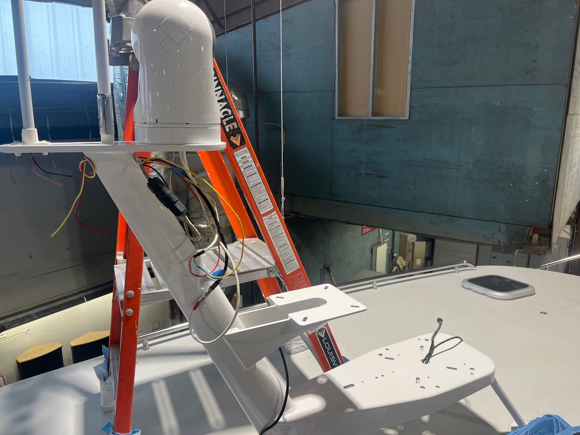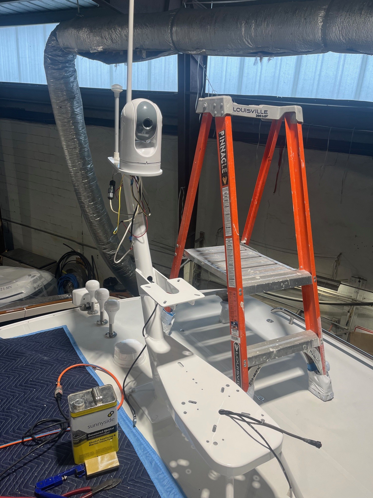 This week, our Electronics Installation Specialist, Dan Loring, worked diligently to reinstall the mast on this True North 38 after it’s paintwork was complete.