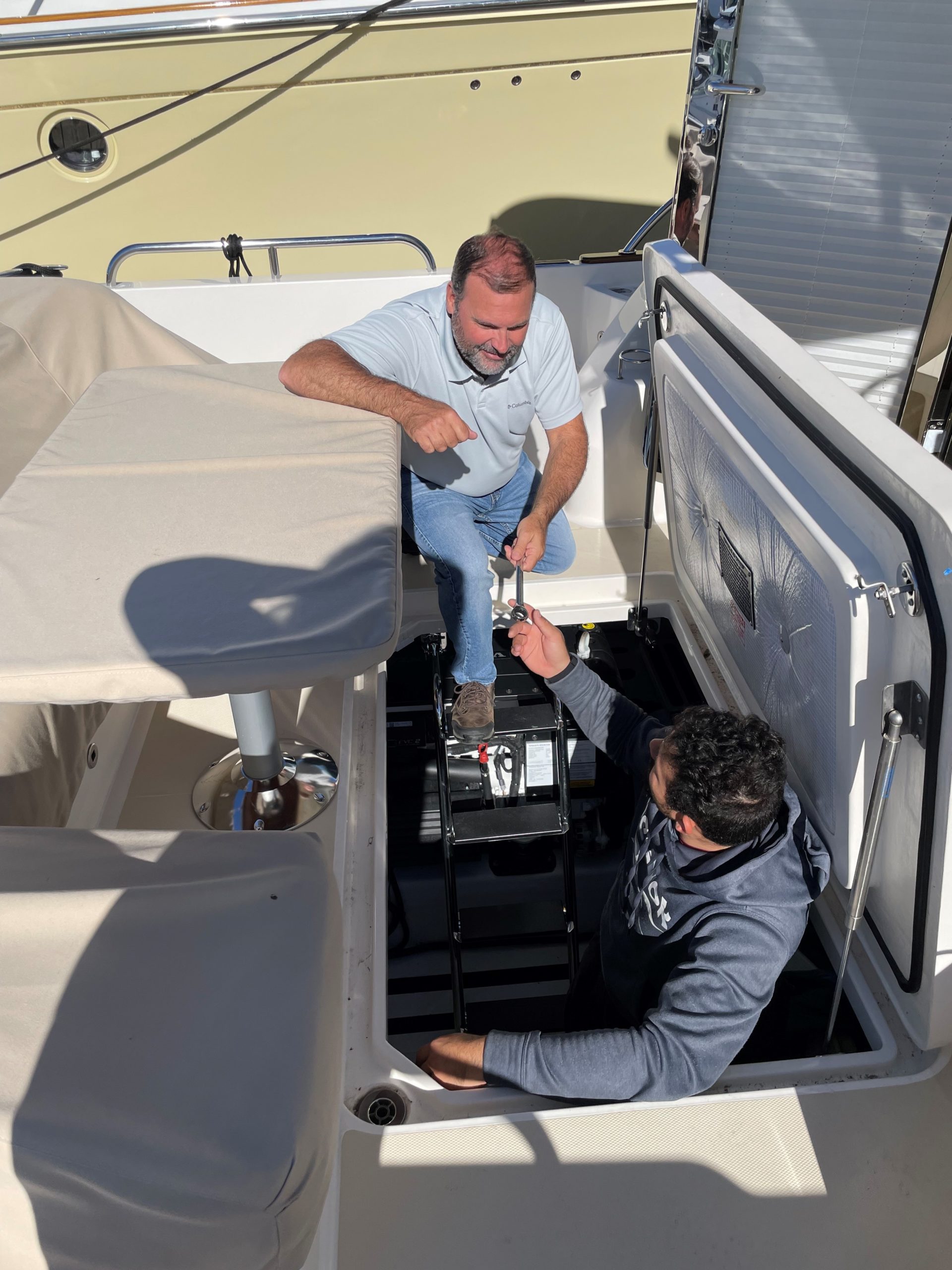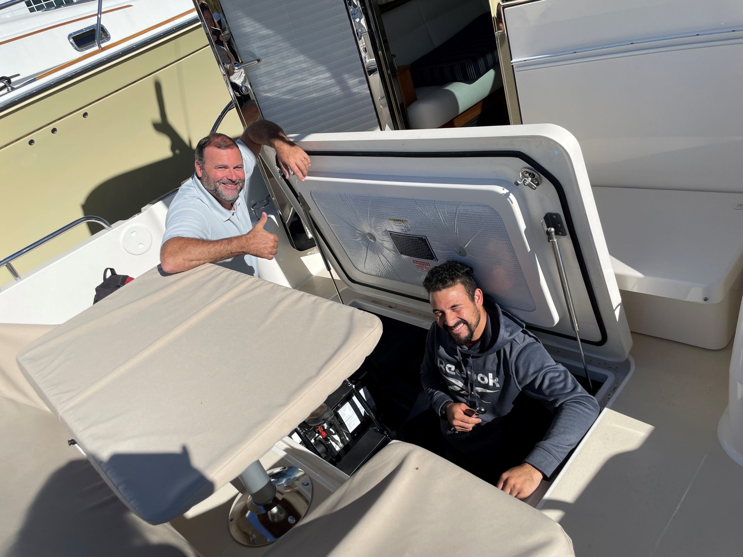Glen Cove’s service team has been active this fall in preparation for winter storage. Most recently, a Back Cove 37 and a Sabre 45 have been dropped off by owners for winterization prep and haul out. This is a great time for our service team to do repairs or routine maintenance on these vessels that will be stored on site or nearby our Glen Cove office. Here you’ll see service manager, Mike and service tech, Marco working in the engine room on a Sabre 45.