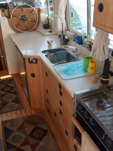 Custom corian counter top extension to extend galley counter top when lower helm is not in use.