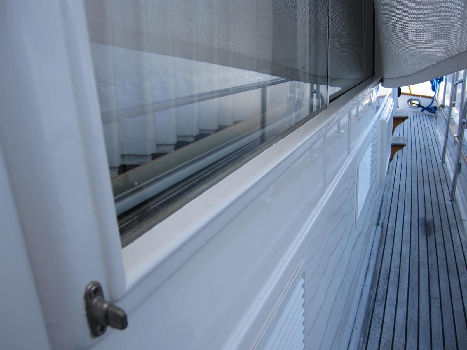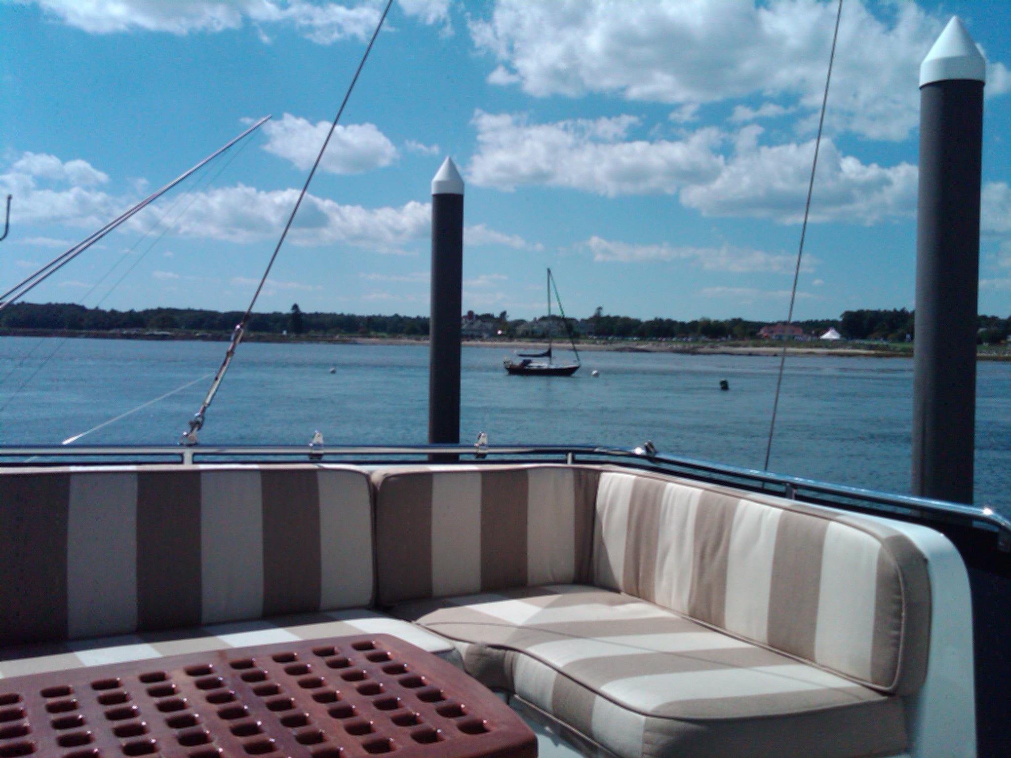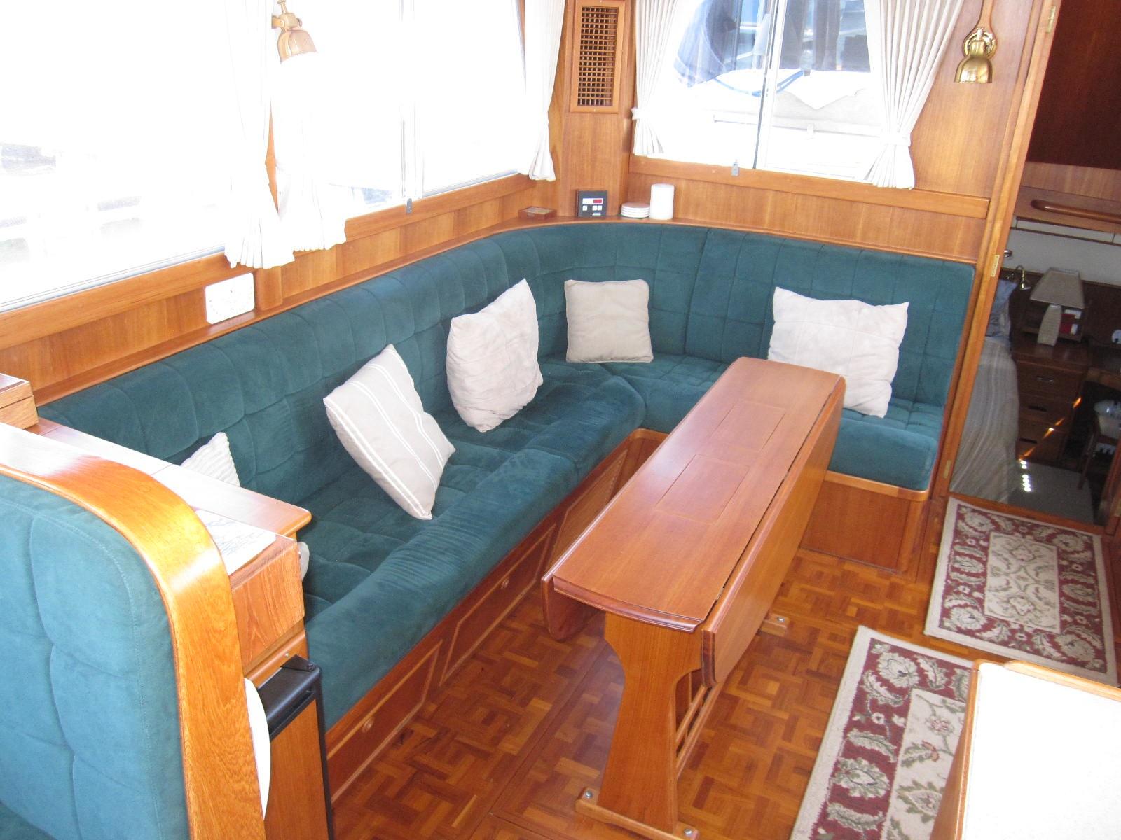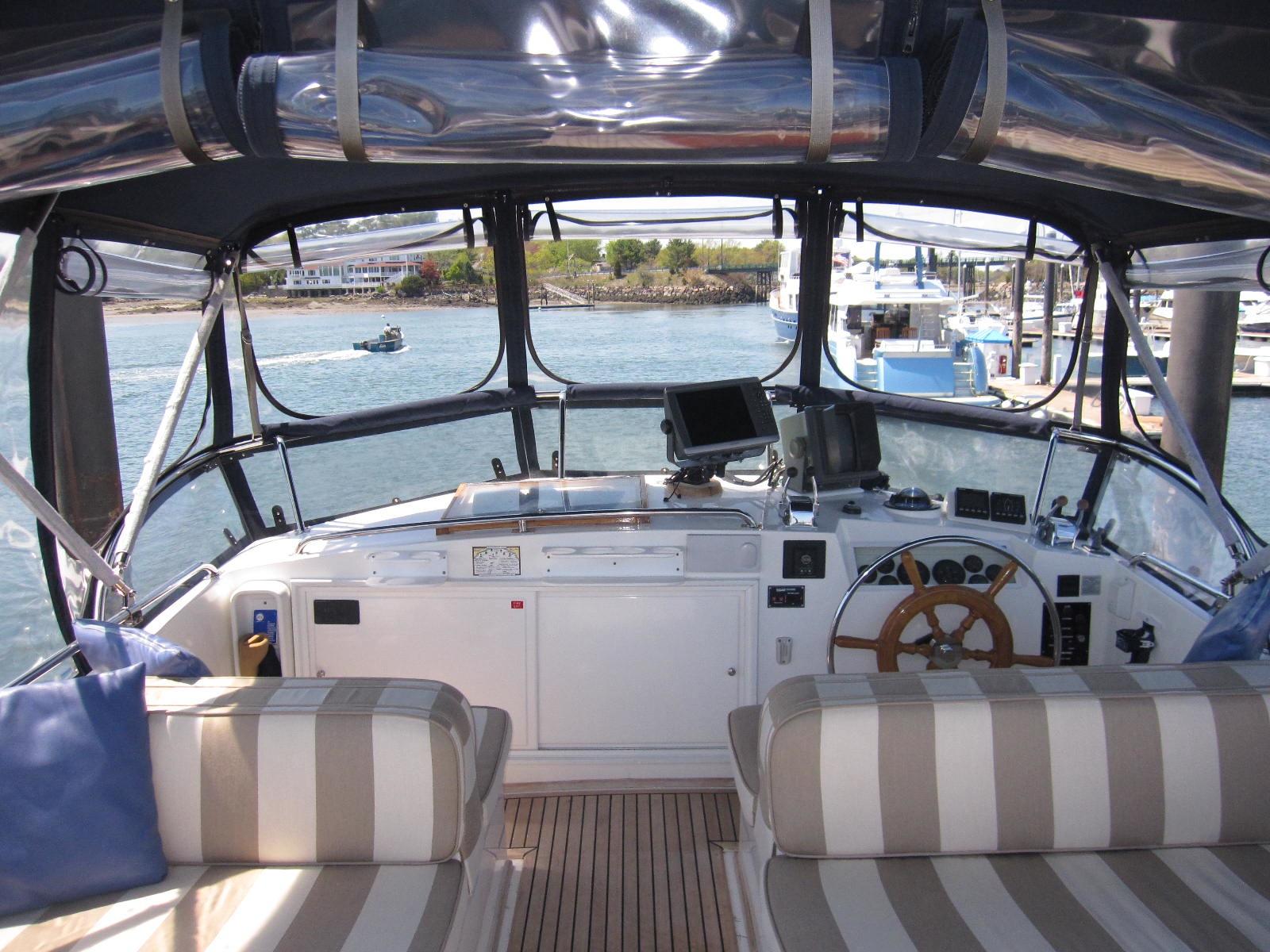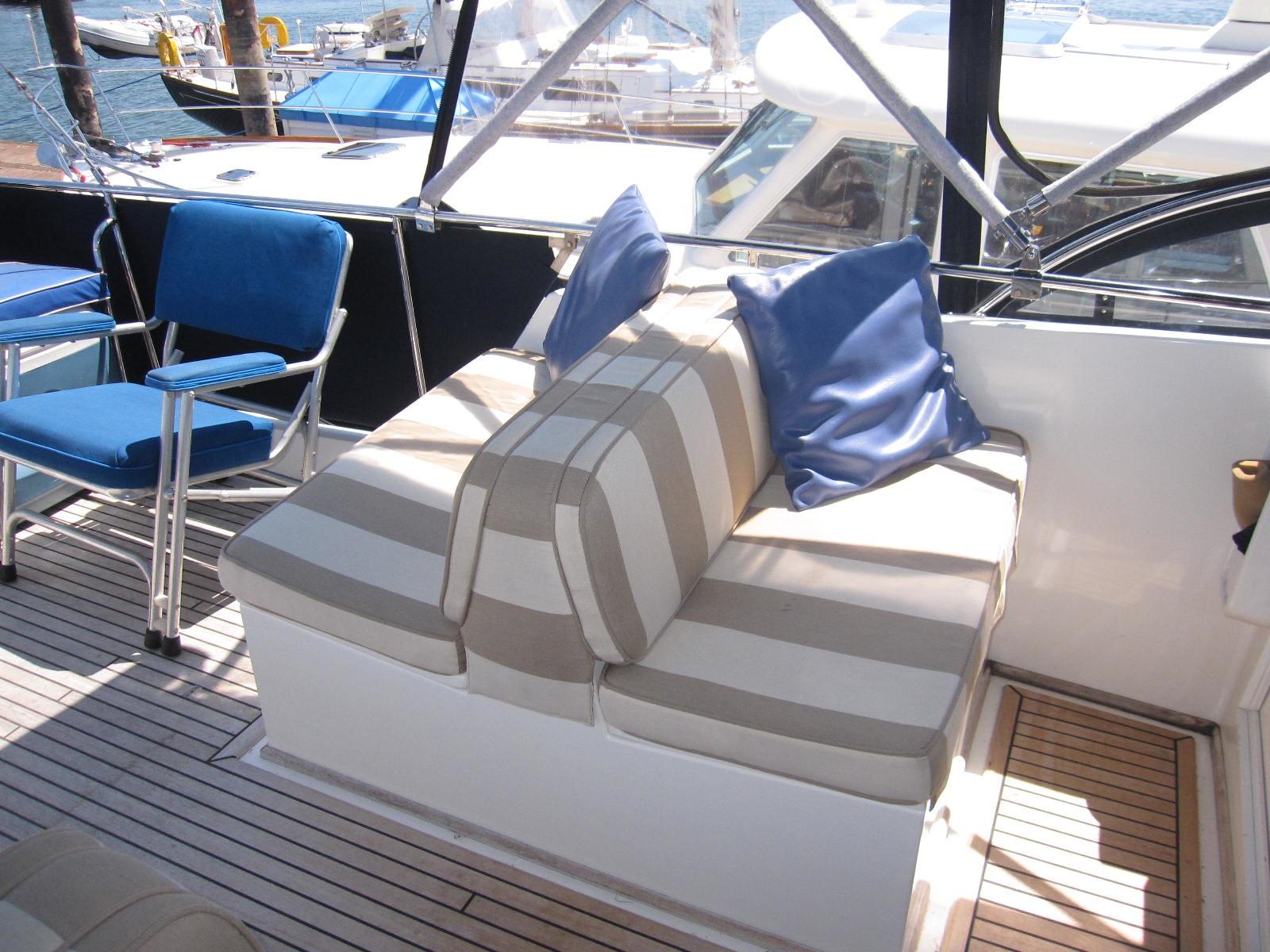 Blue canvas covers for the windshield, dinghy, hatches flybridge tableand settee