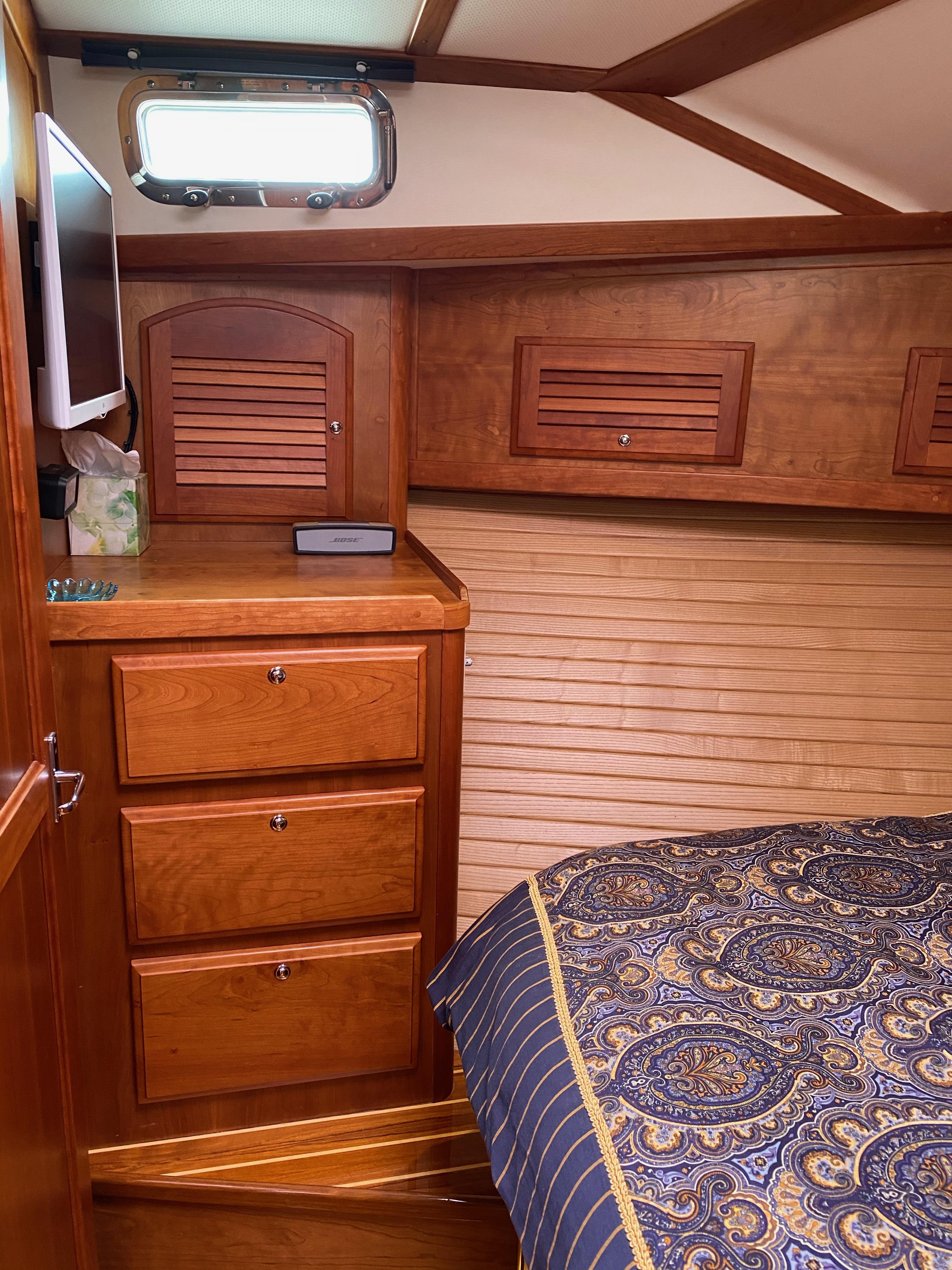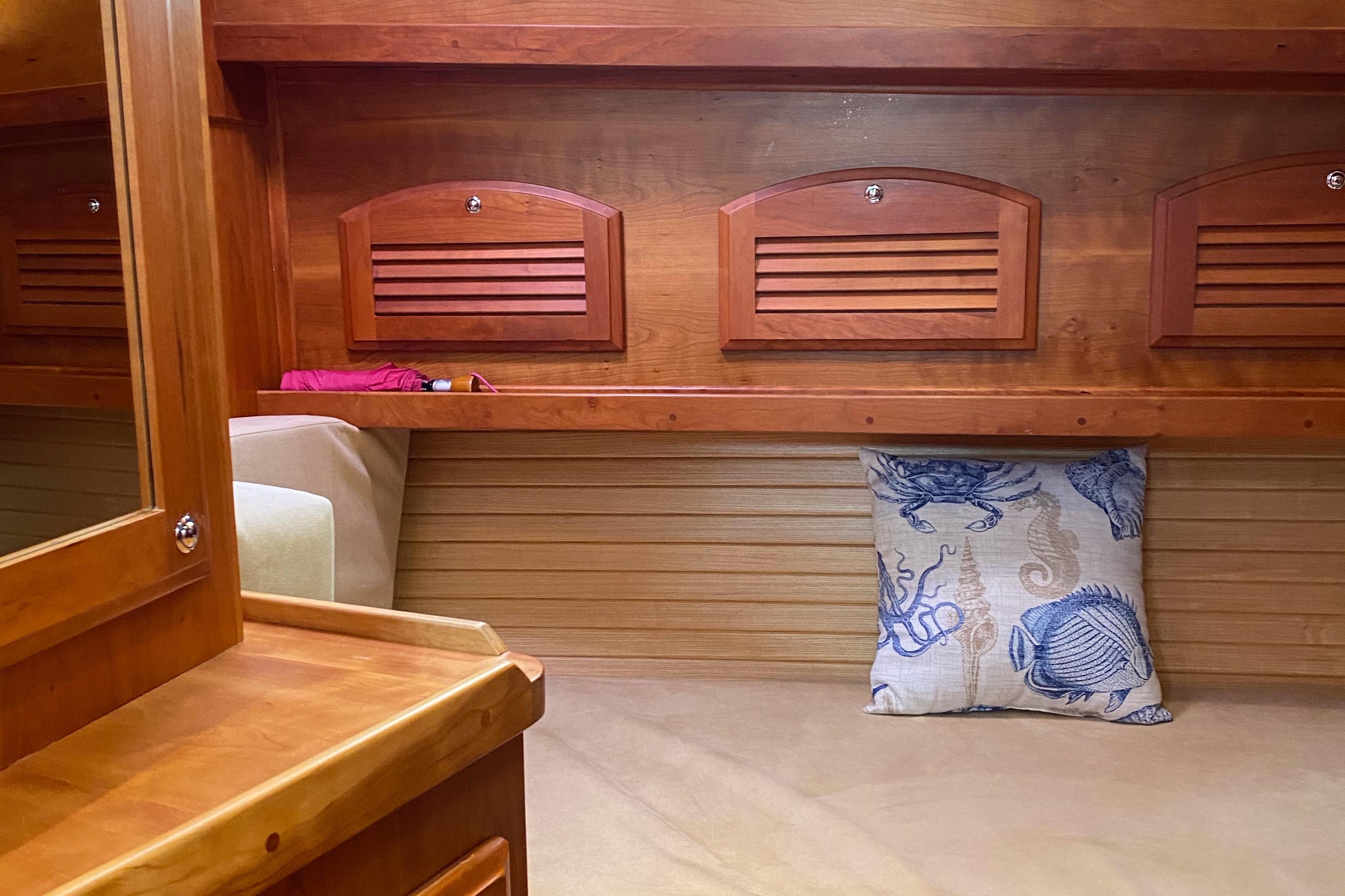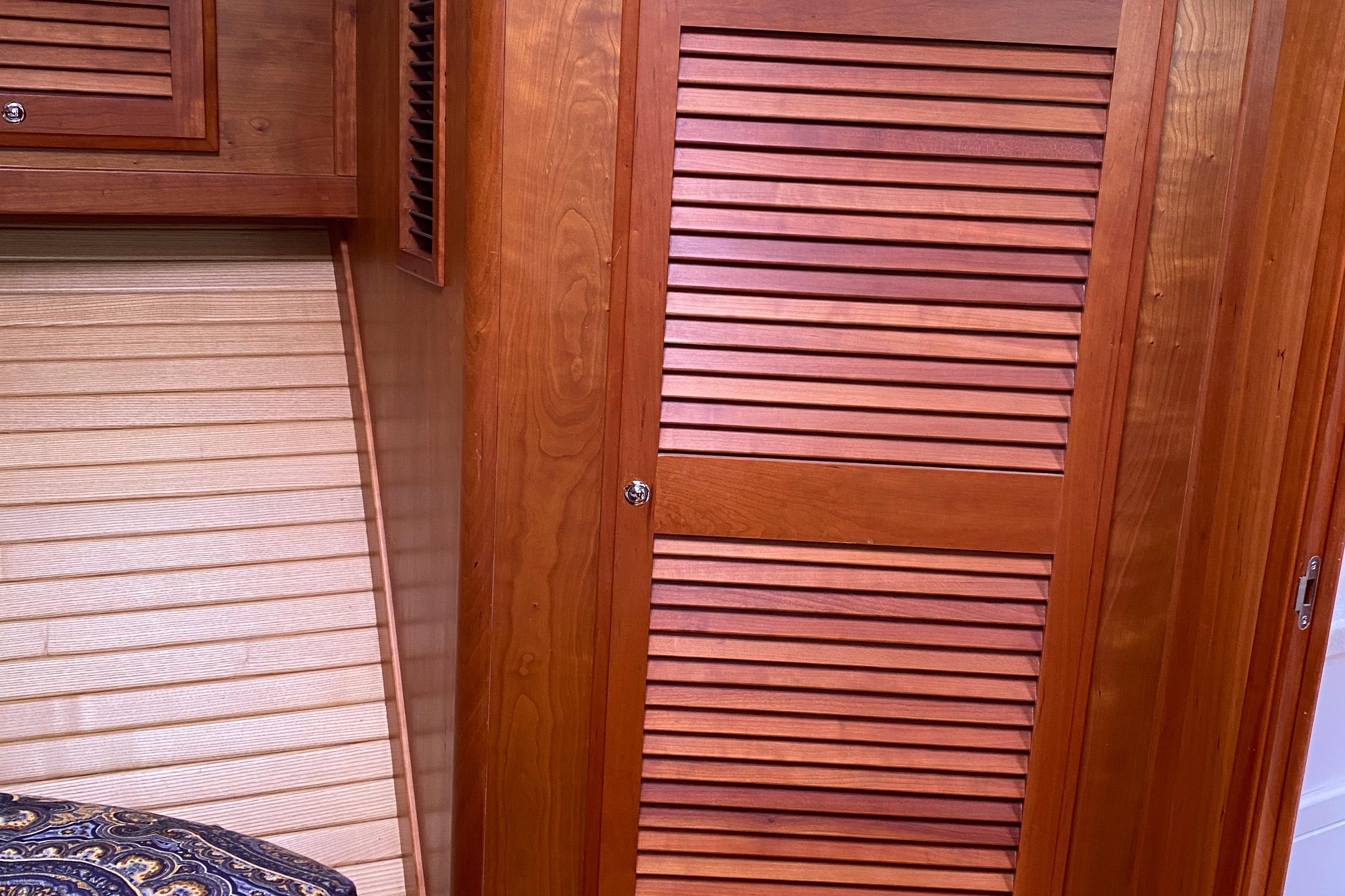 Storage lockers outboard and above berth. Hanging locker (cedar lined) with louvered door.