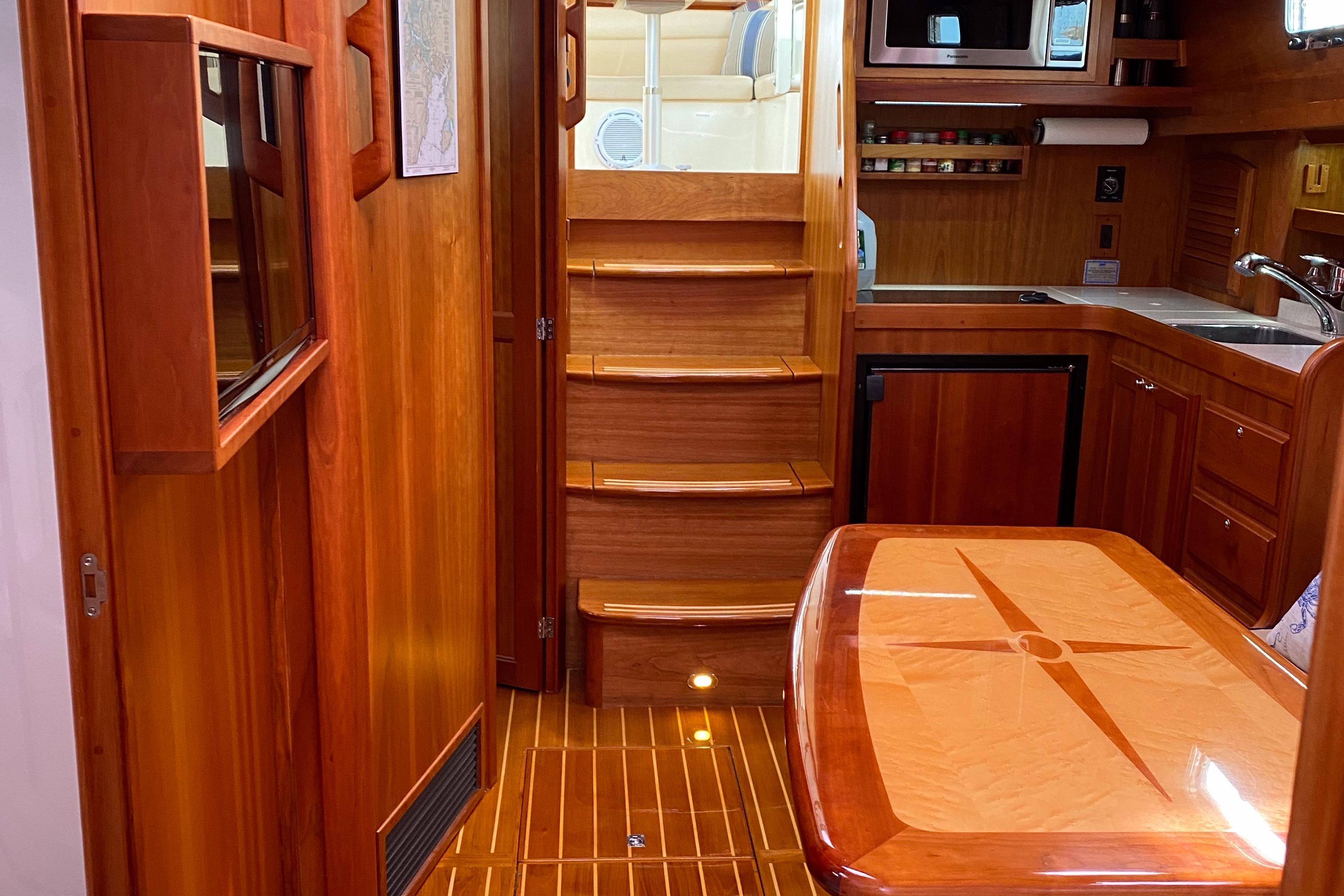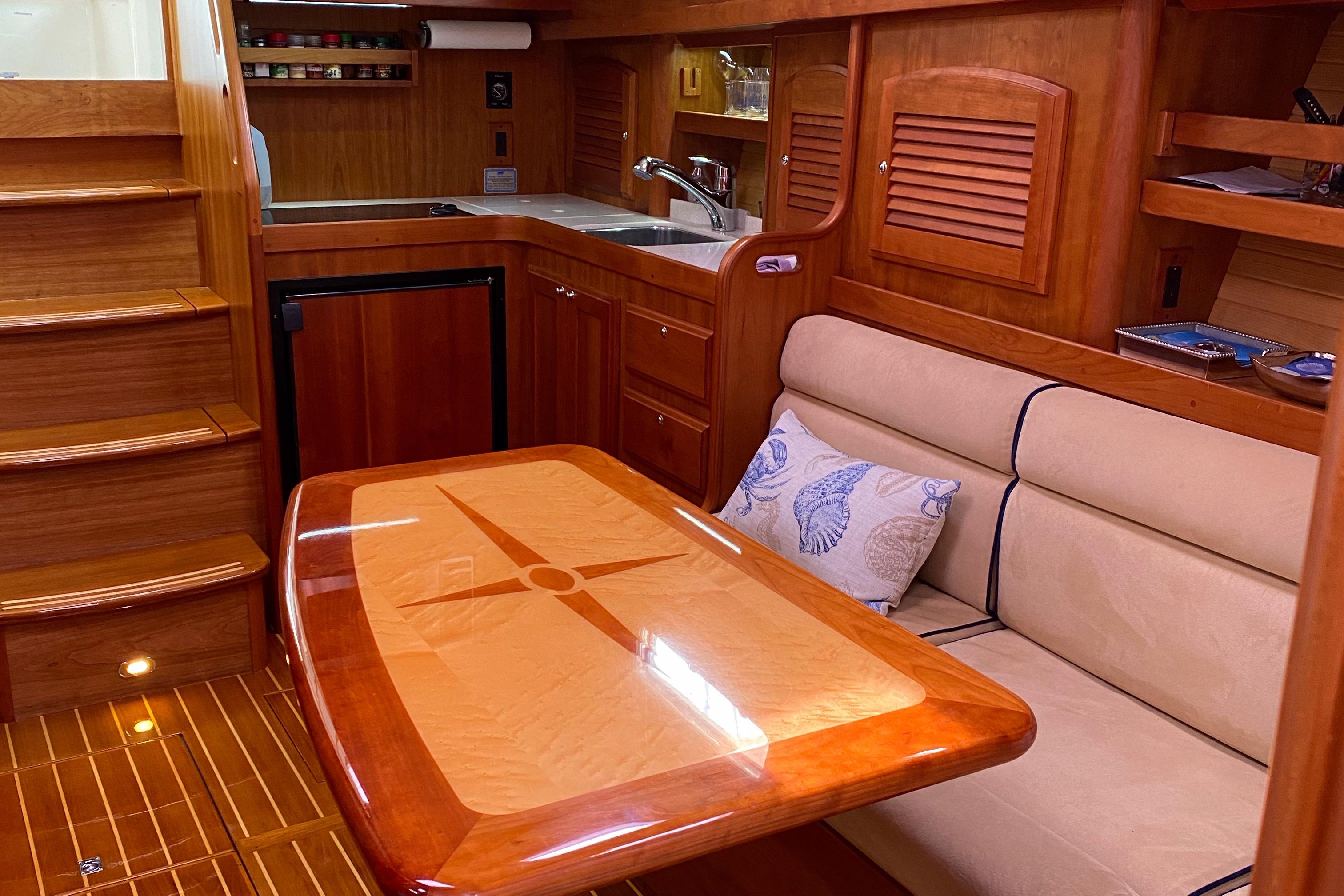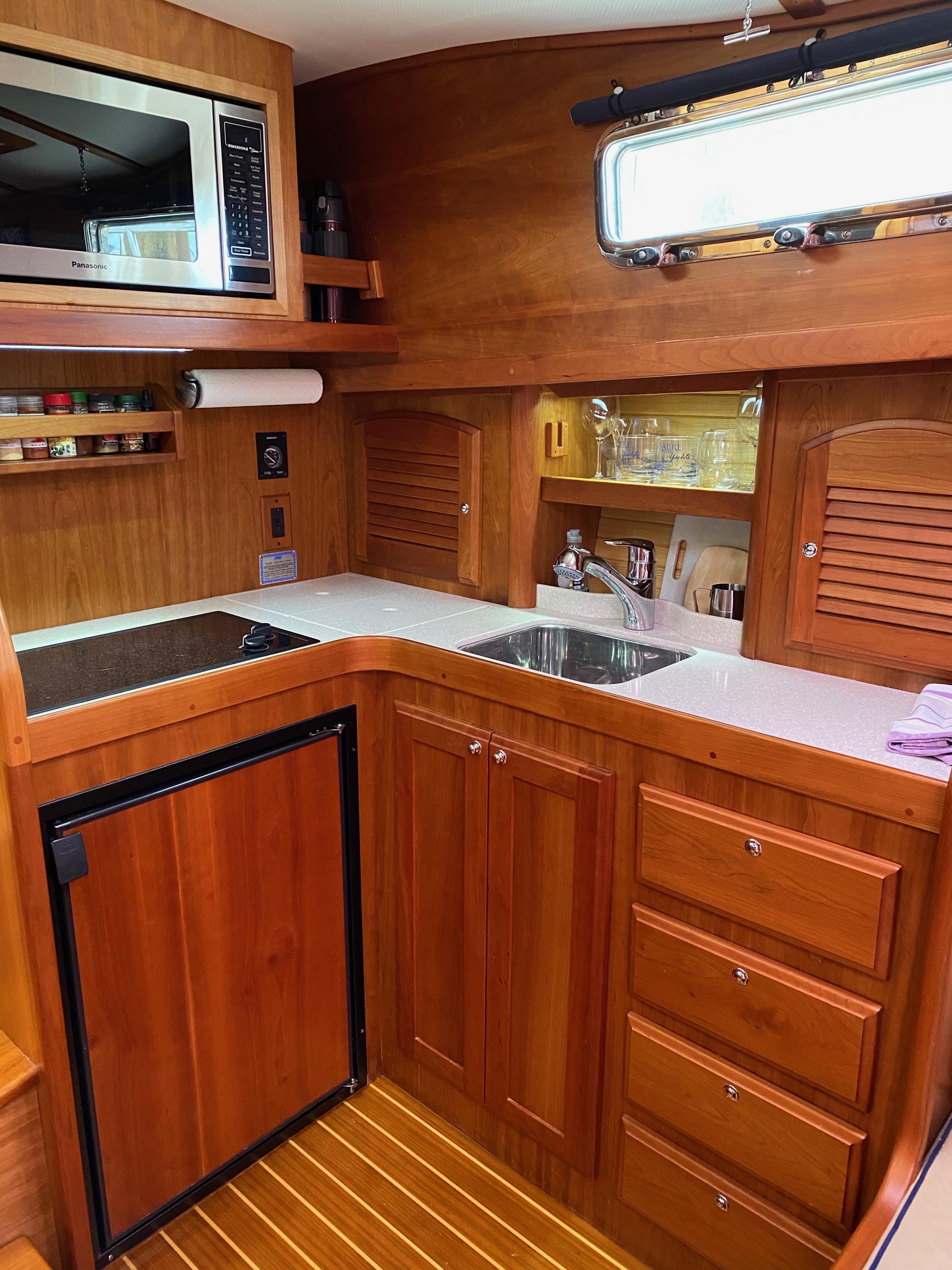 L-shaped galley to port.