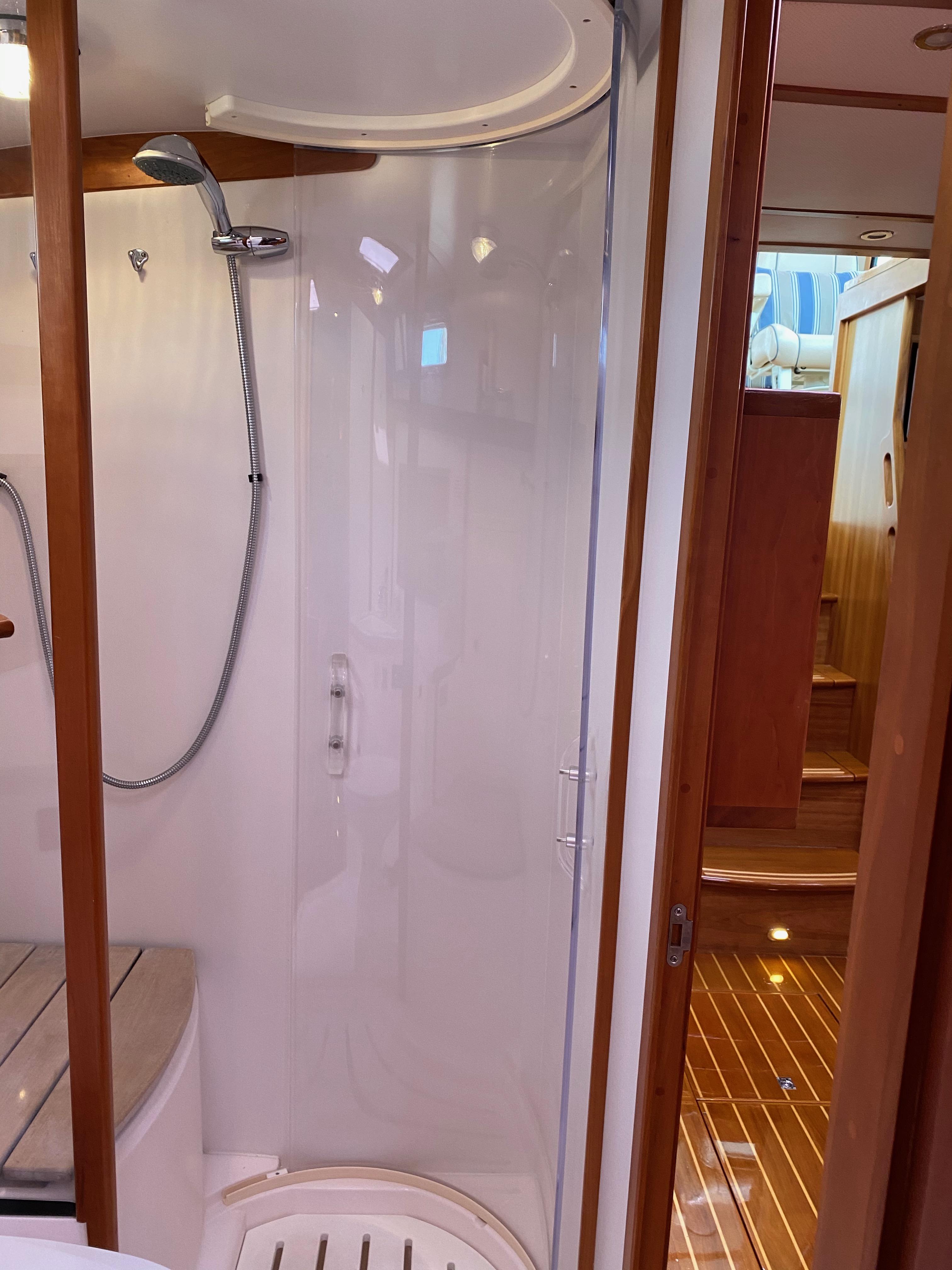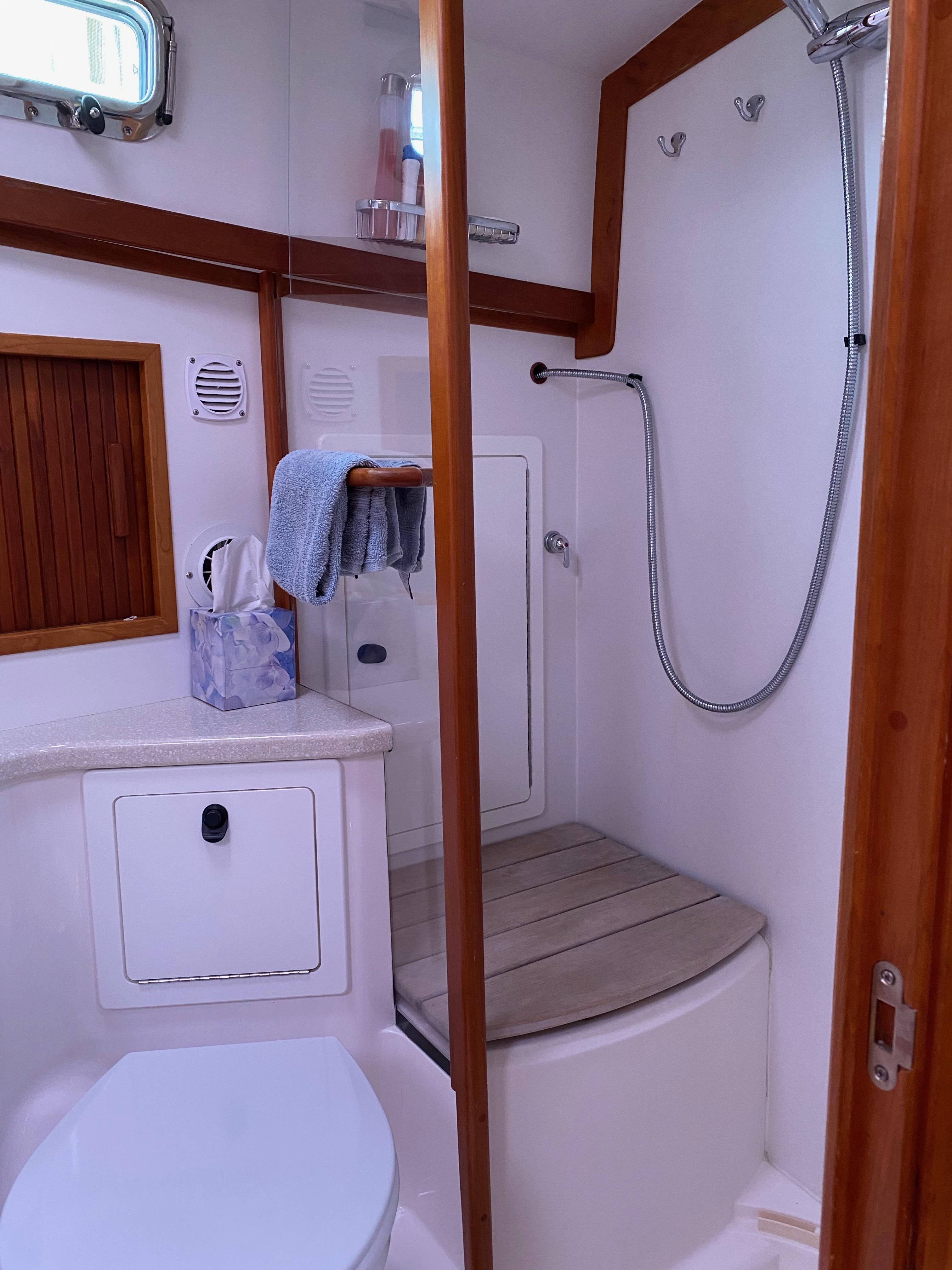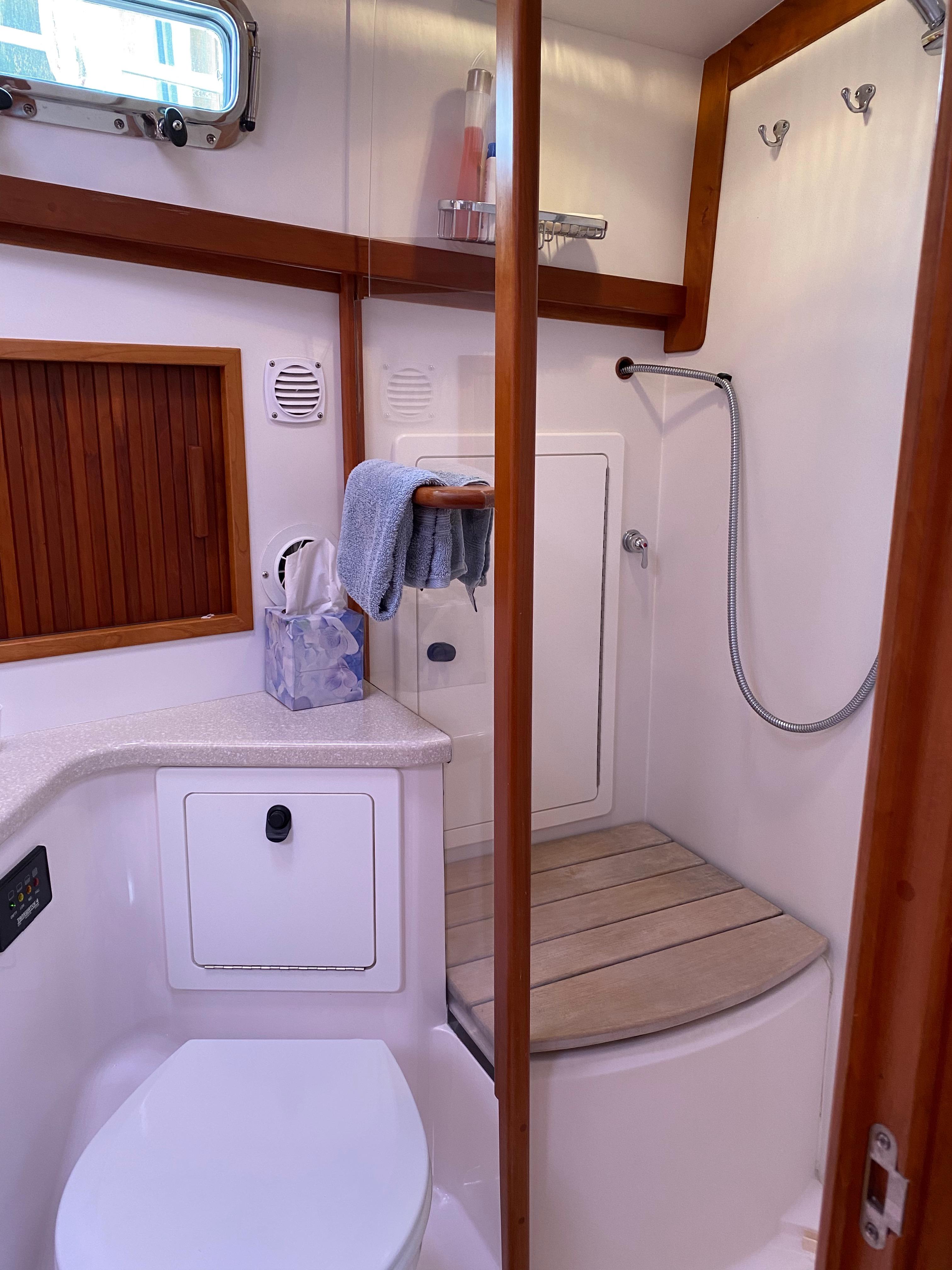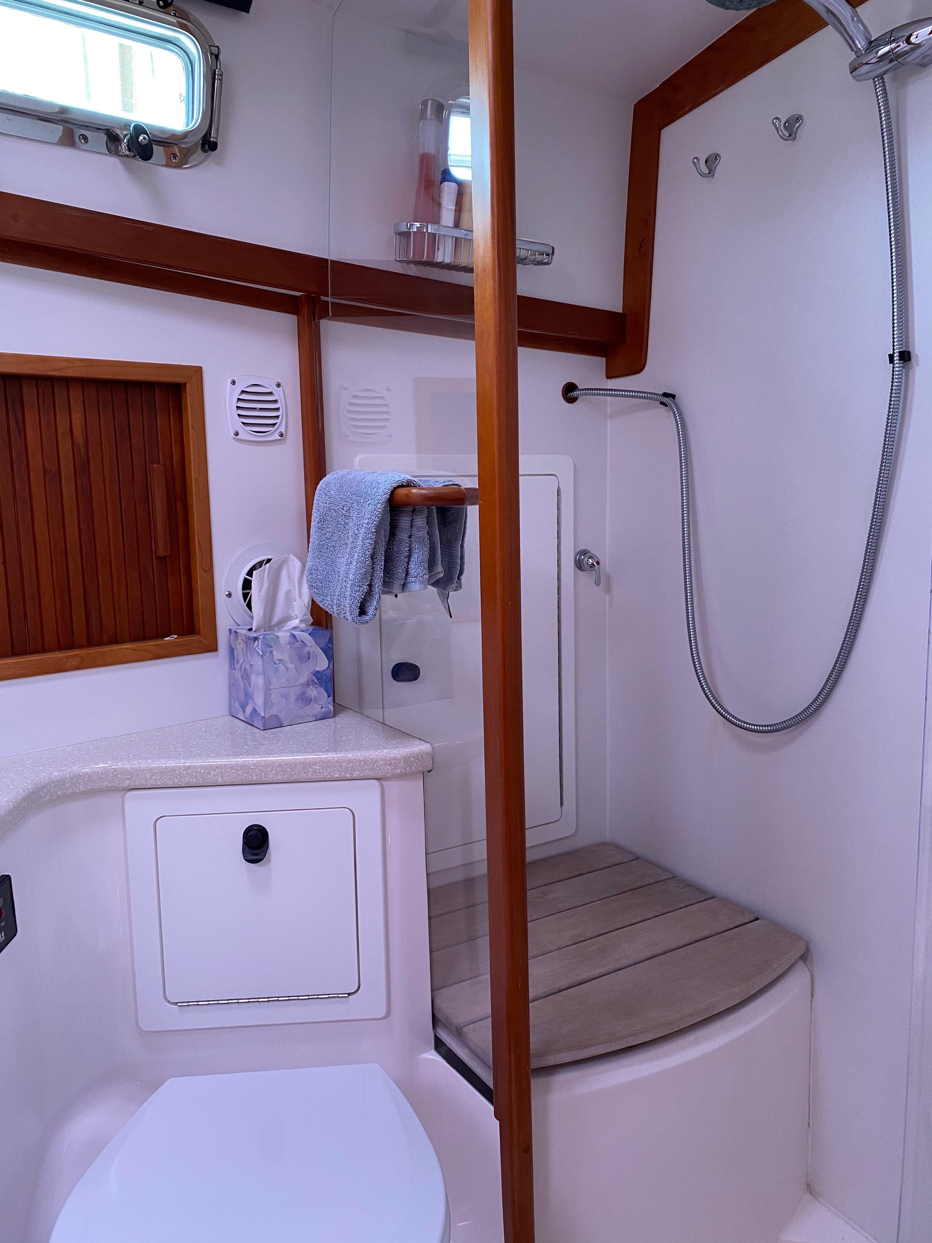 Shower seat and wet locker outboard.