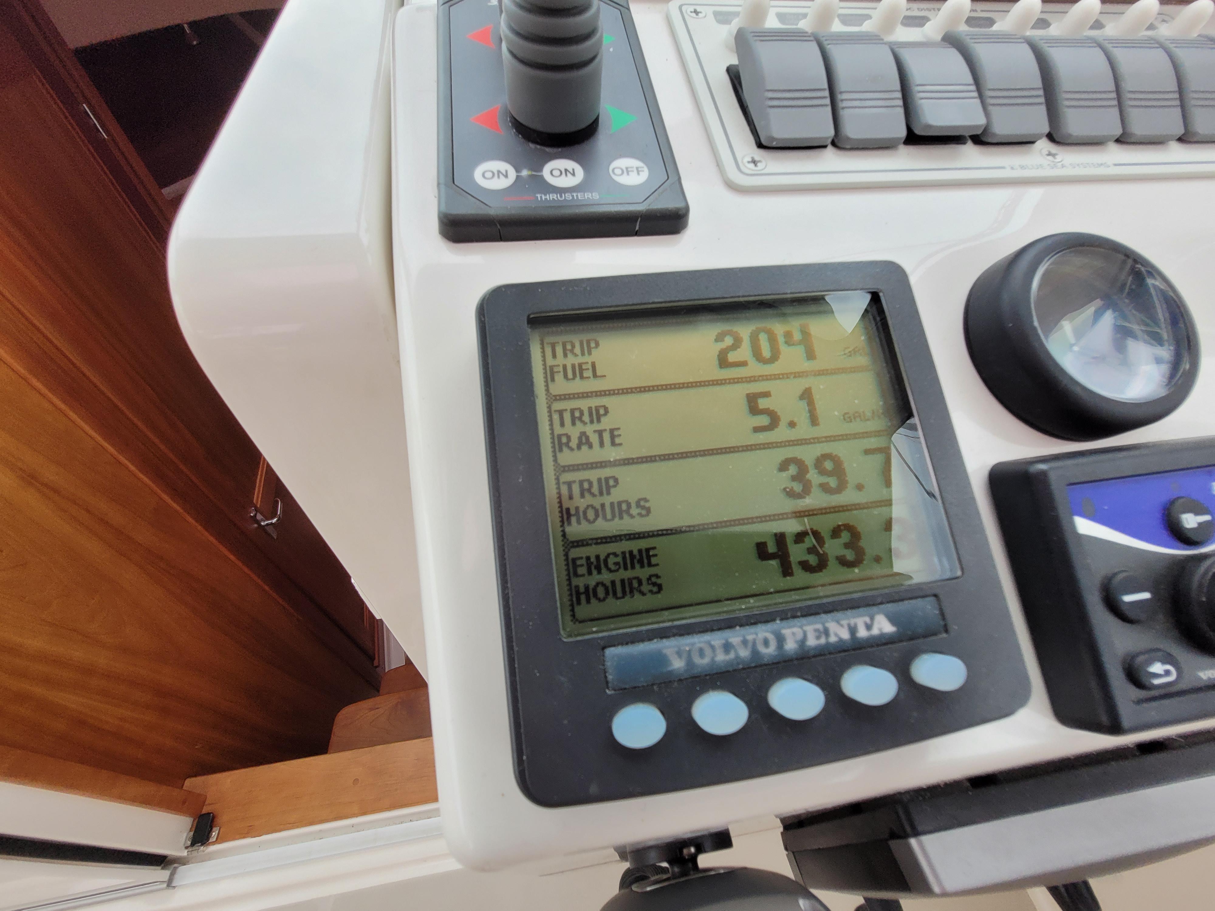 Equipment includes Yanmar 315hp, Dark Blue hull with White boot stripe, upgrade Ultraleather in helm deck and cabin, Stidd helm seat upgrade, helm deck trim package, bow and stern thrusters, anchor windlass, oil changing system, below deck air & heat, 1800 watt inverter, hardtop mast, Garmin 7212 touch screen multifunction display, Garmin GMR18 HD 4kW radar, Garmin VHF100 radio Jabsco remote search light, Airmar bronze depth transducer, Stamoid cockpit cover and more.