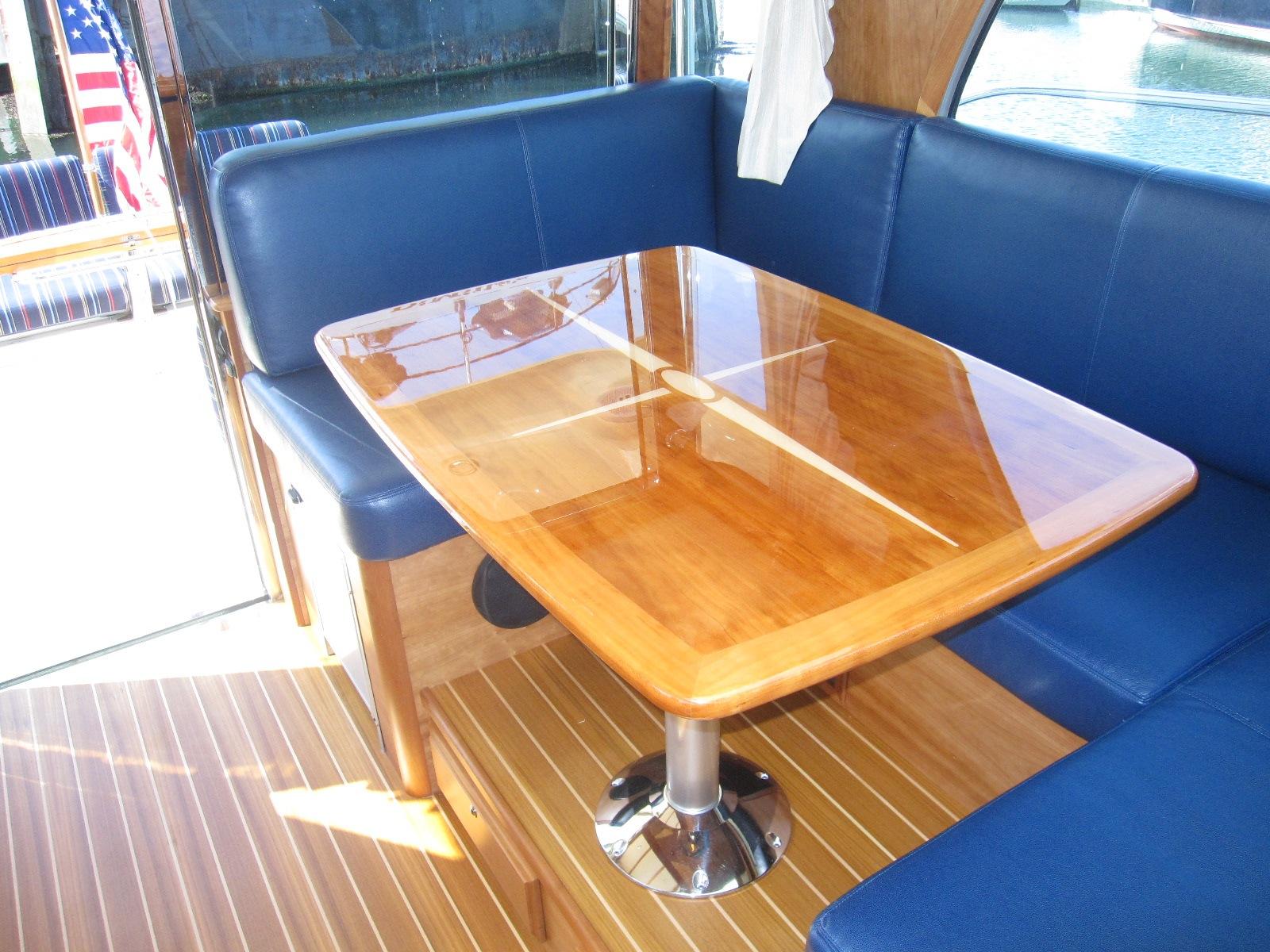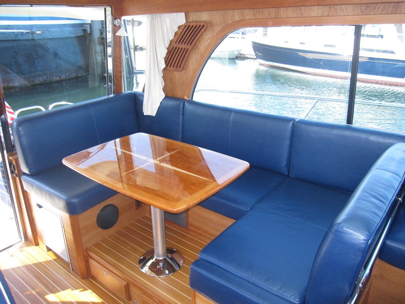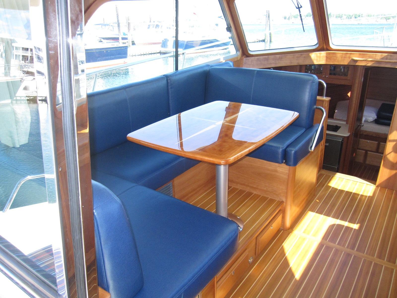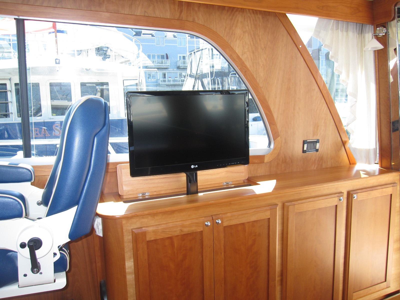 In her main salon, a large, U-shaped settee with fold over table will seat up to three couples, while the forward end of the settee can be oriented forward to provide a comfortable perch when underway. To starboard, aft of the Stidd helm seat, is a long cabinet housing an LED television on an electric lift storage and compartments for the owners gear.
