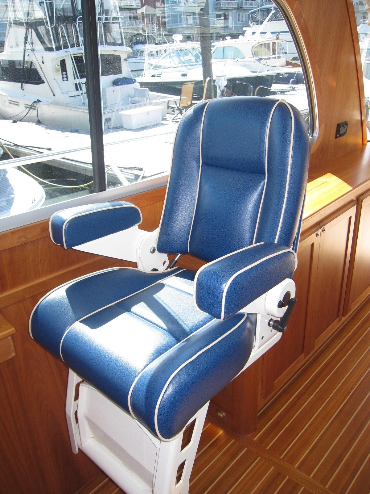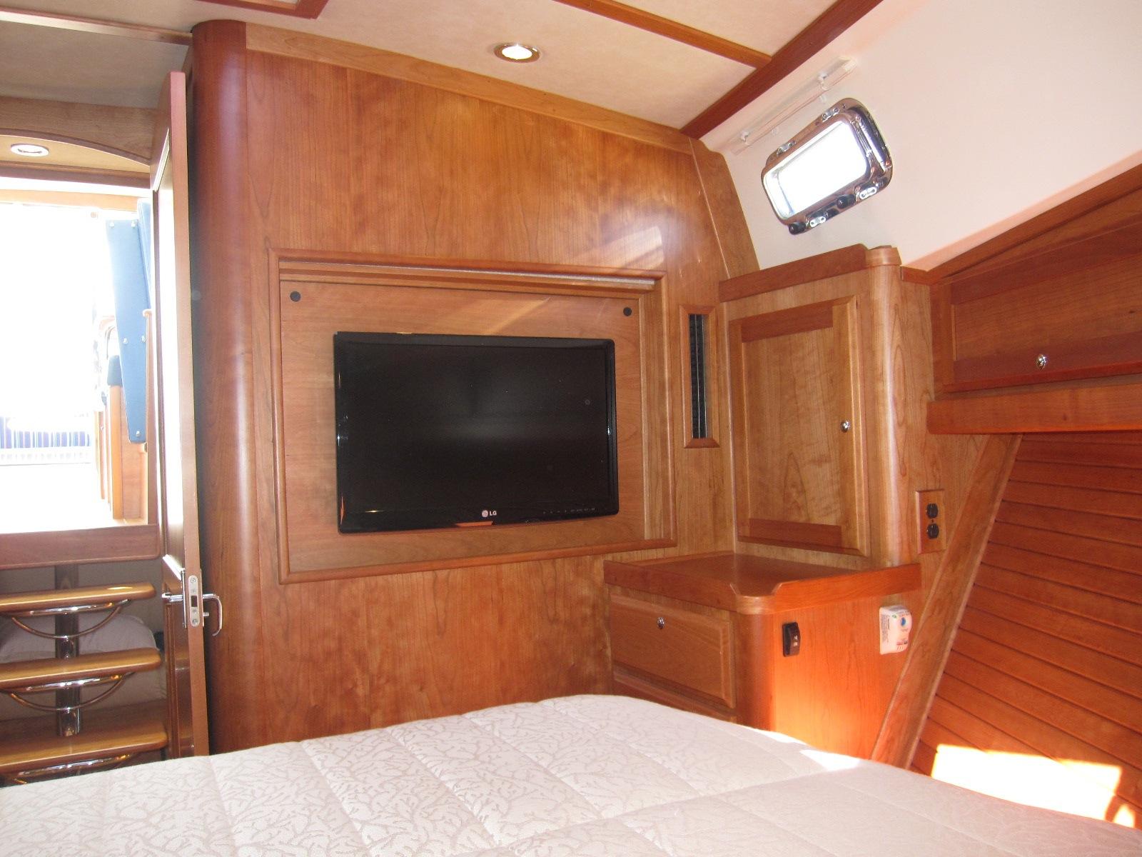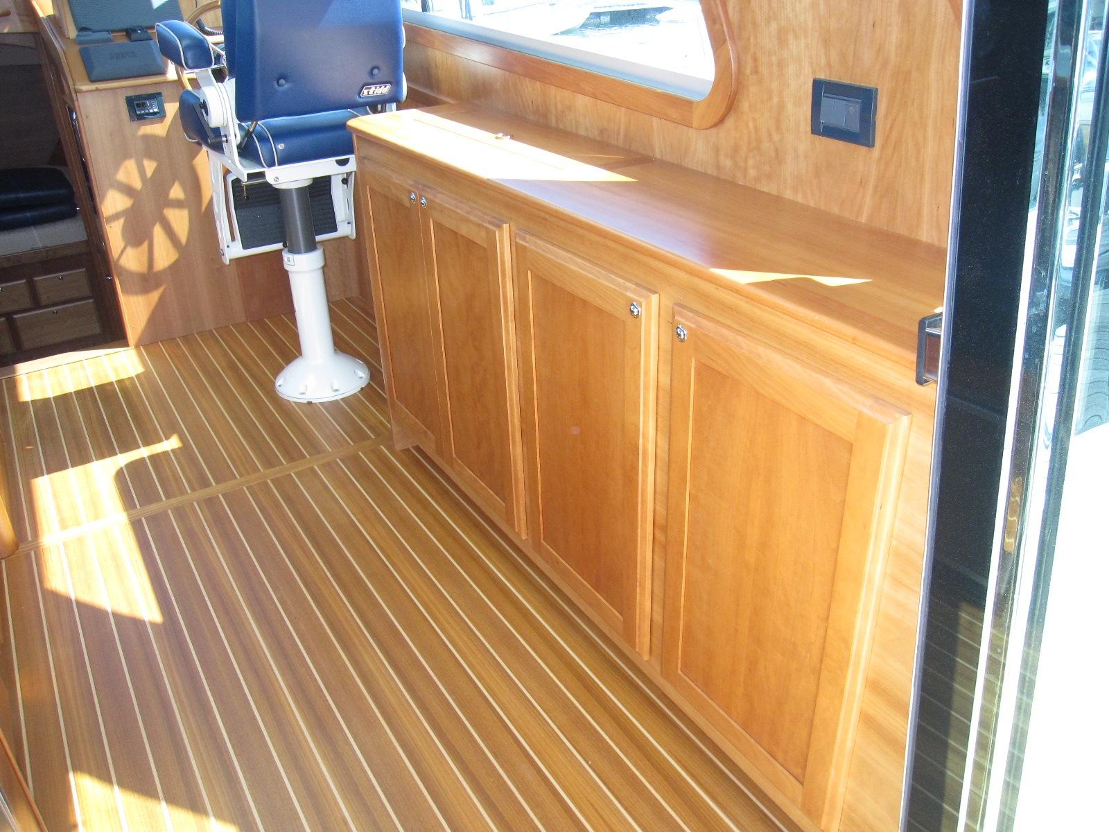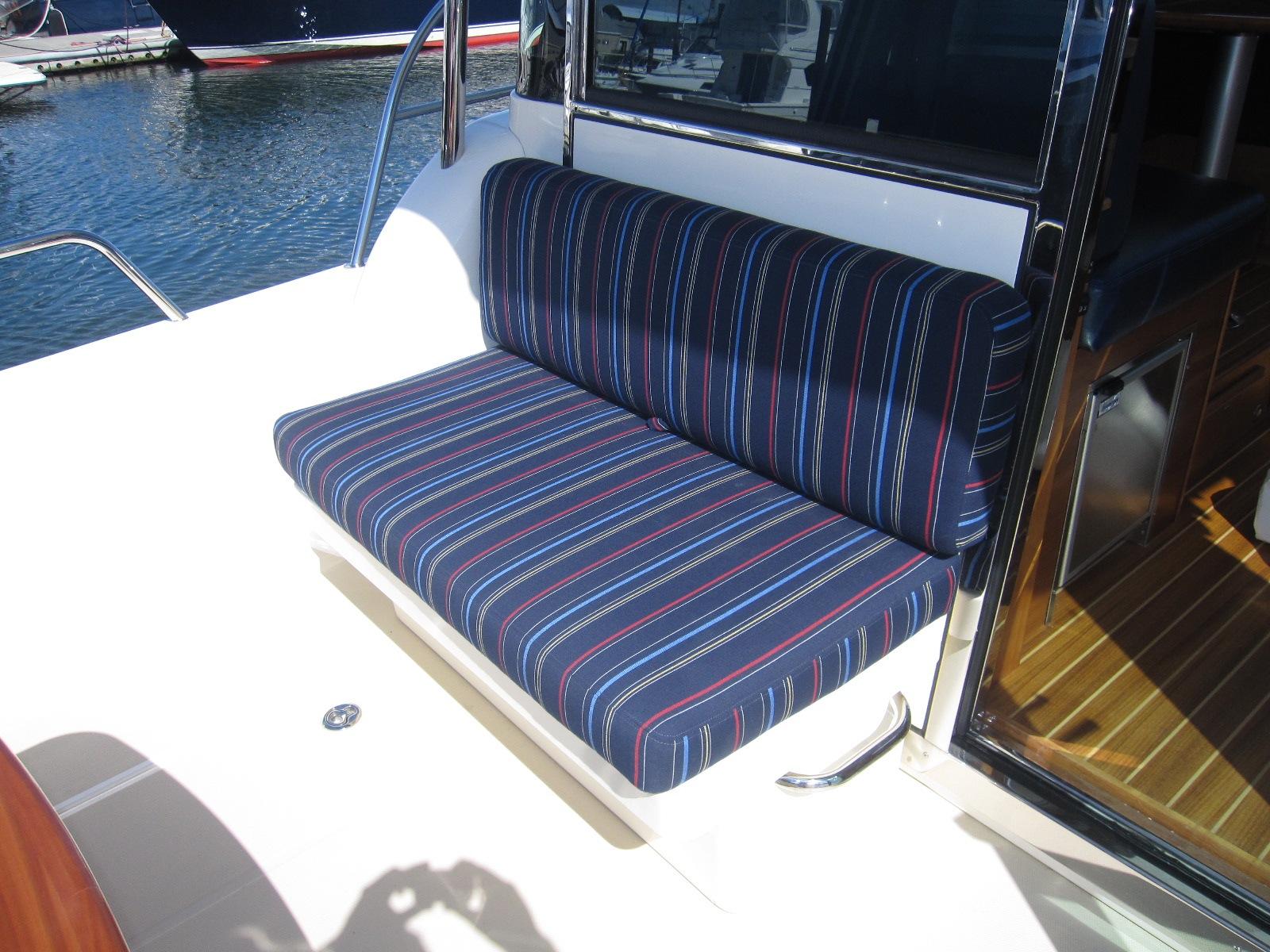 In her main salon, a large, U-shaped settee with fold over table will seat up to three couples, while the forward end of the settee can be oriented forward to provide a comfortable perch when underway. To starboard, aft of the Stidd helm seat, is a long cabinet housing an LED television on an electric lift storage and compartments for the owners gear.