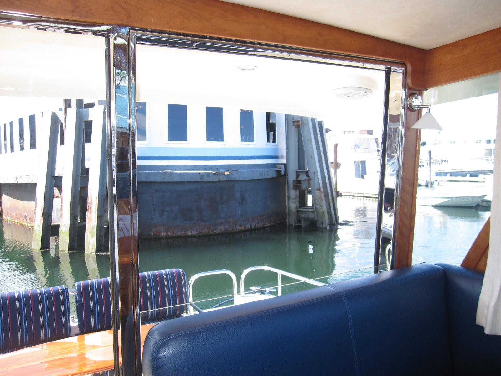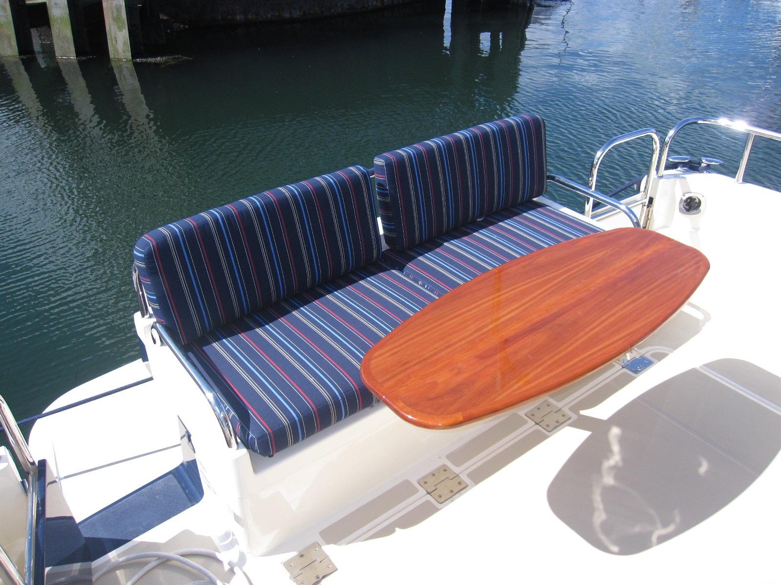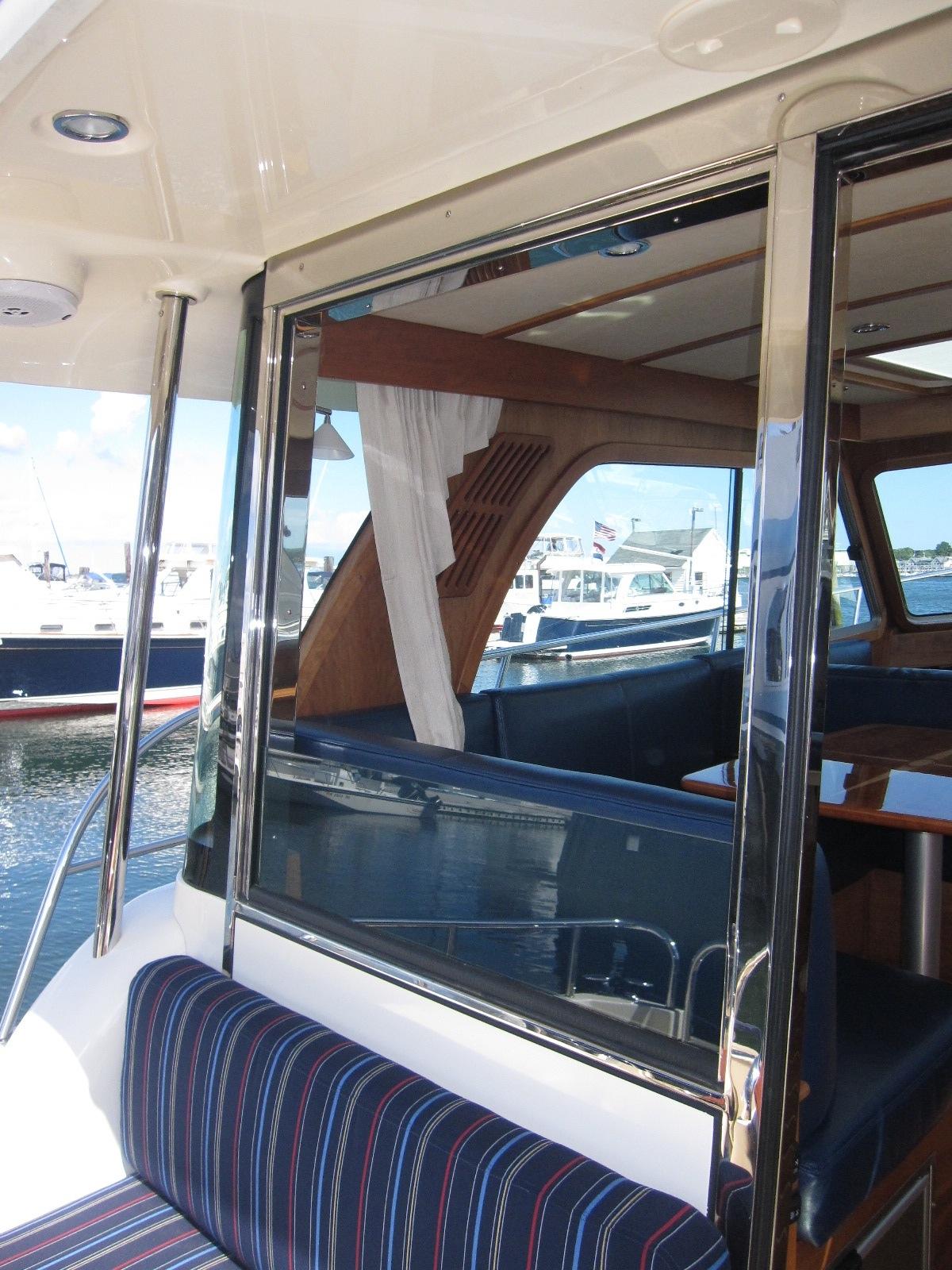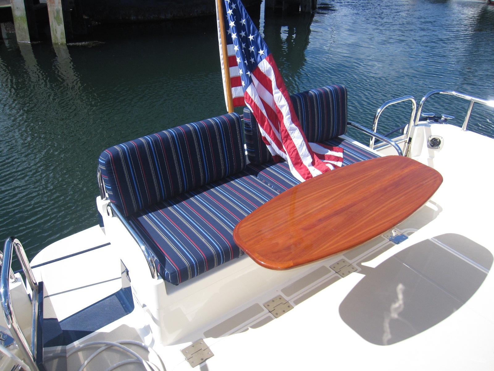 In her main salon, a large, U-shaped settee with fold over table will seat up to three couples, while the forward end of the settee can be oriented forward to provide a comfortable perch when underway. To starboard, aft of the Stidd helm seat, is a long cabinet housing an LED television on an electric lift storage and compartments for the owners gear.