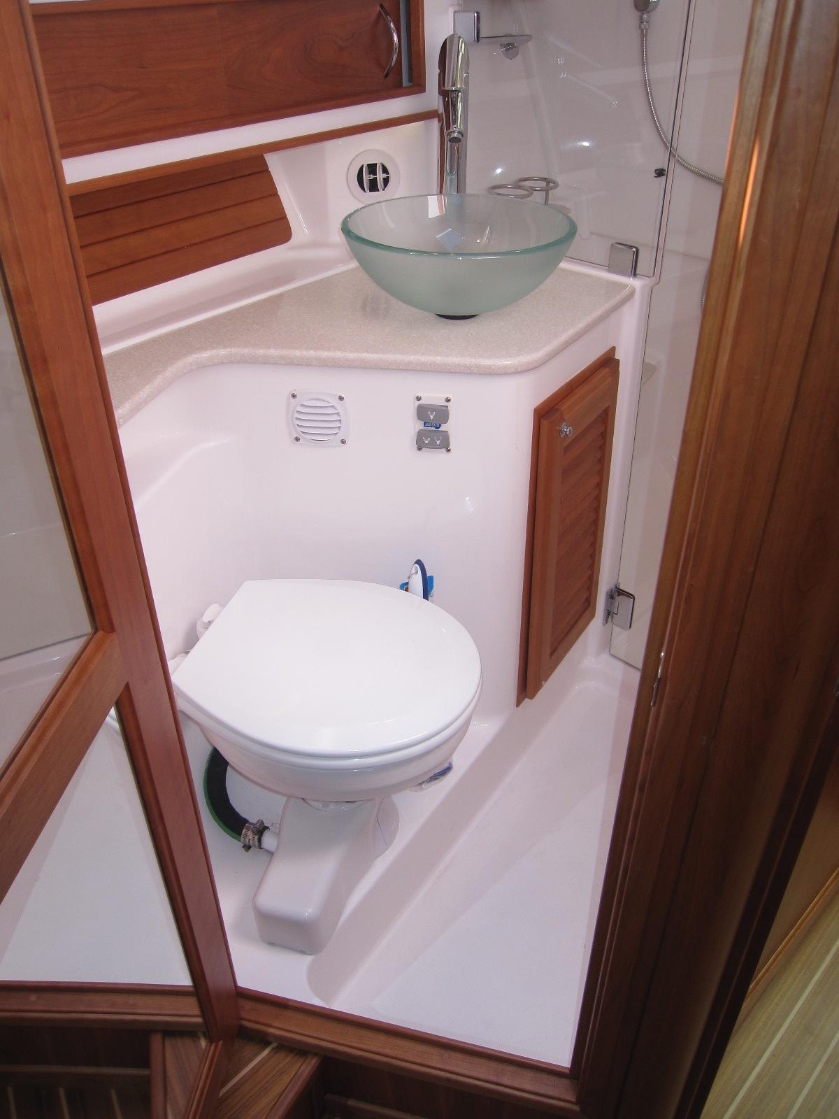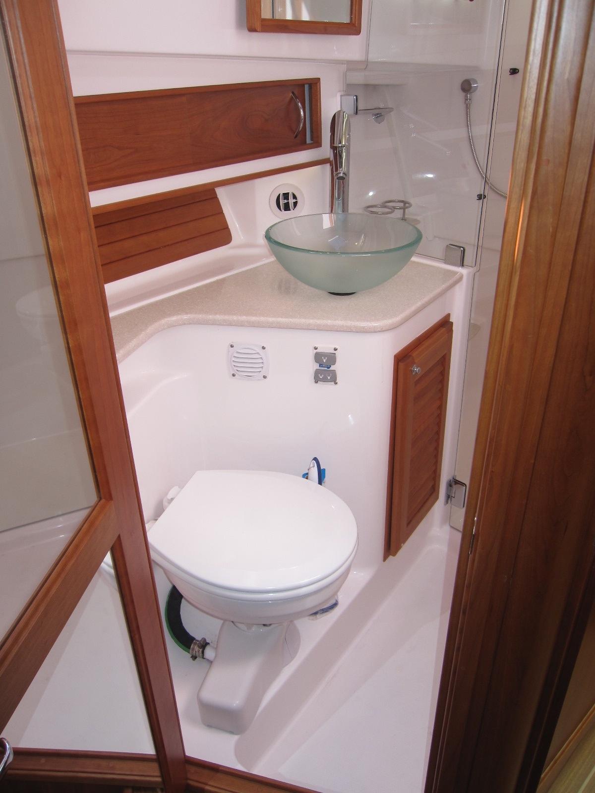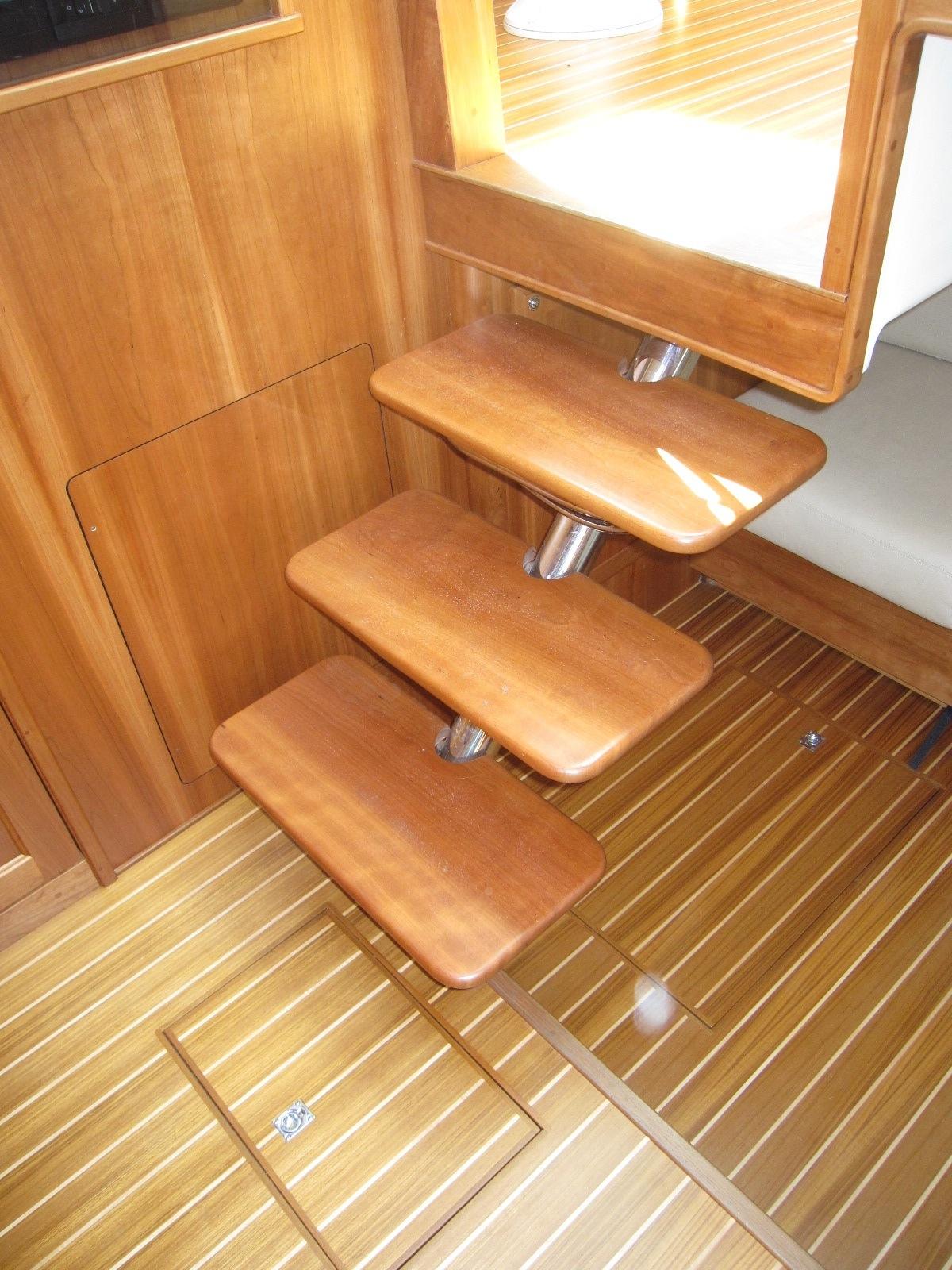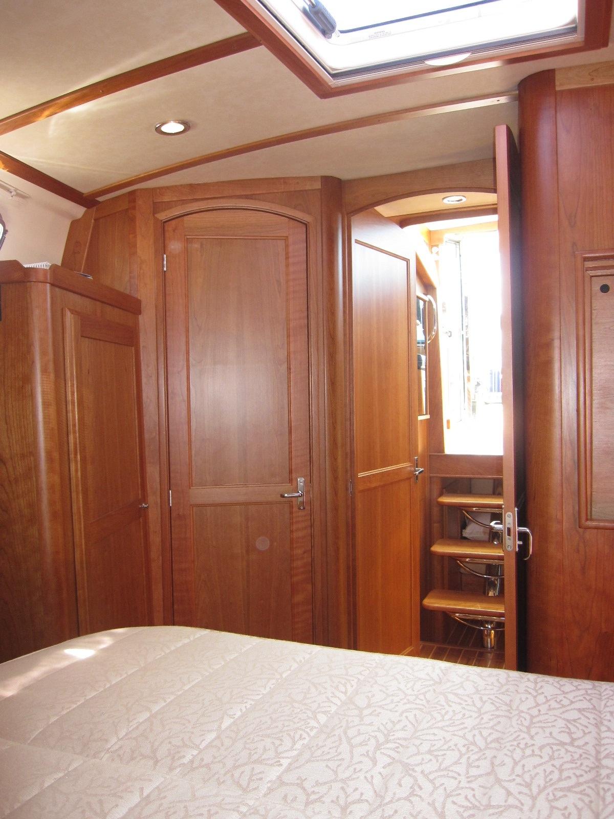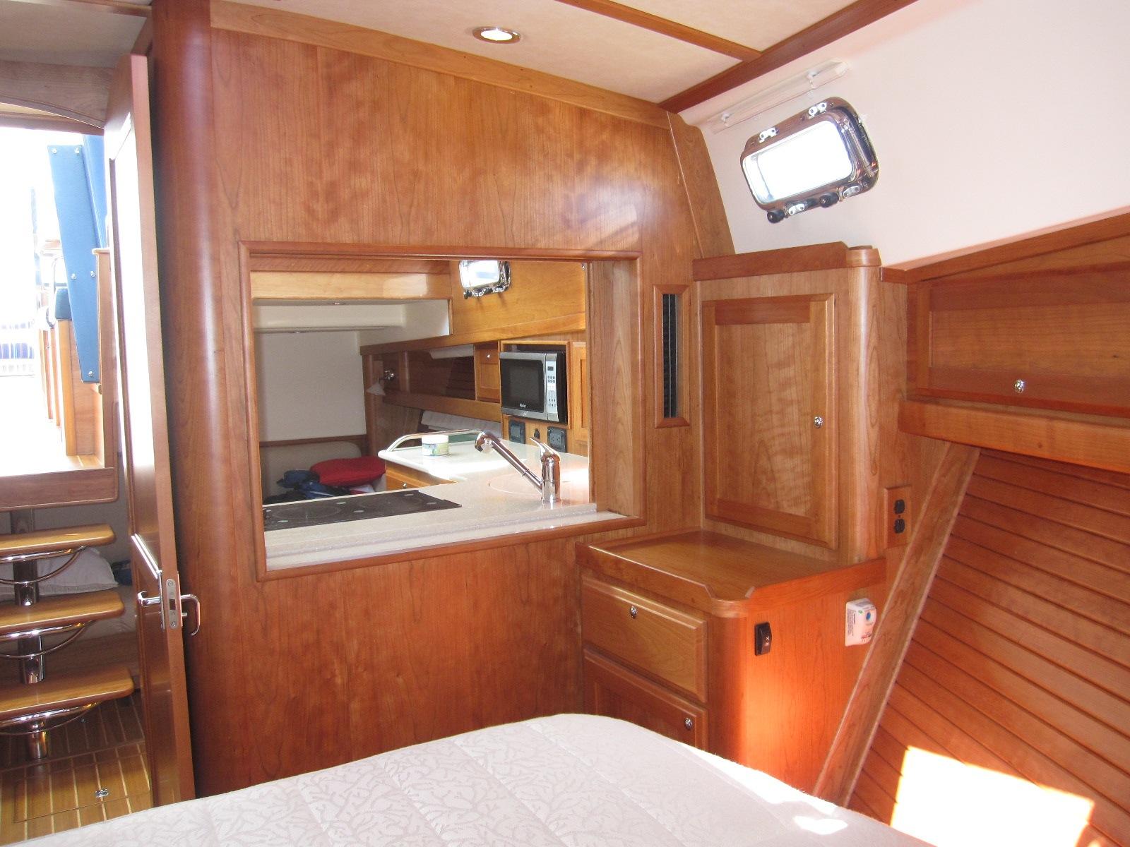 The forward end of the salon opens to the galley below. Communication from the galley to the salon is fluid. A large owner's cabin forward has an island berth and ample storage for long range crusing as well as a private head with stall shower. Below the helm deck and to port, an L-settee converts to second sleeping quarters with privacy curtain.