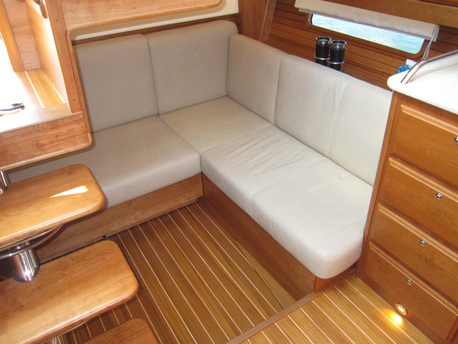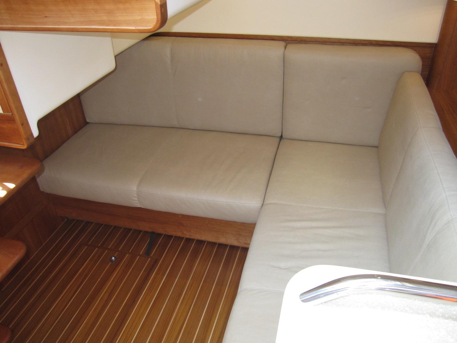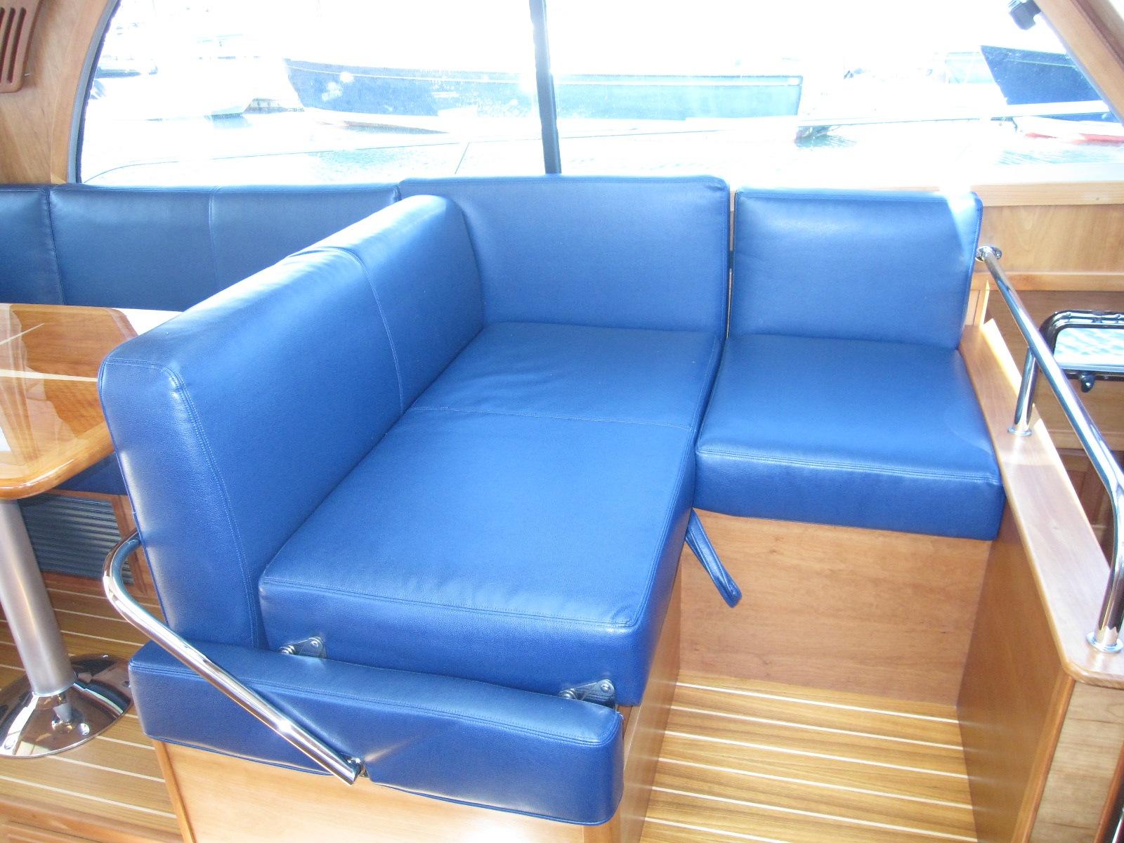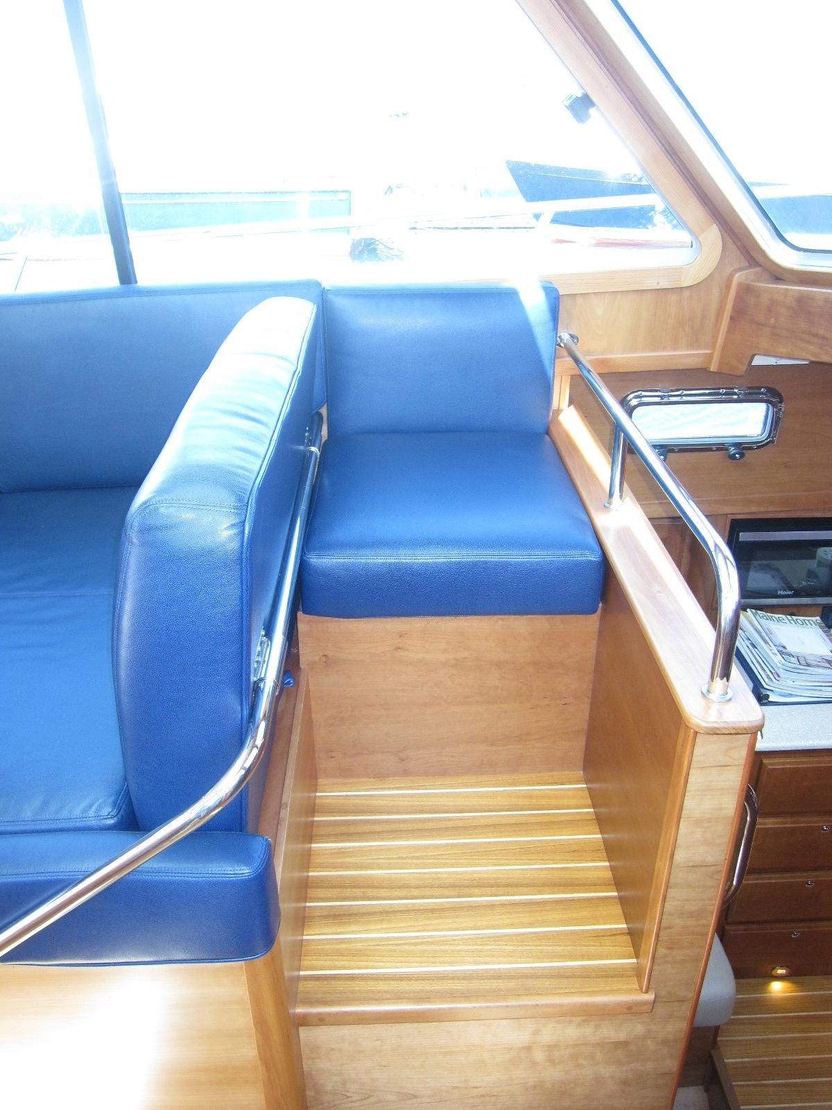 Mates L-shaped settee forward, open to galley with stainless steel hand rail.