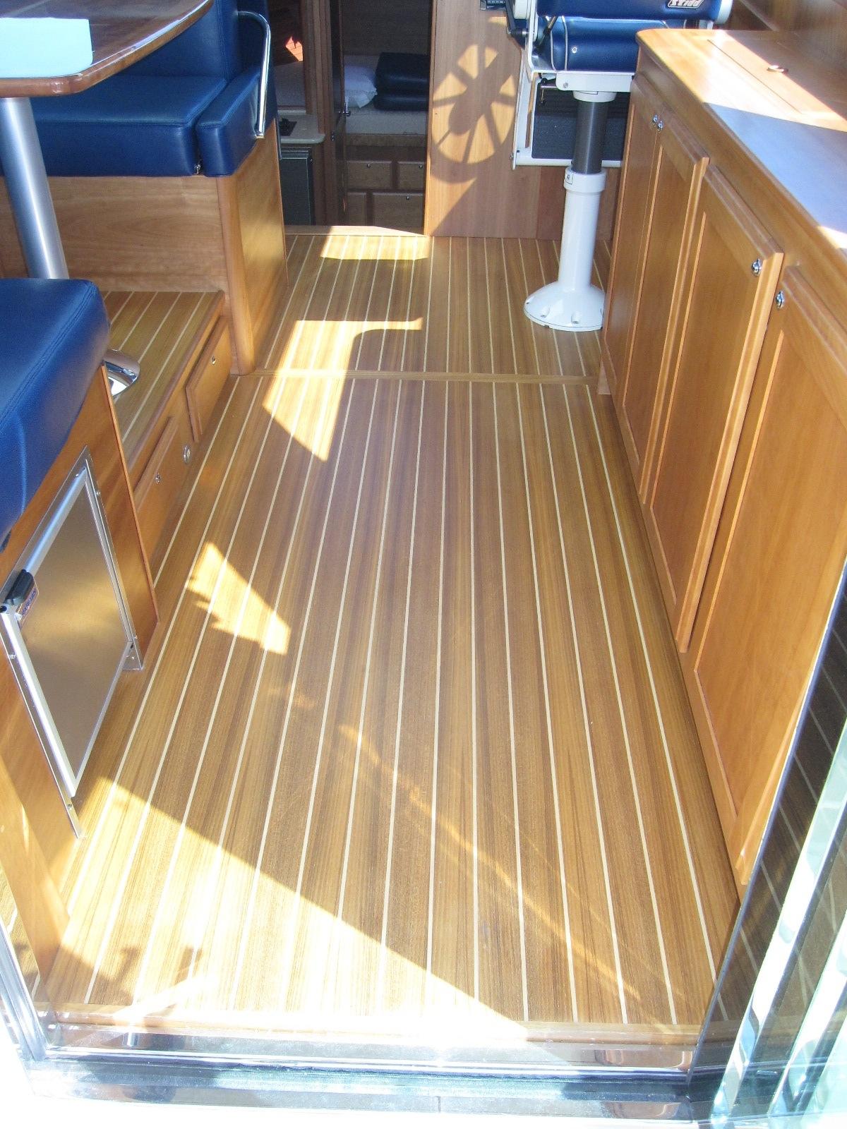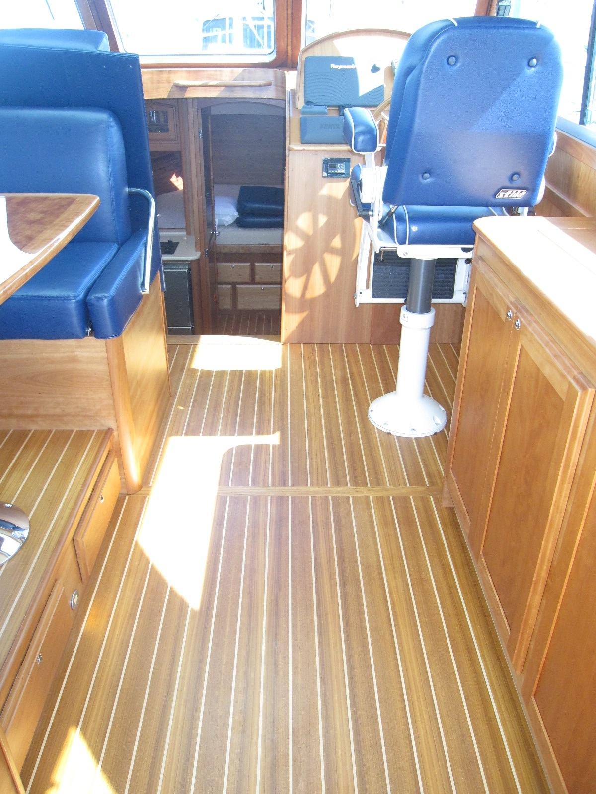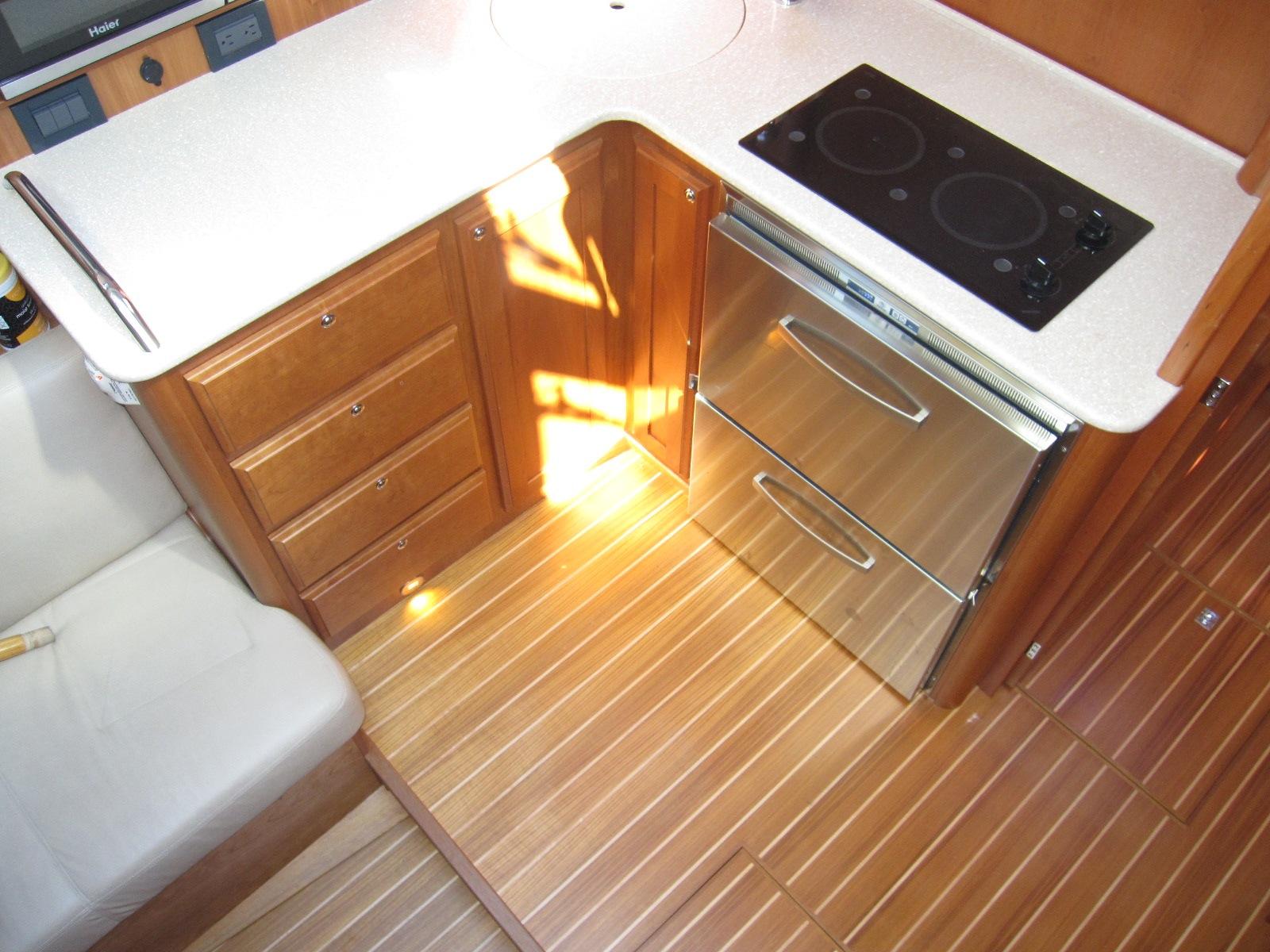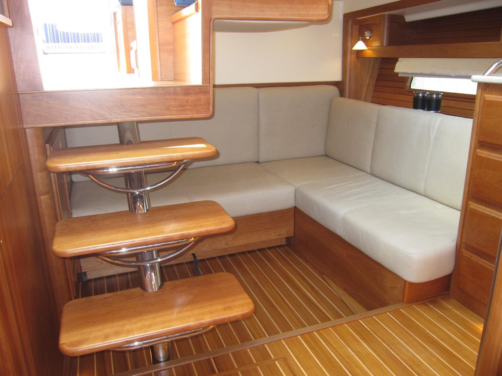 Mates L-shaped settee forward, open to galley with stainless steel hand rail.