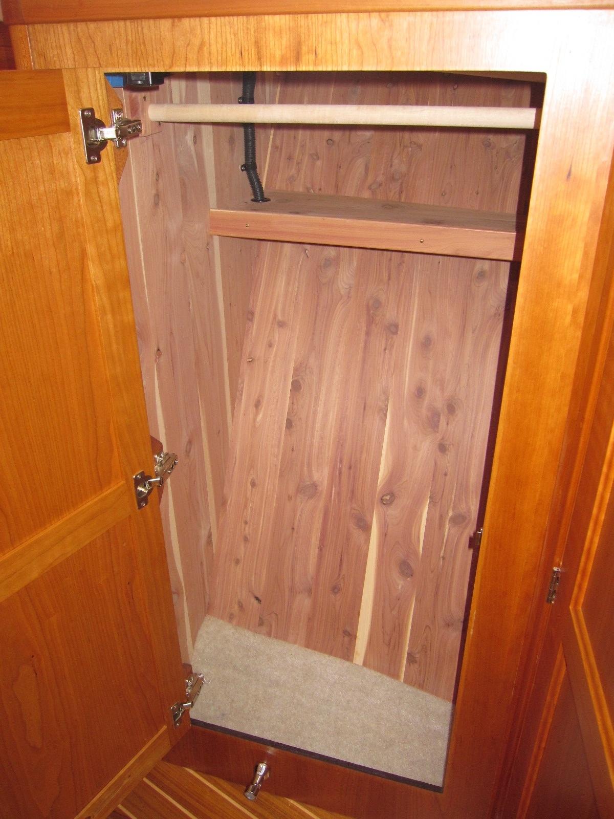 Large Hanging Locker to starboard, cedar lined with shelf and hangar pole. Open shelf above. Louvered door.