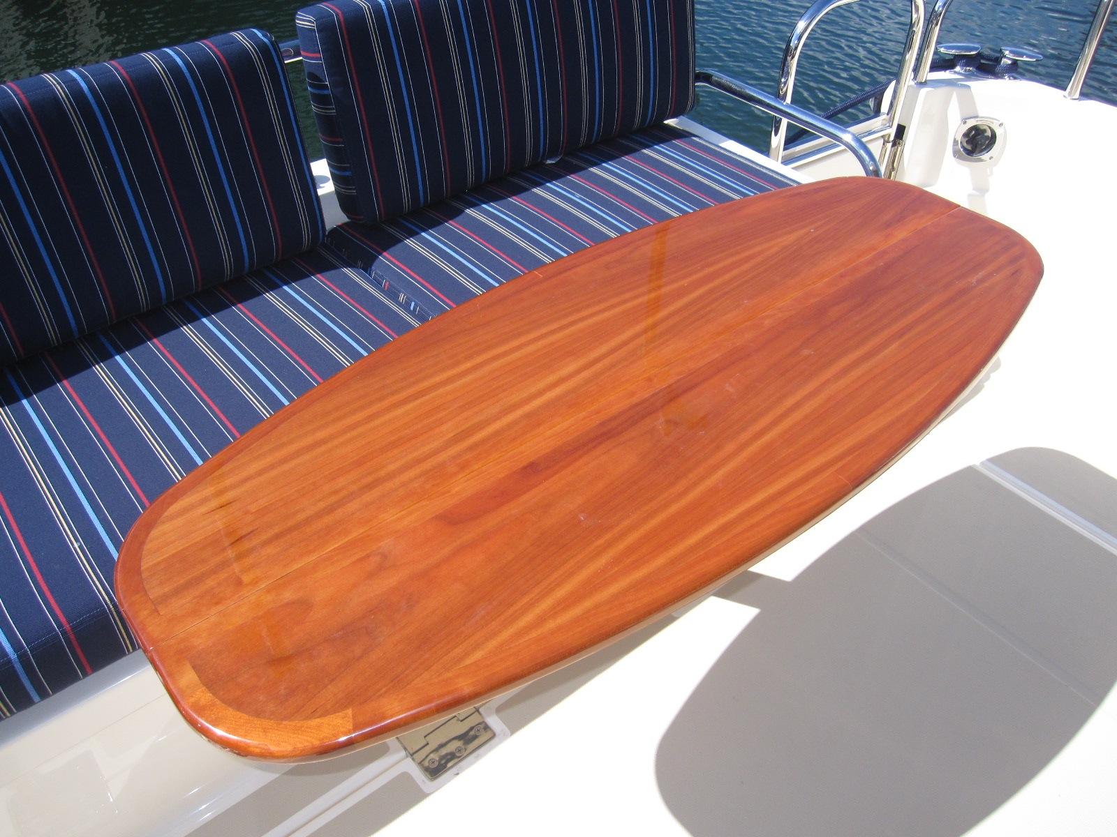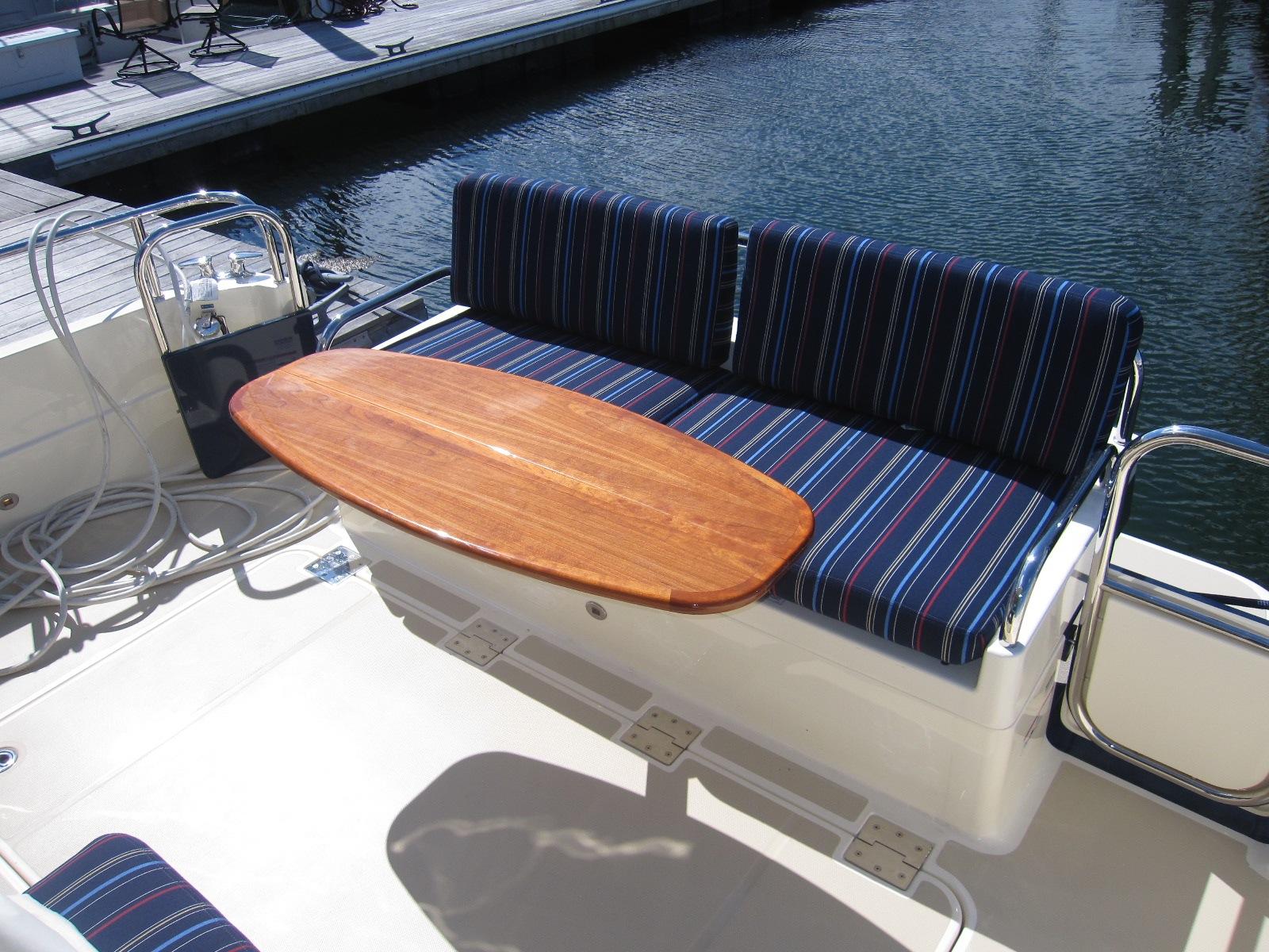Elevated "U" settee to port with fold over table. Converts to double berth. Storage under
