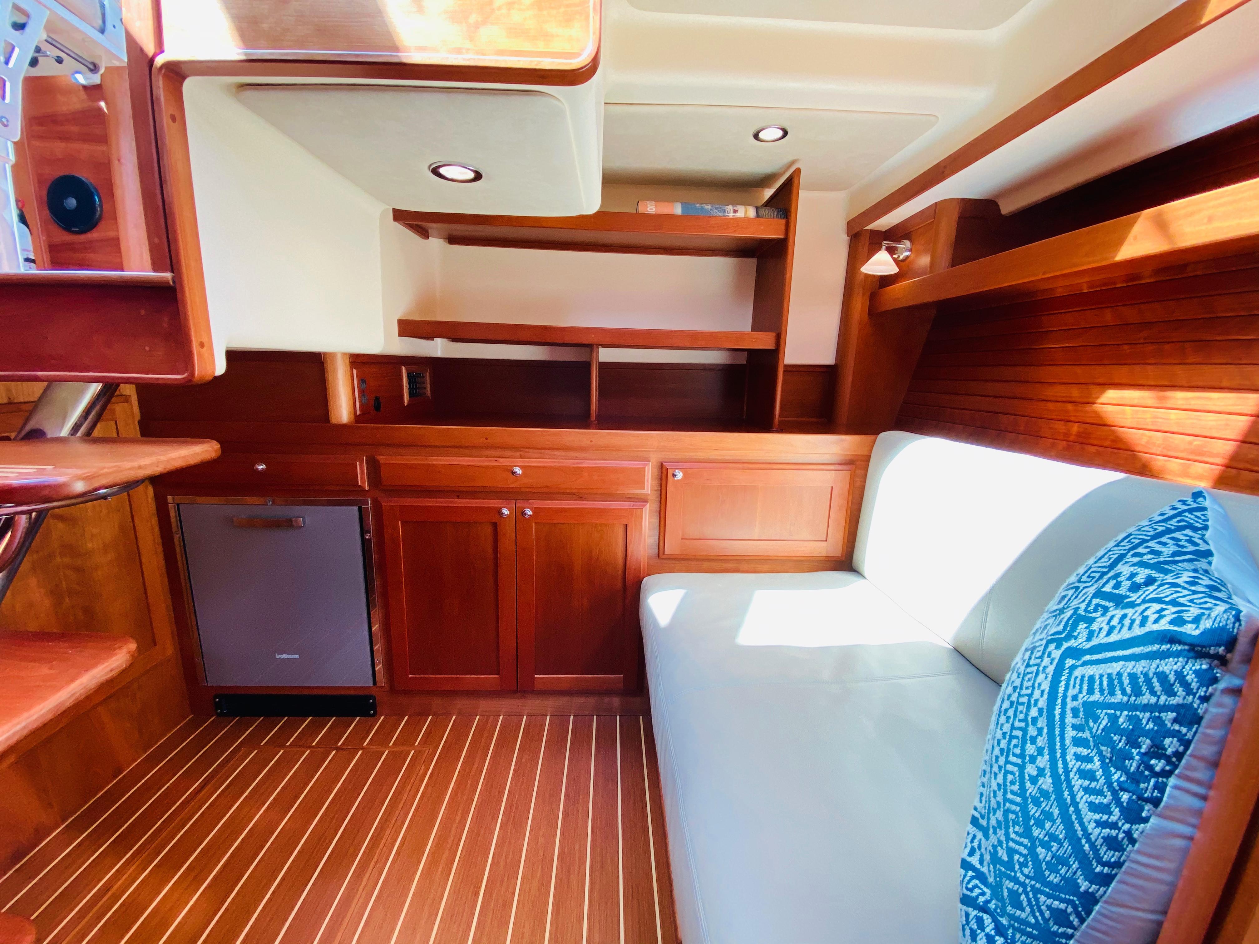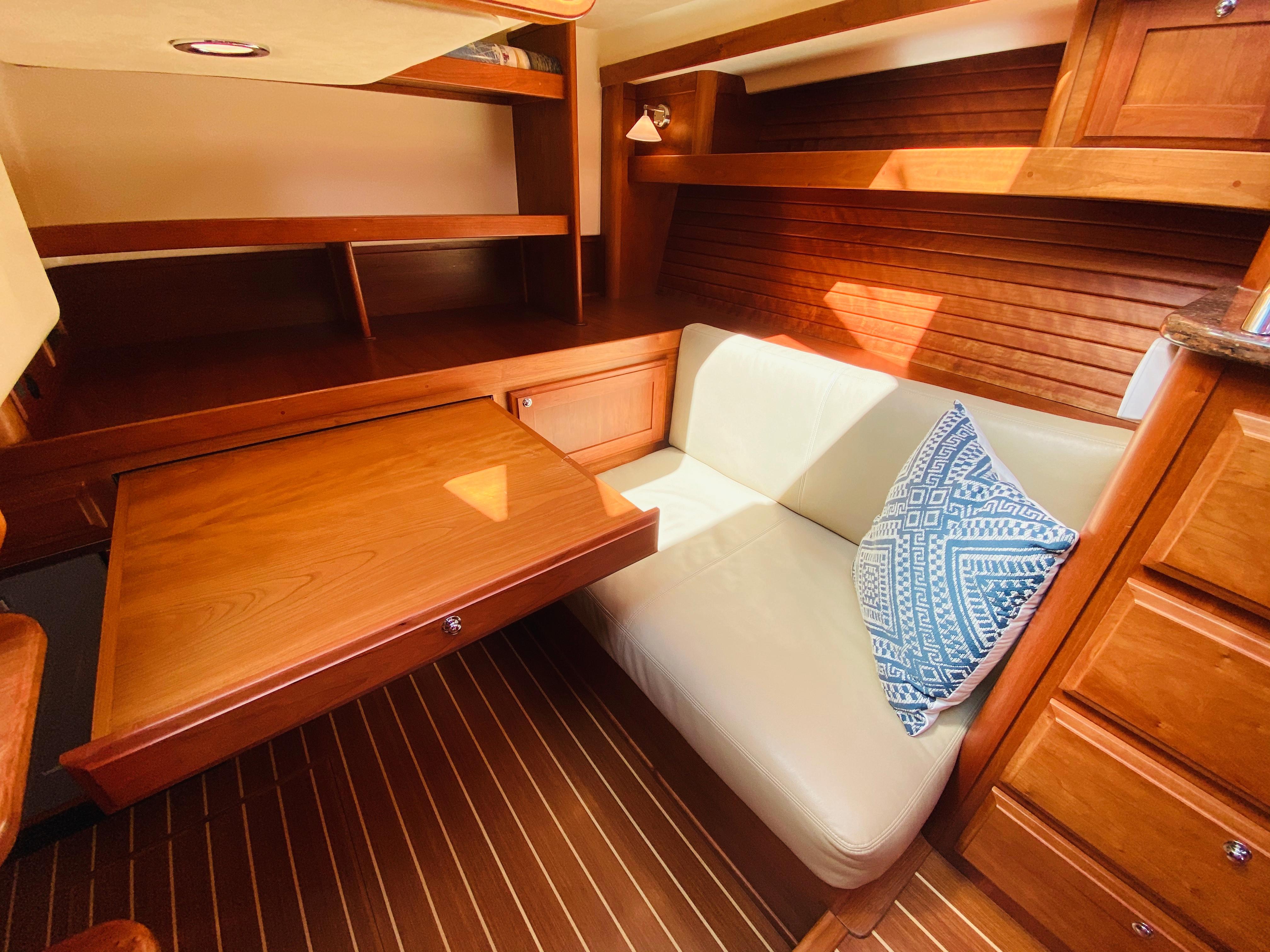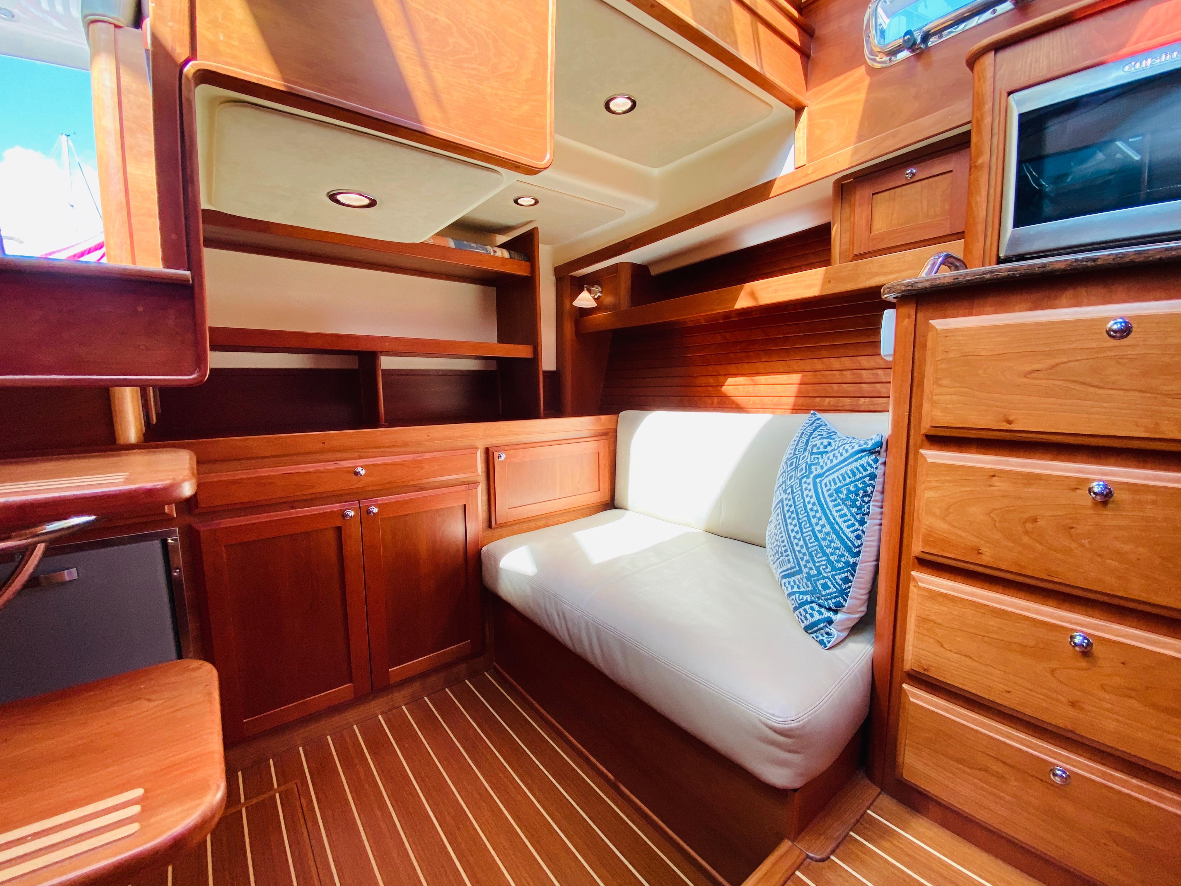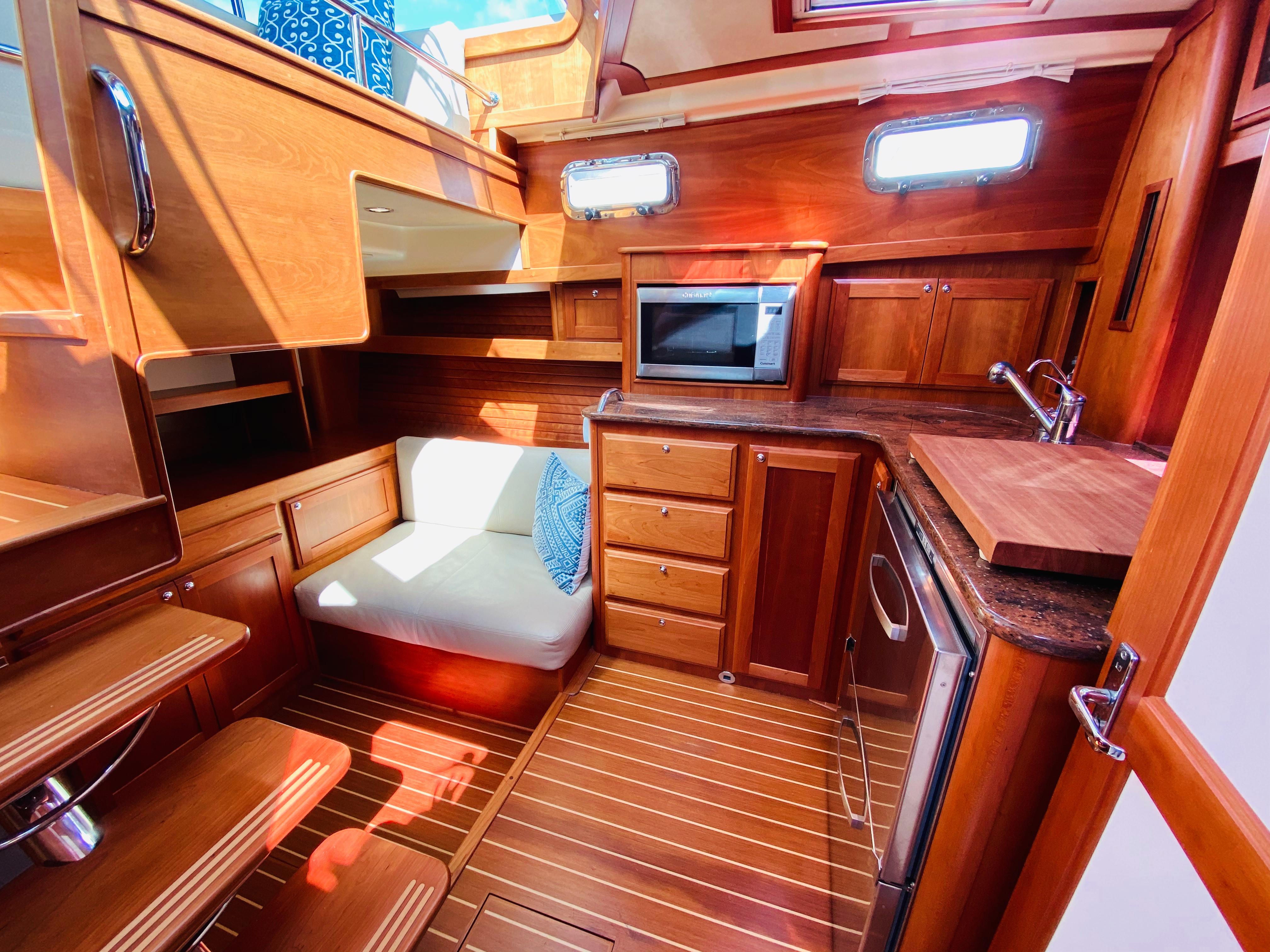 Mates L-shaped settee forward, open to galley with stainless steel hand rail