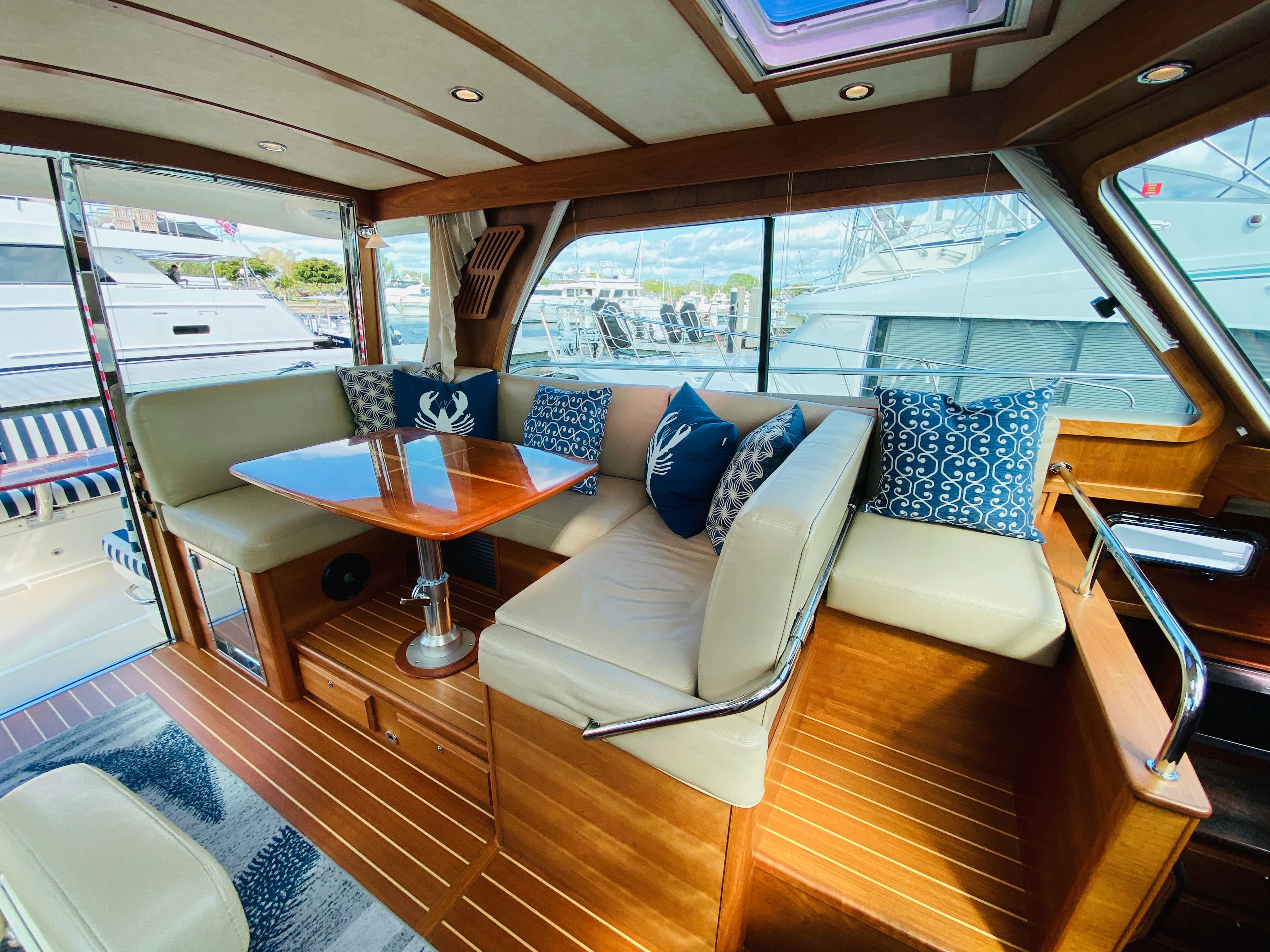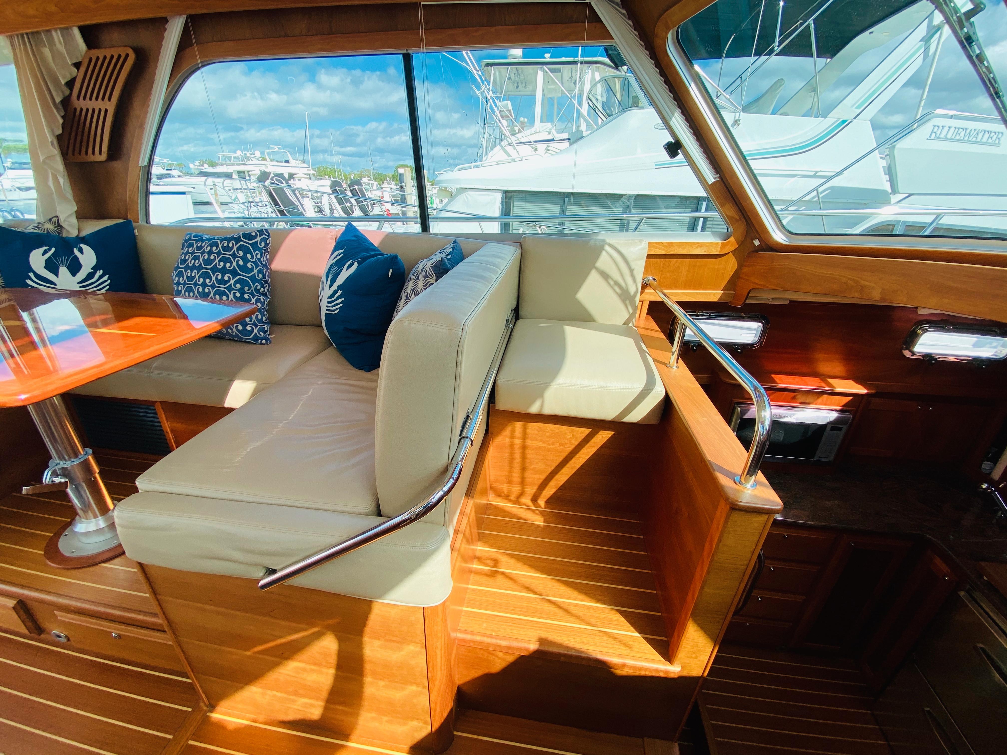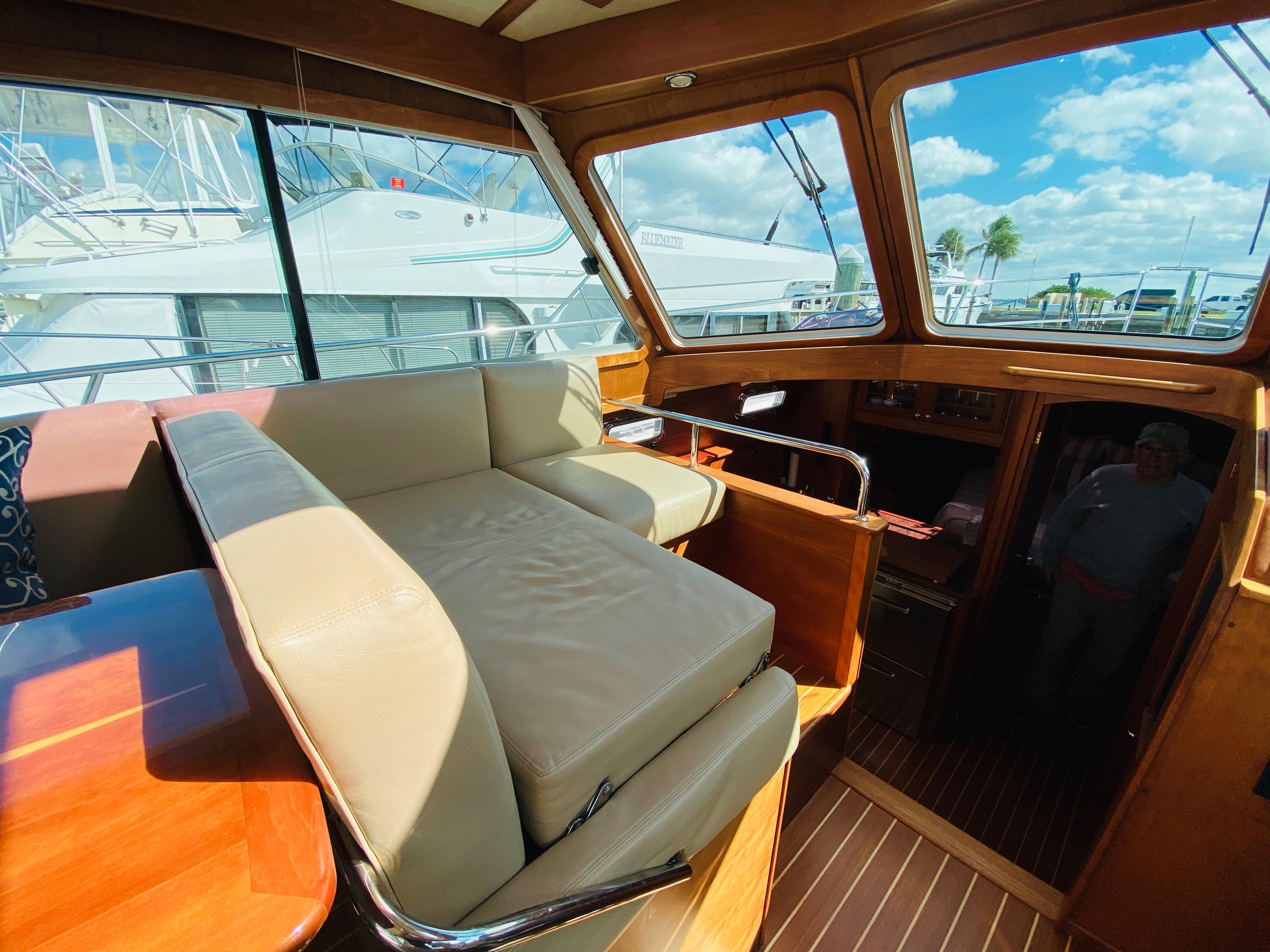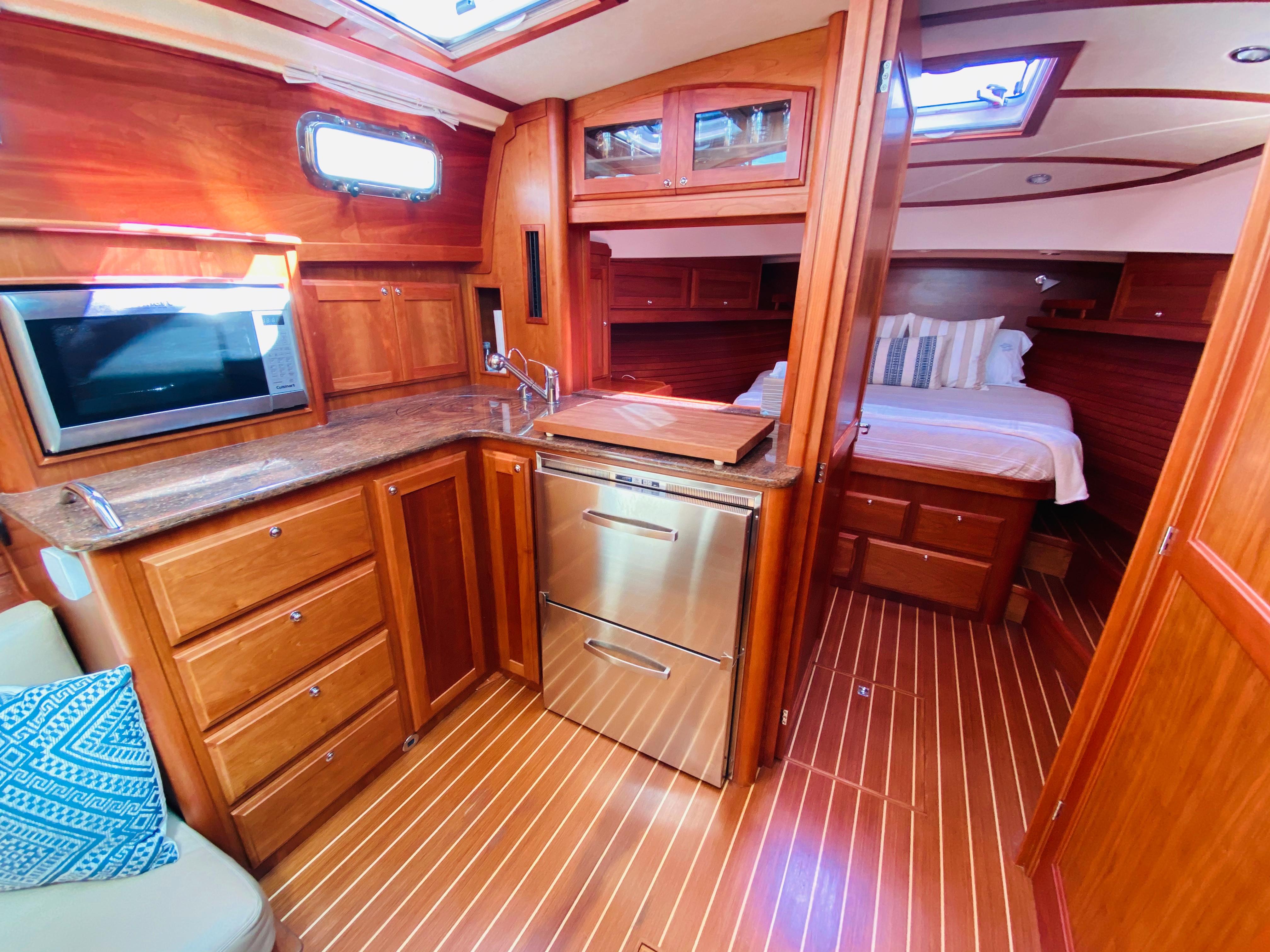 Mates L-shaped settee forward, open to galley with stainless steel hand rail