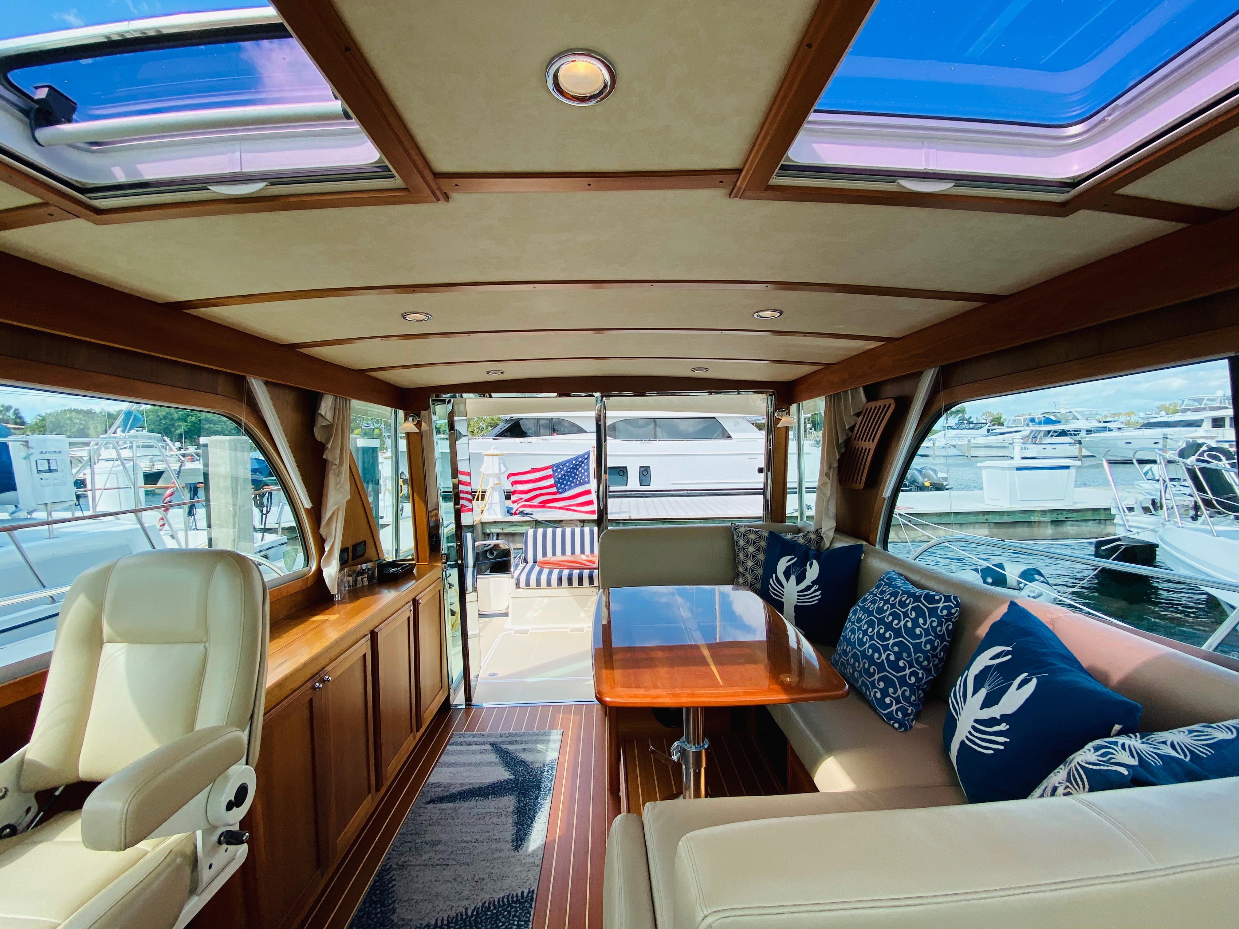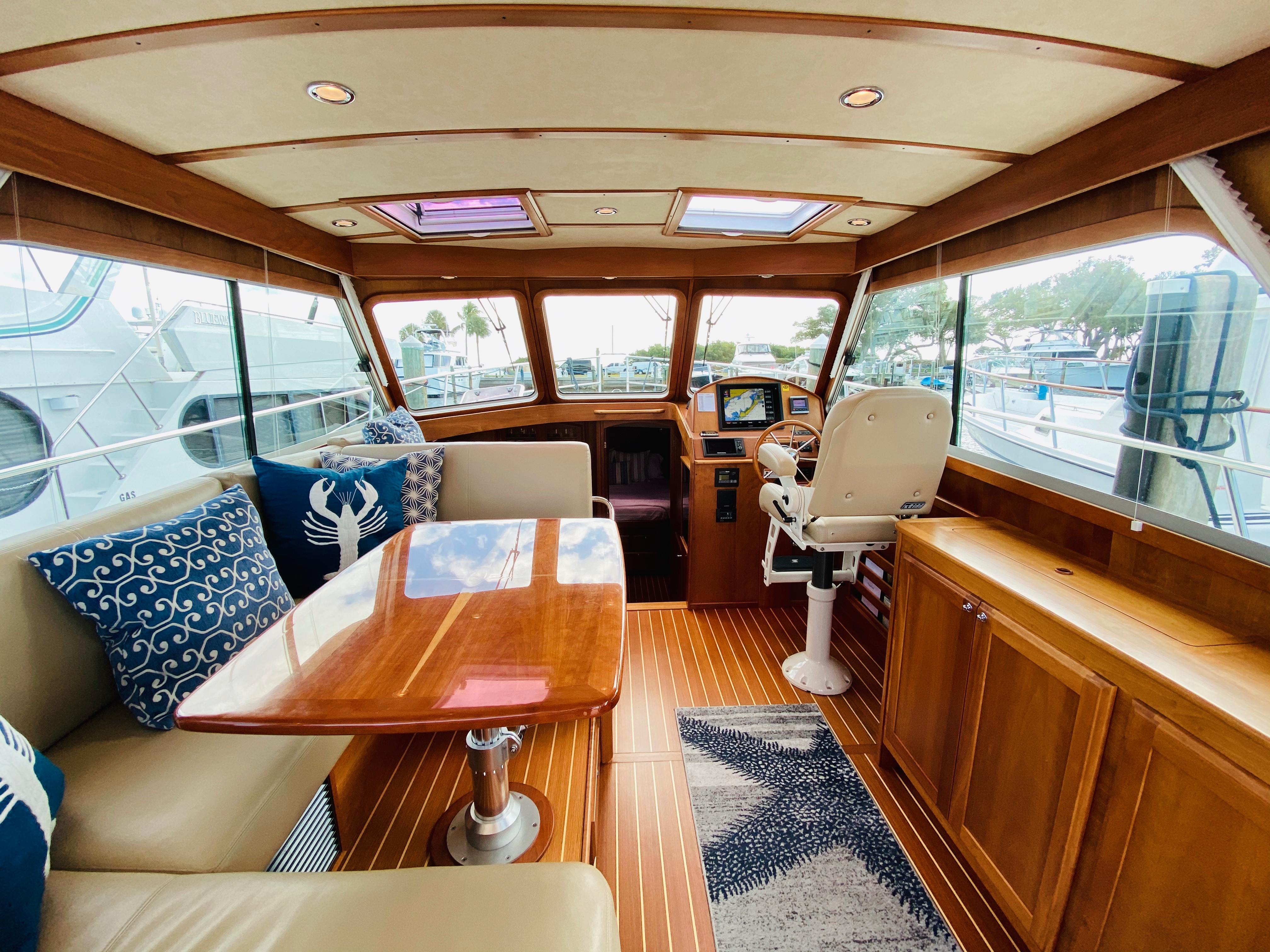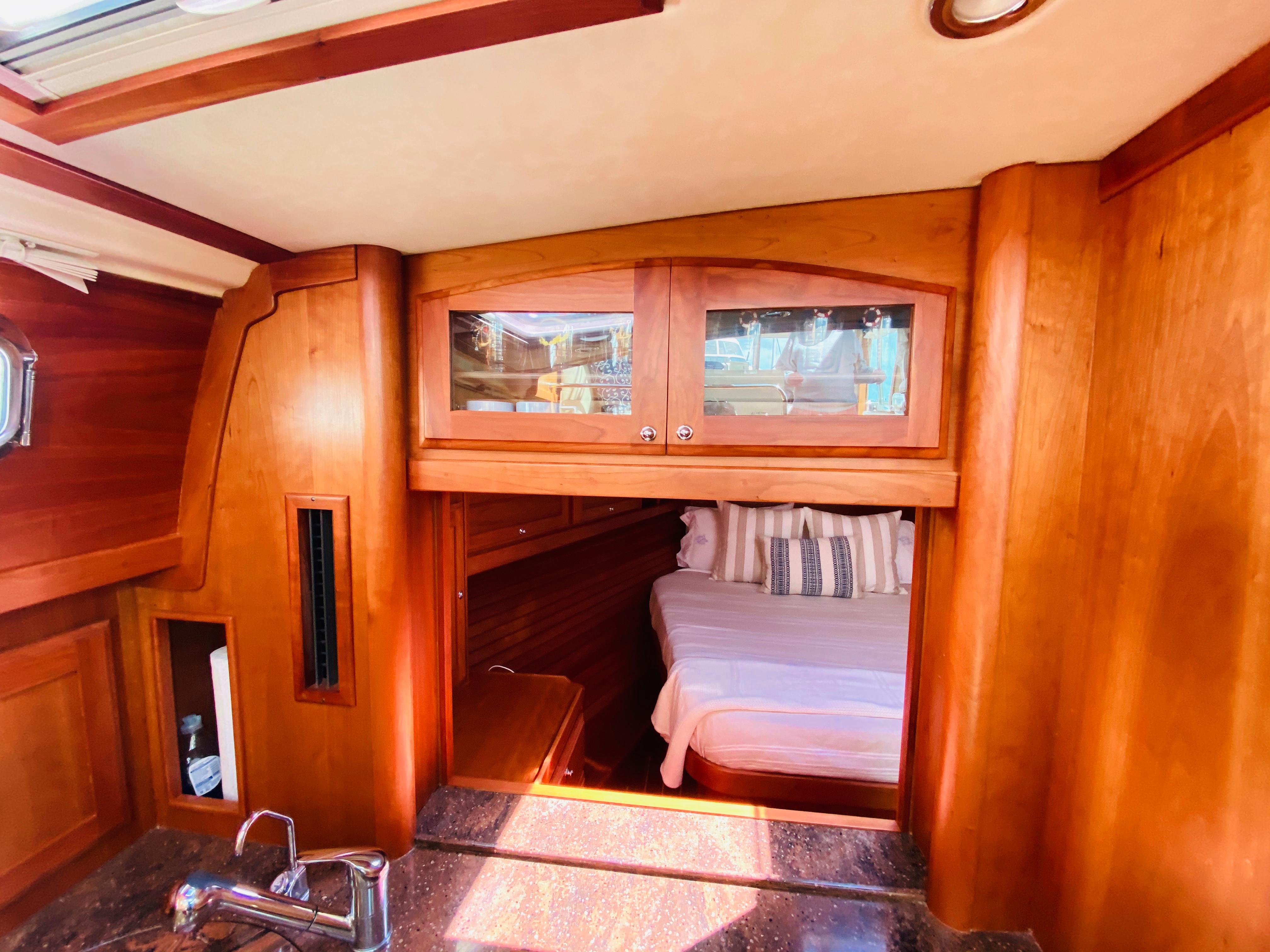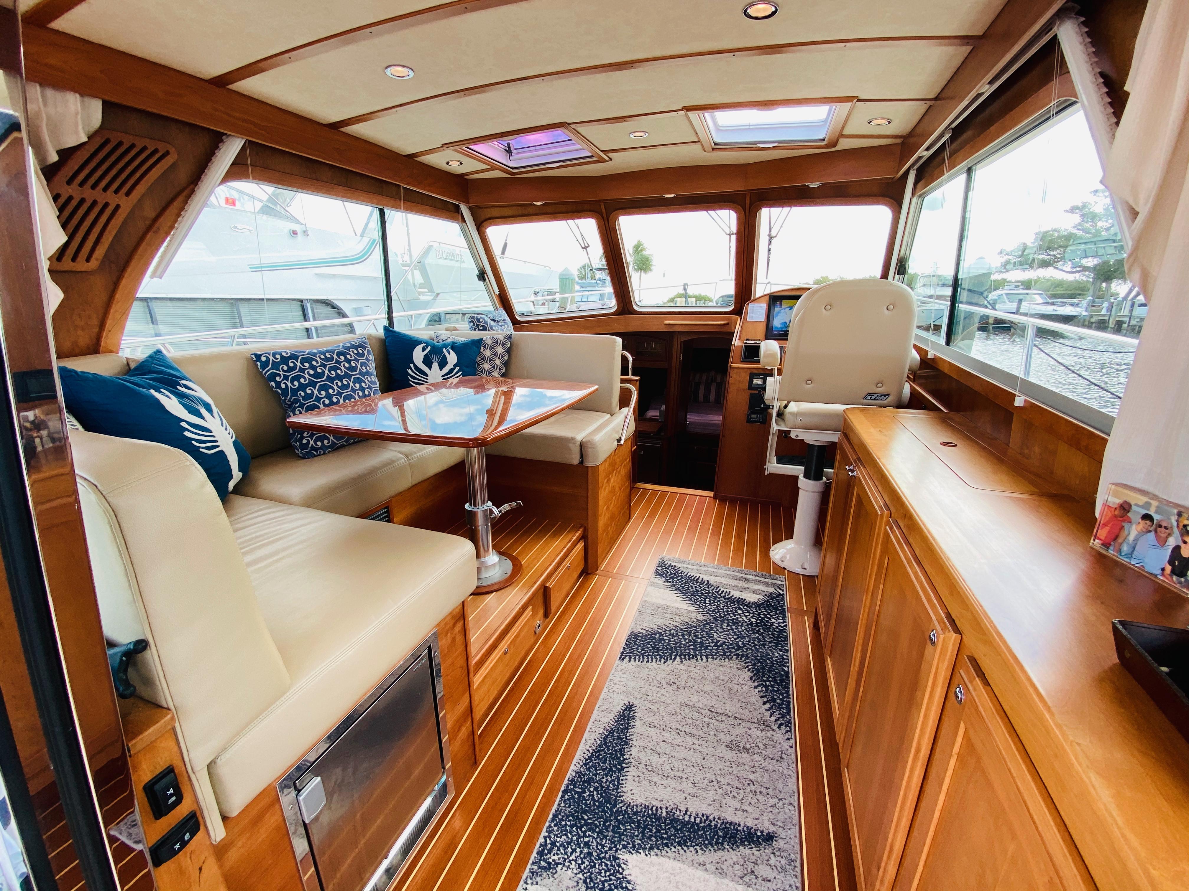 Mates L-shaped settee forward, open to galley with stainless steel hand rail