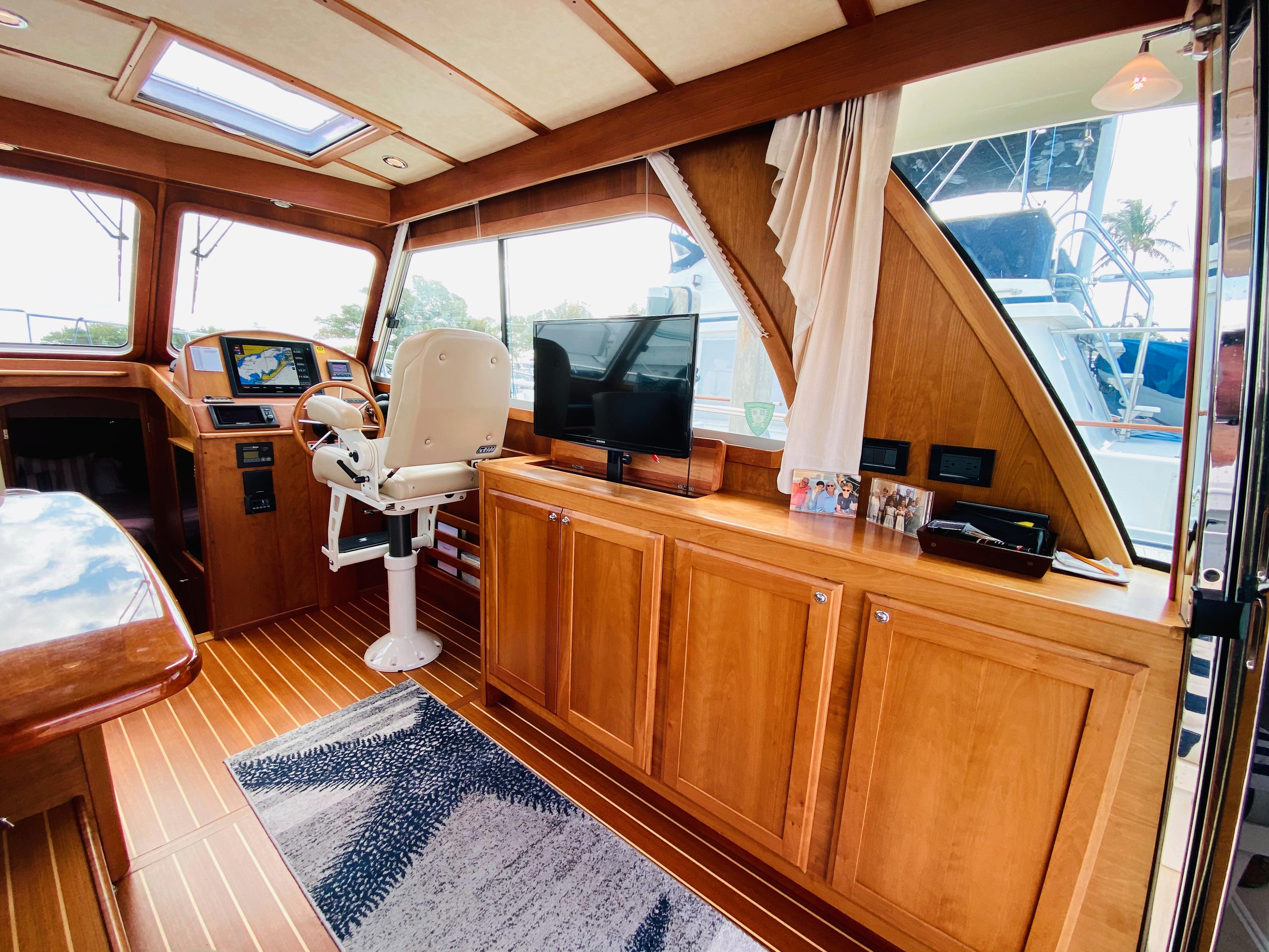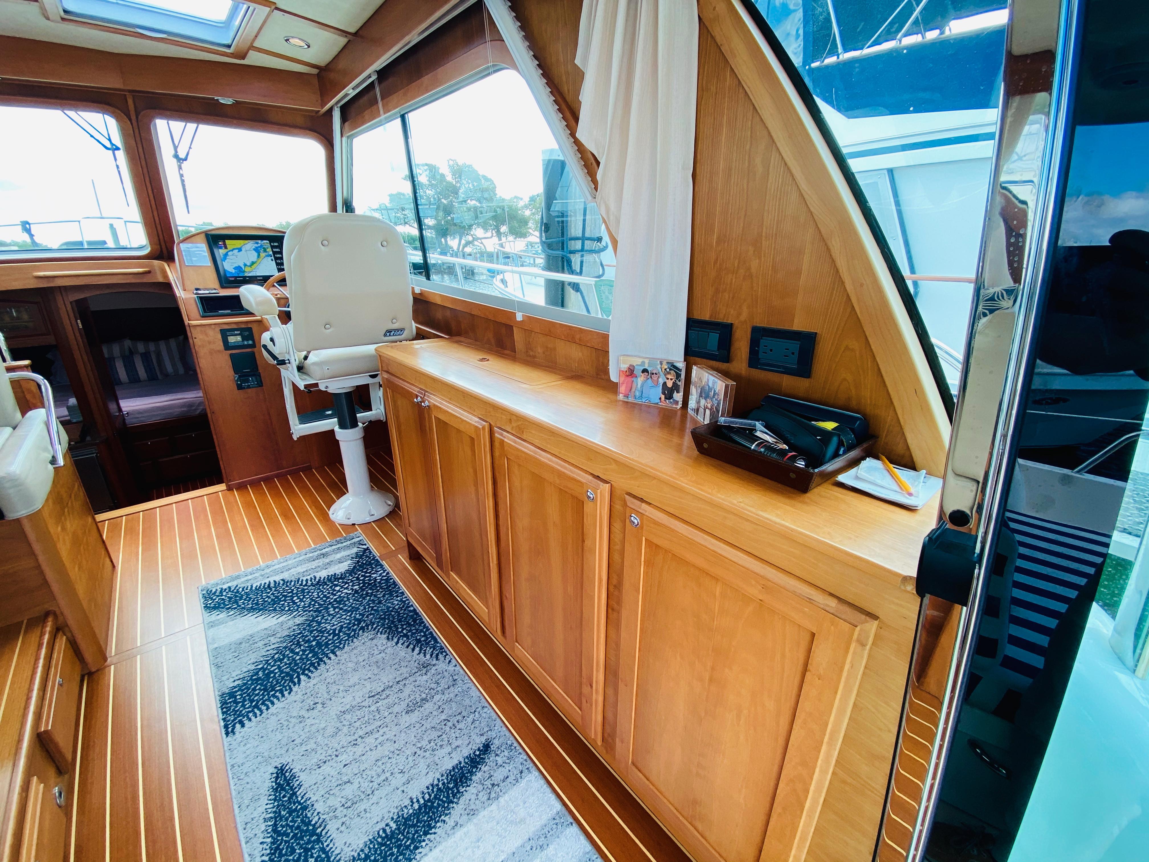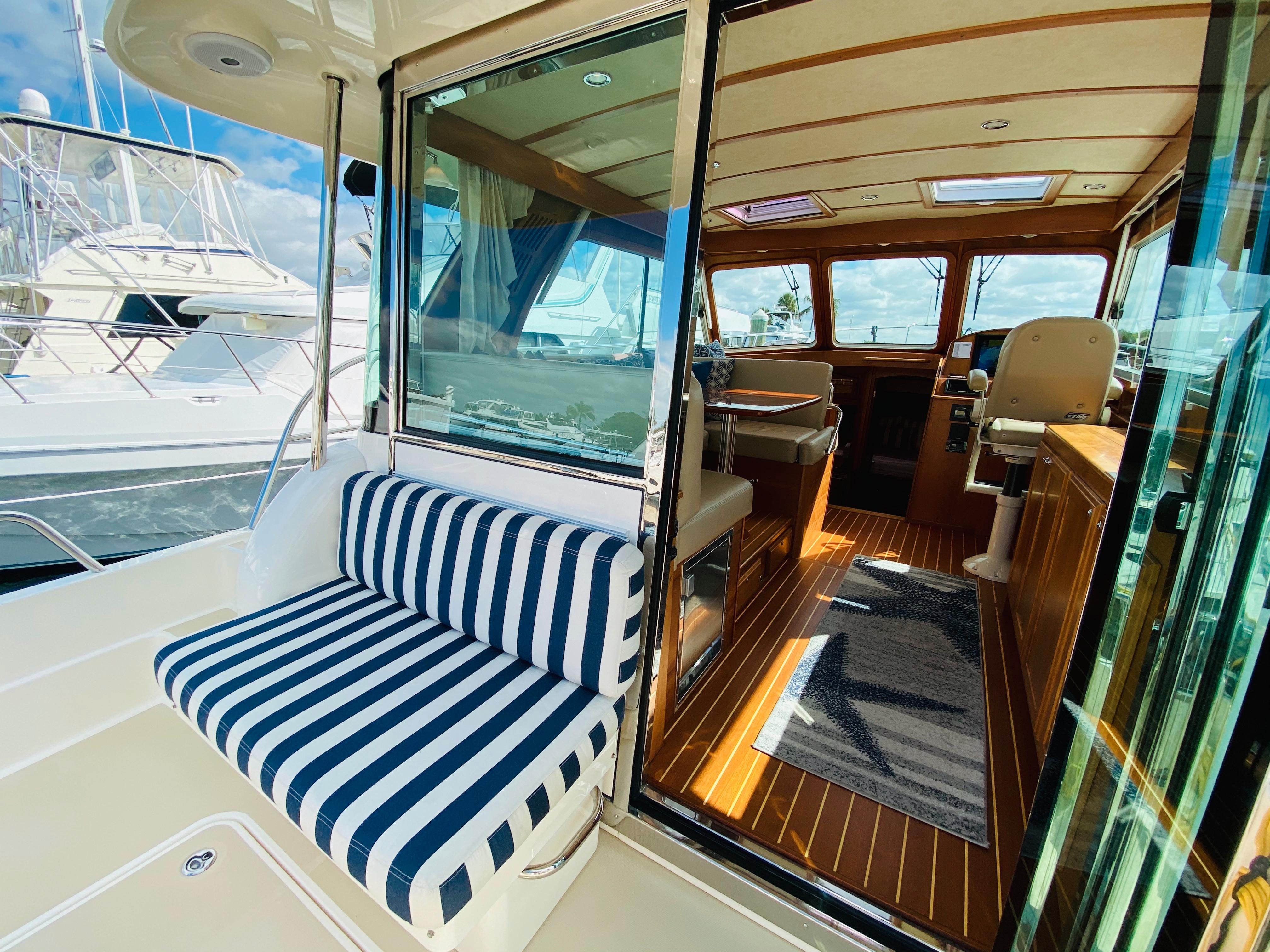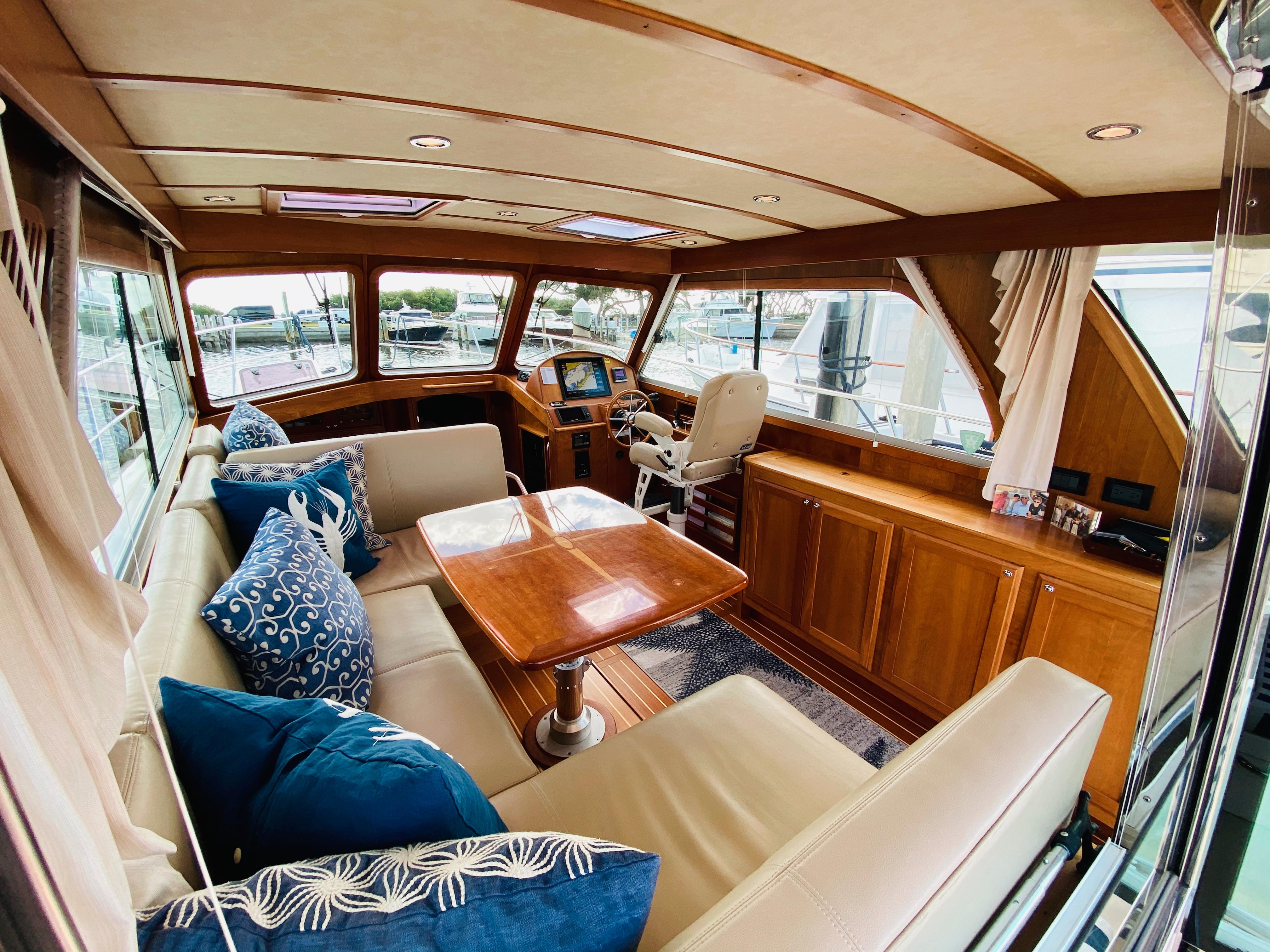 Mates L-shaped settee forward, open to galley with stainless steel hand rail