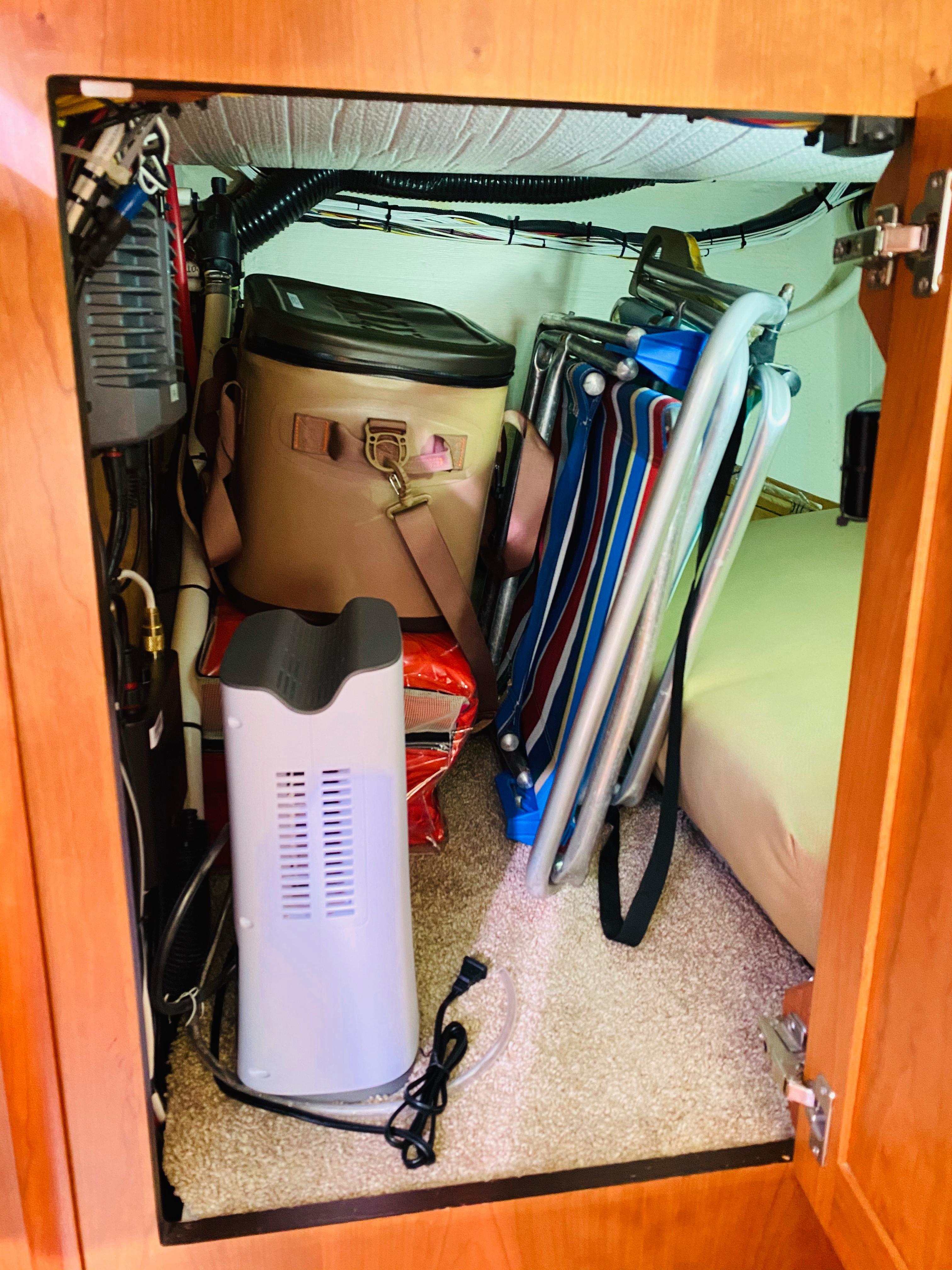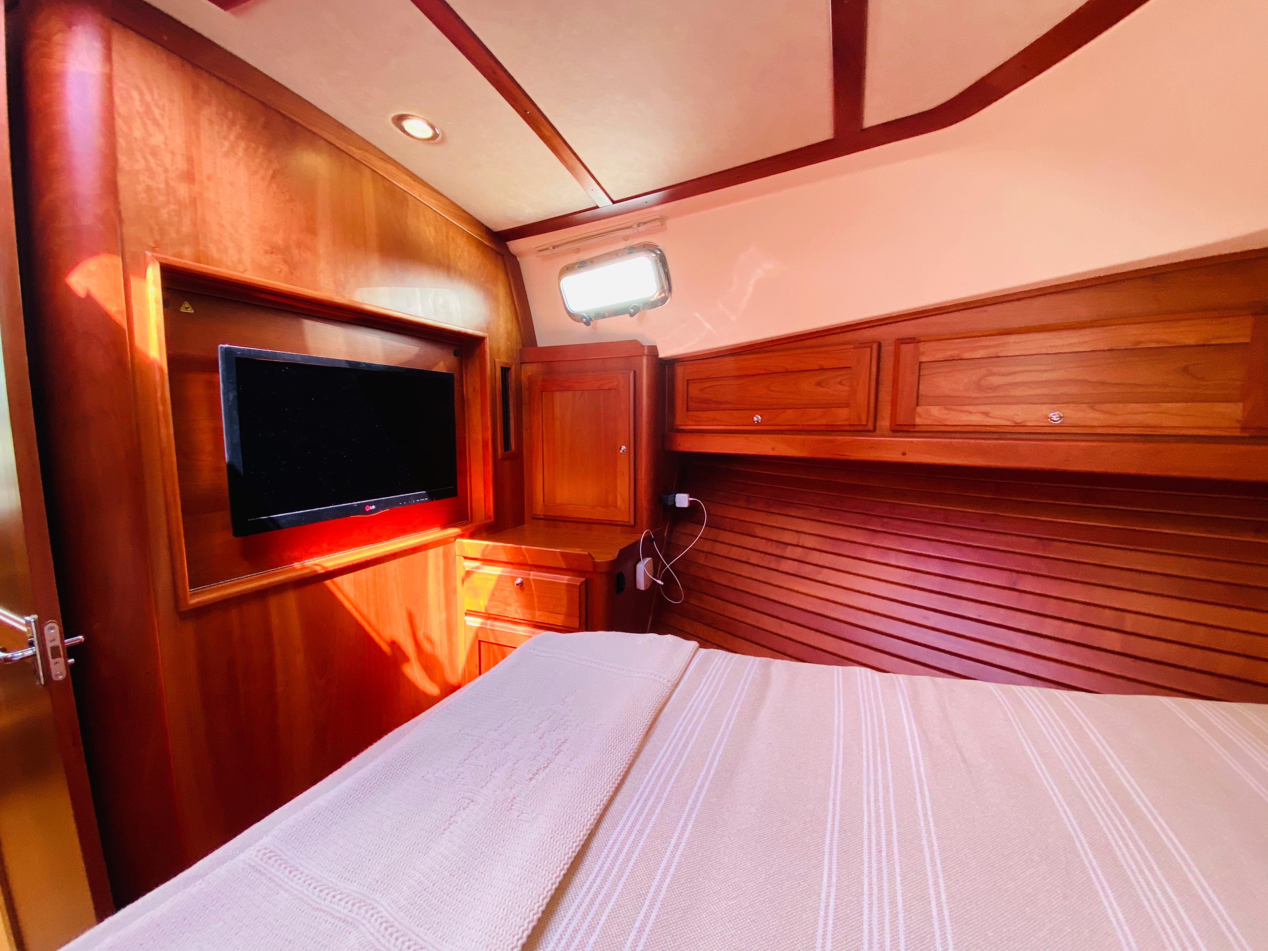 Cabinet to starboard with storage and Samsung 28" TV on manual lift