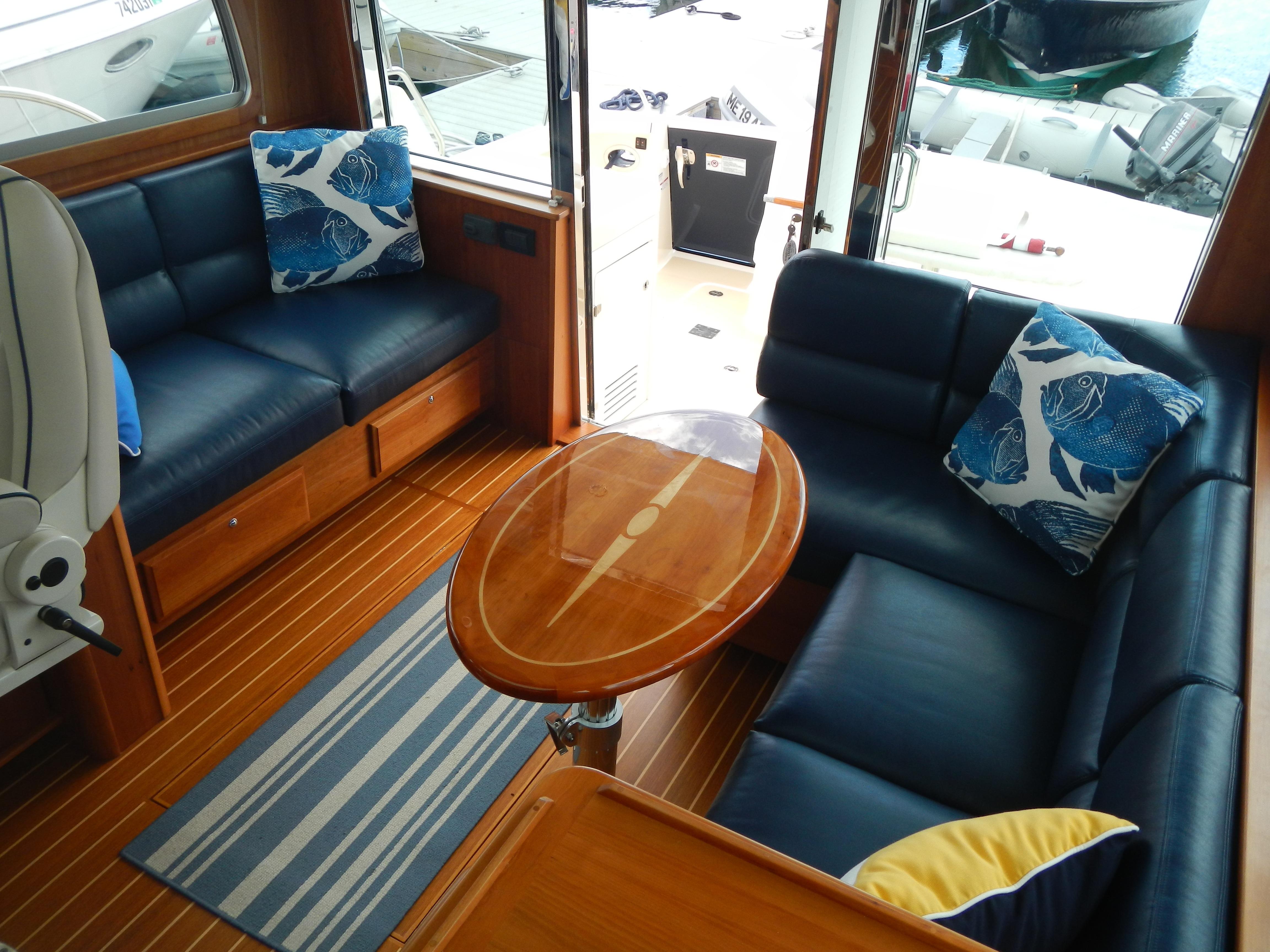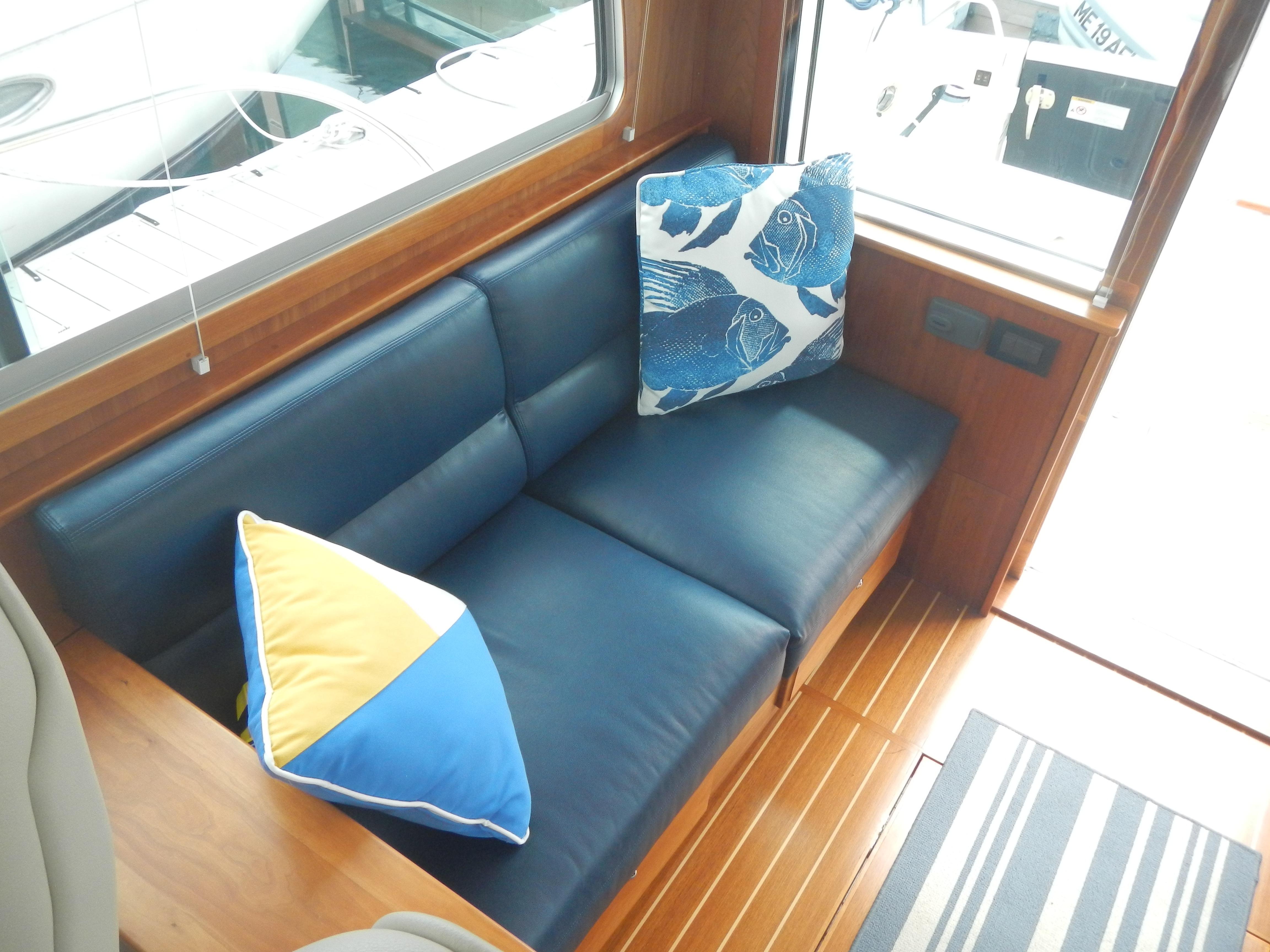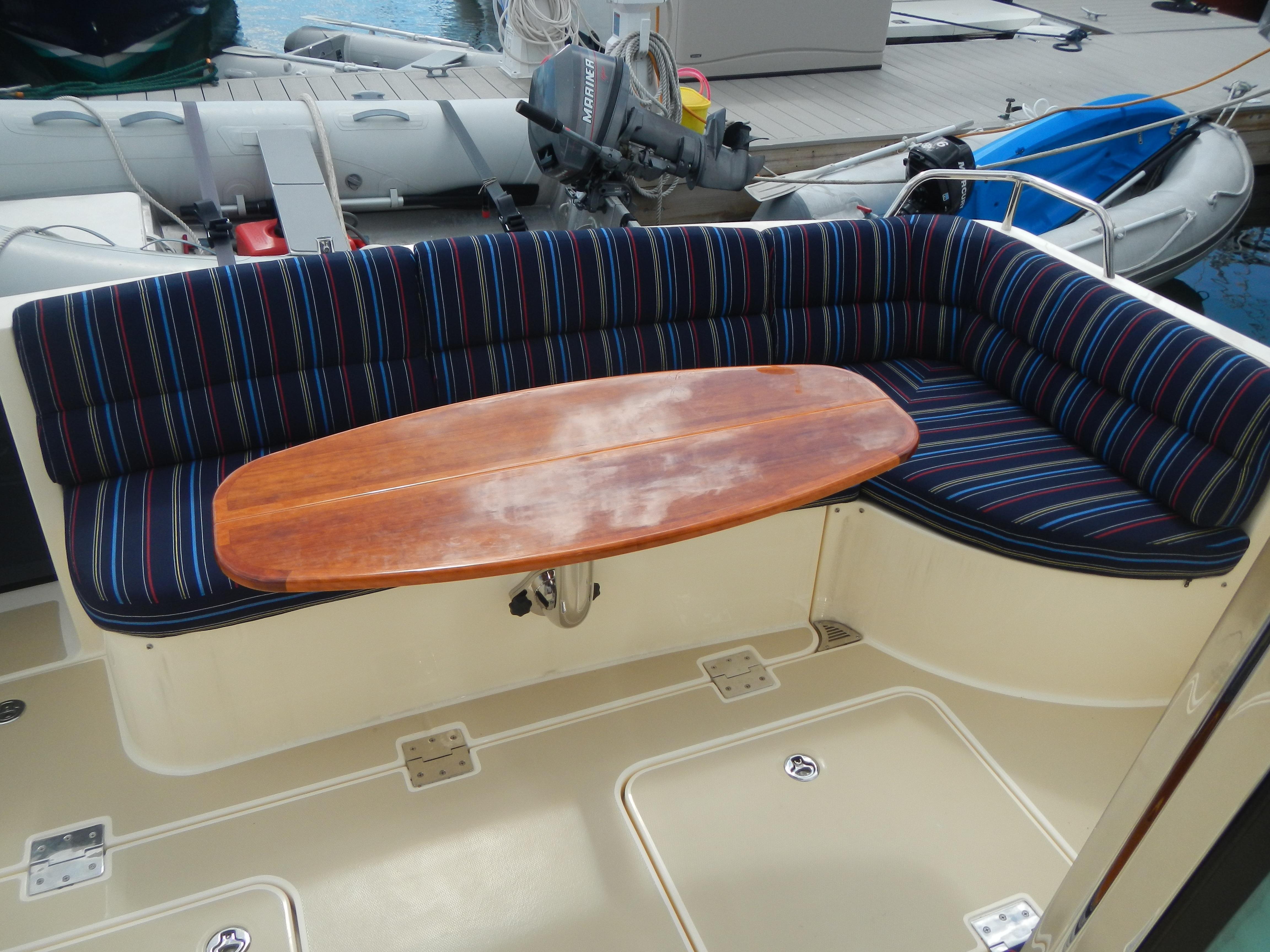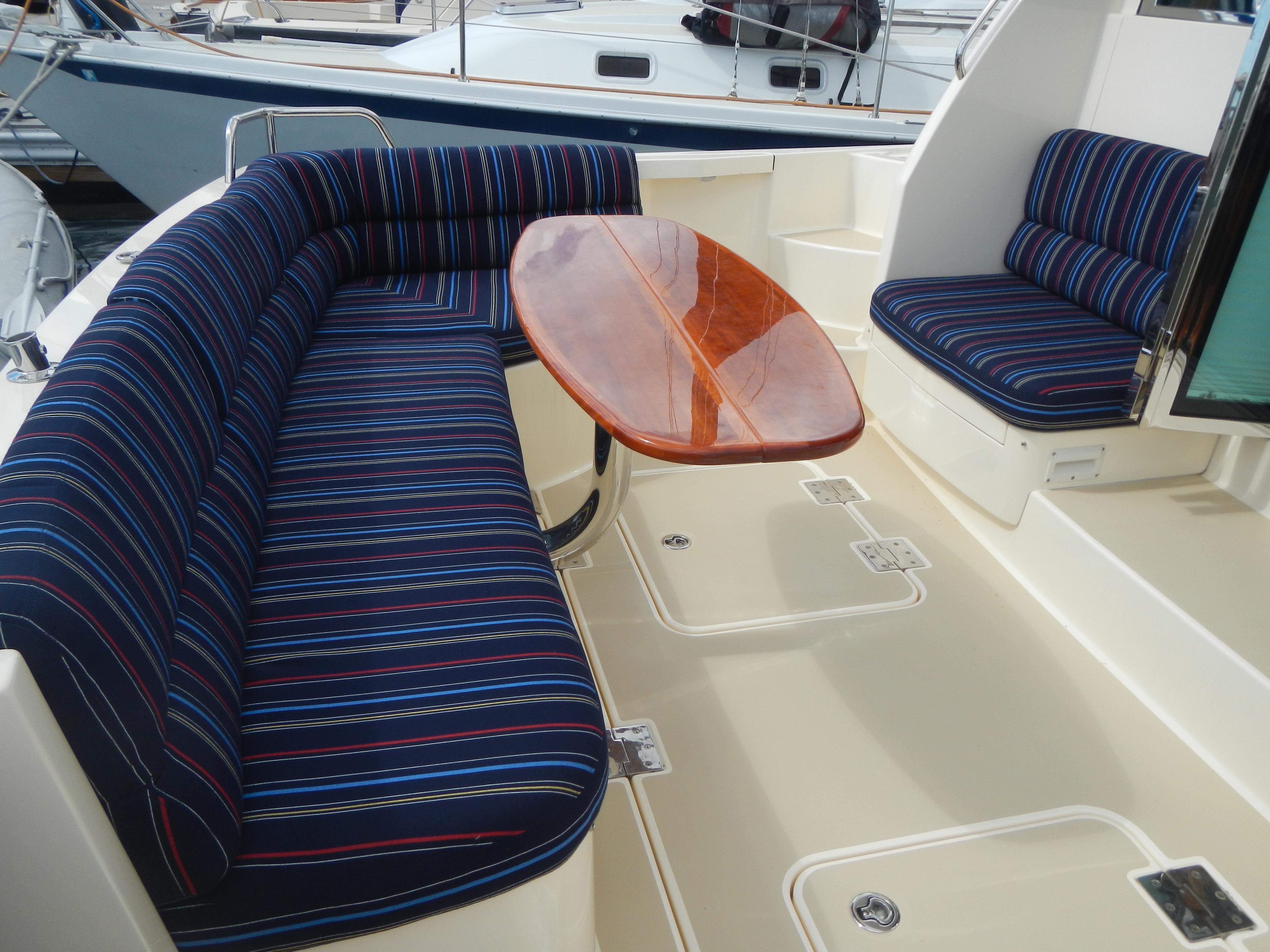 "L"-settee to port, 5" foam cushions, with storage and Sabre tool drawer under. Sunbrella fabric seat coverings;