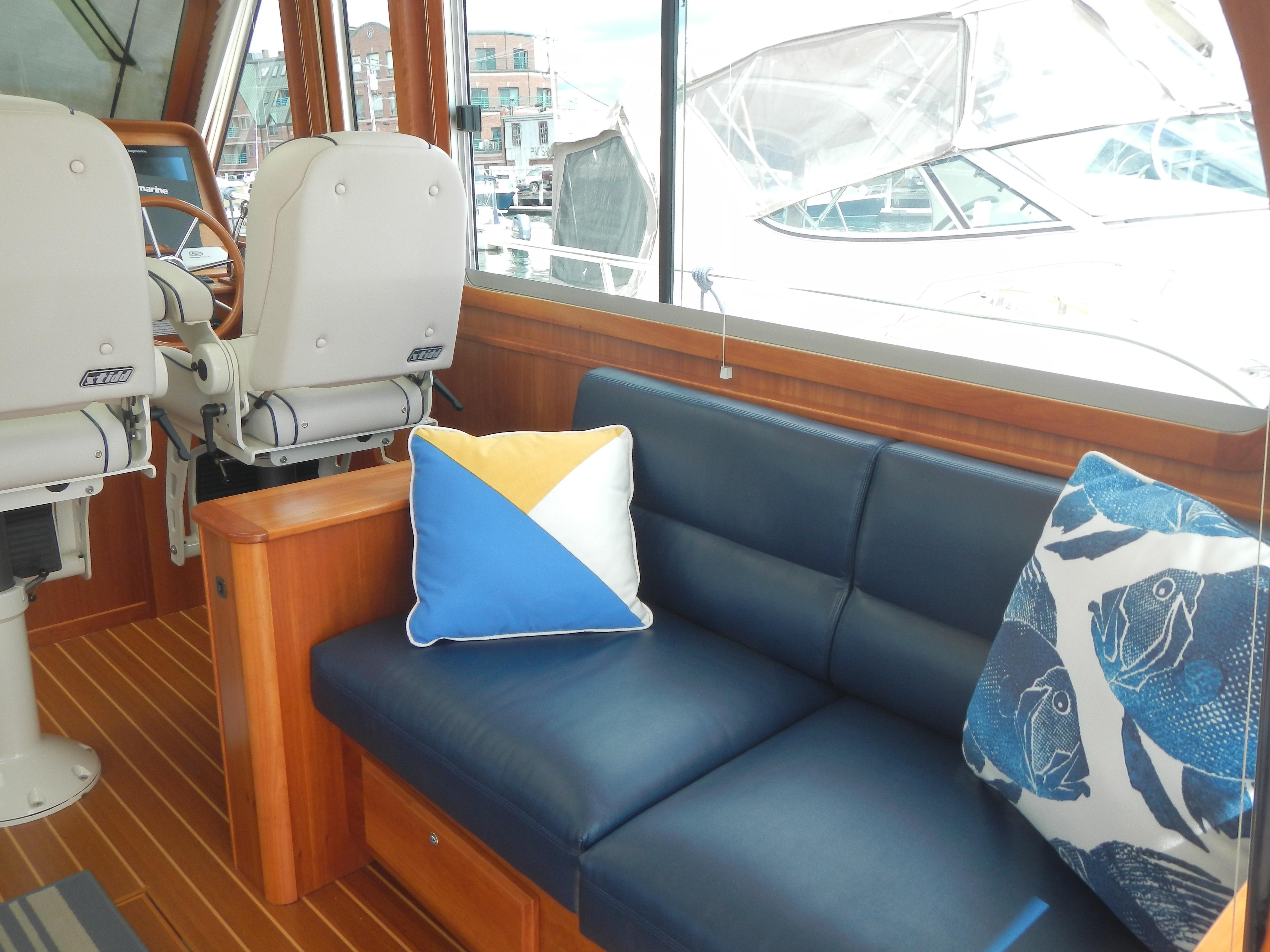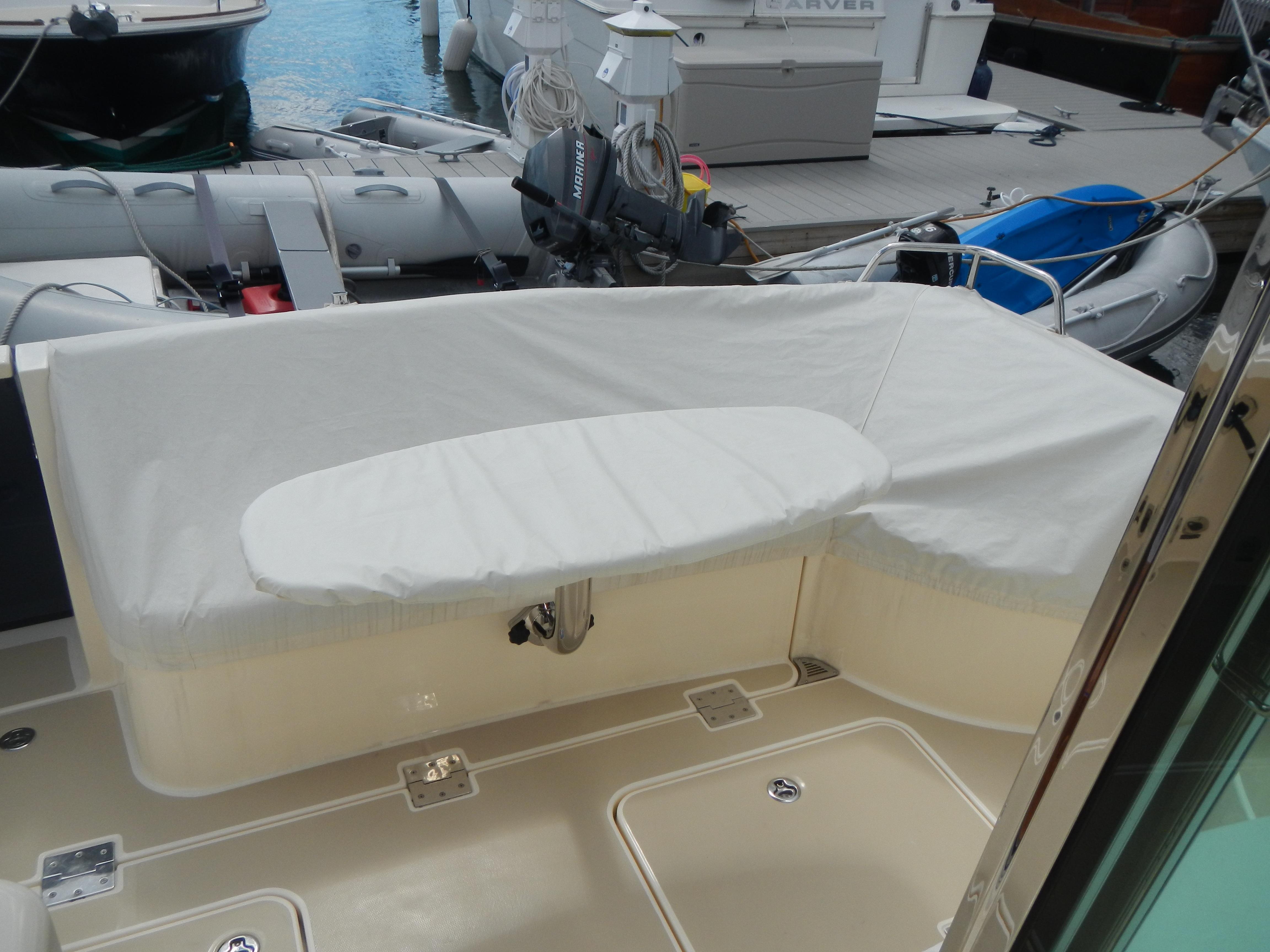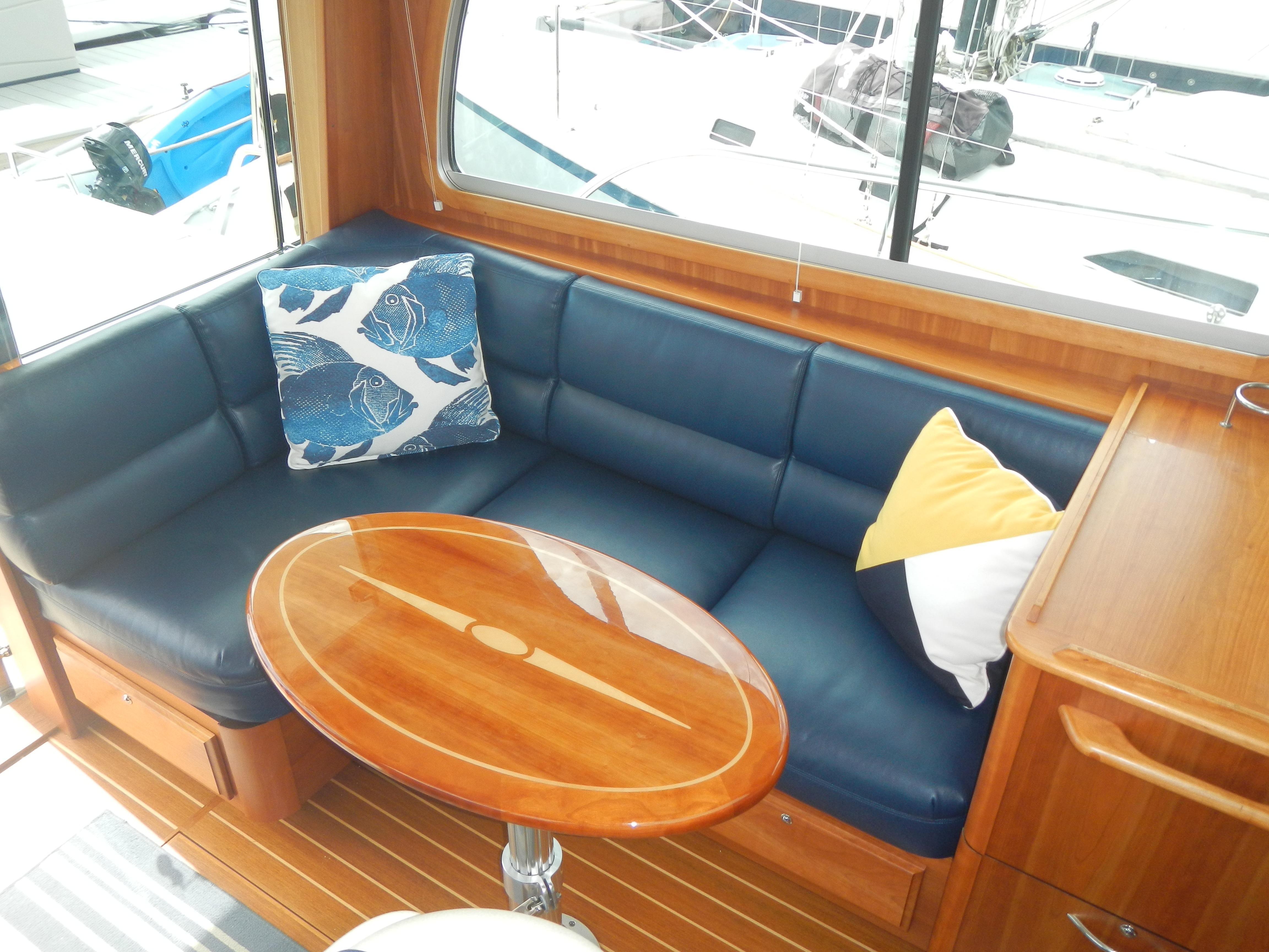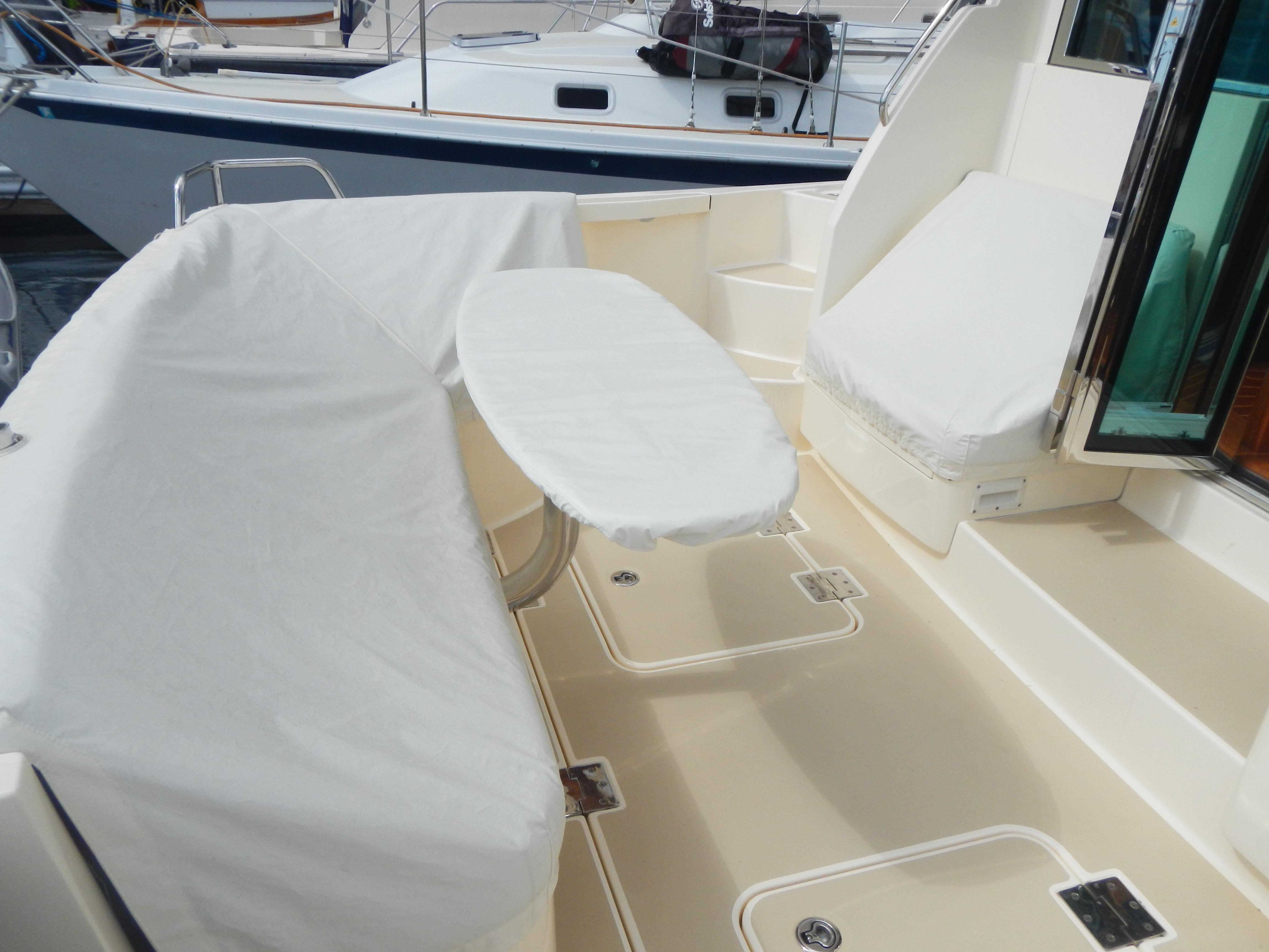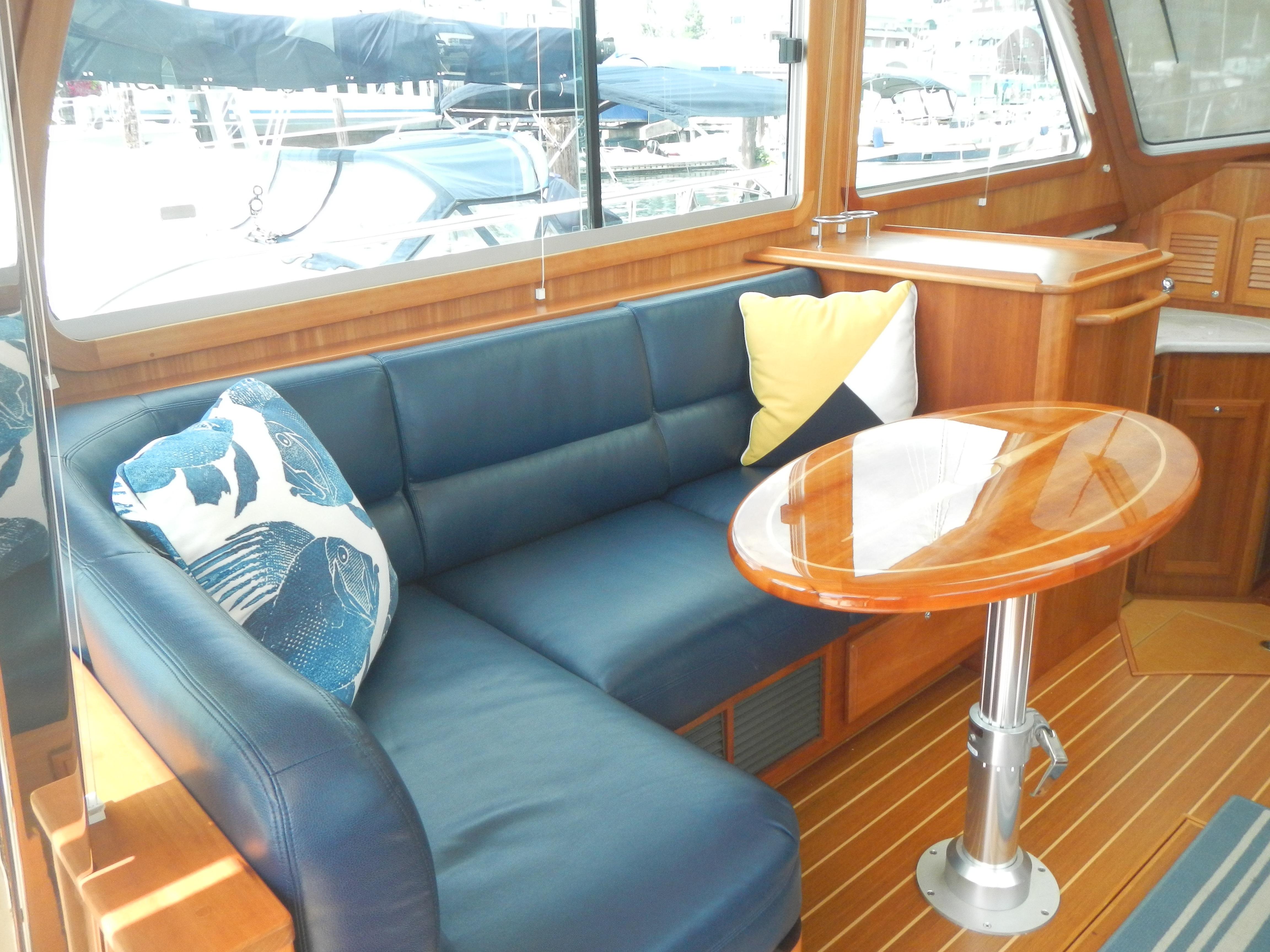 "L"-settee to port, 5" foam cushions, with storage and Sabre tool drawer under. Sunbrella fabric seat coverings;