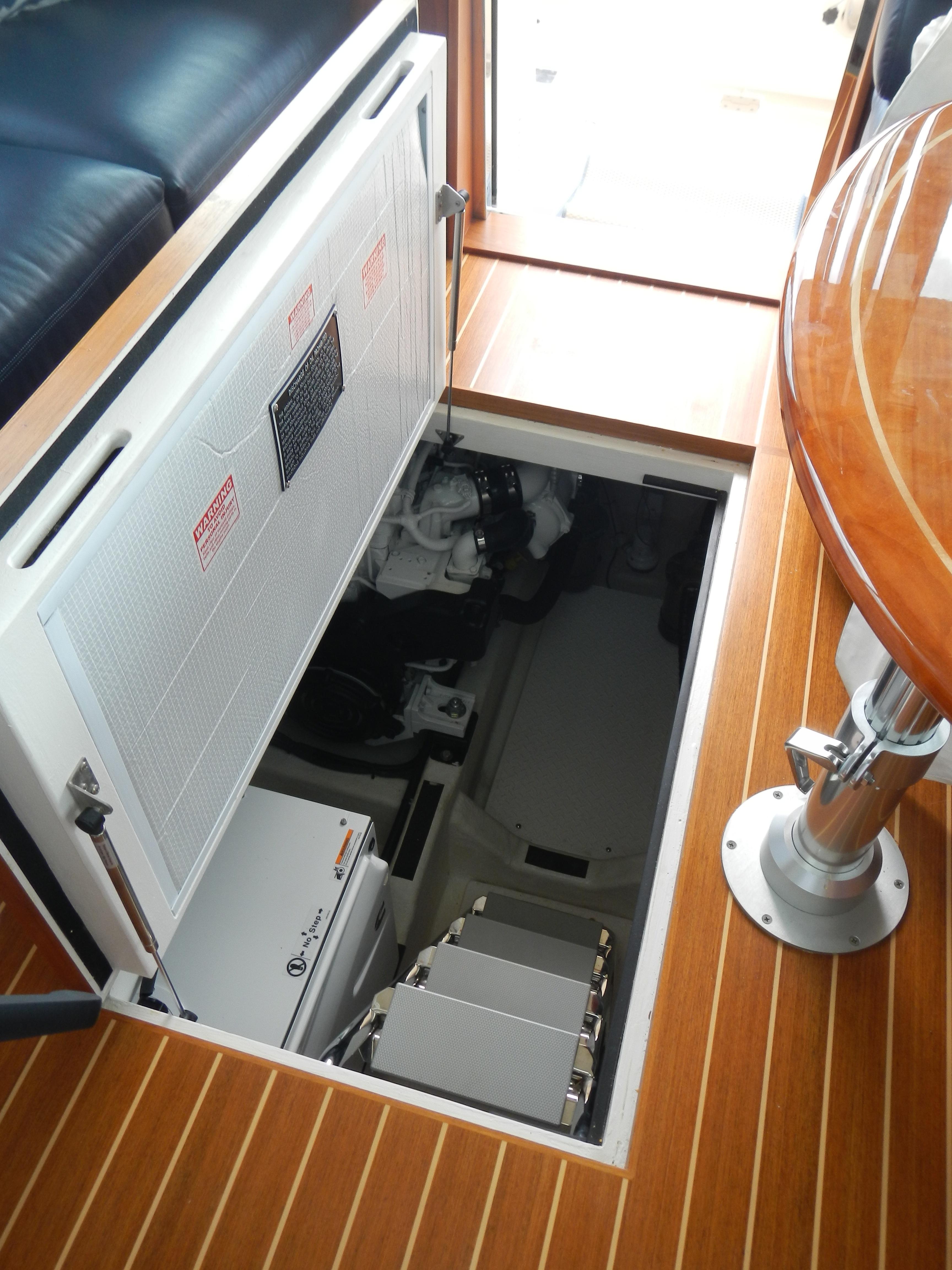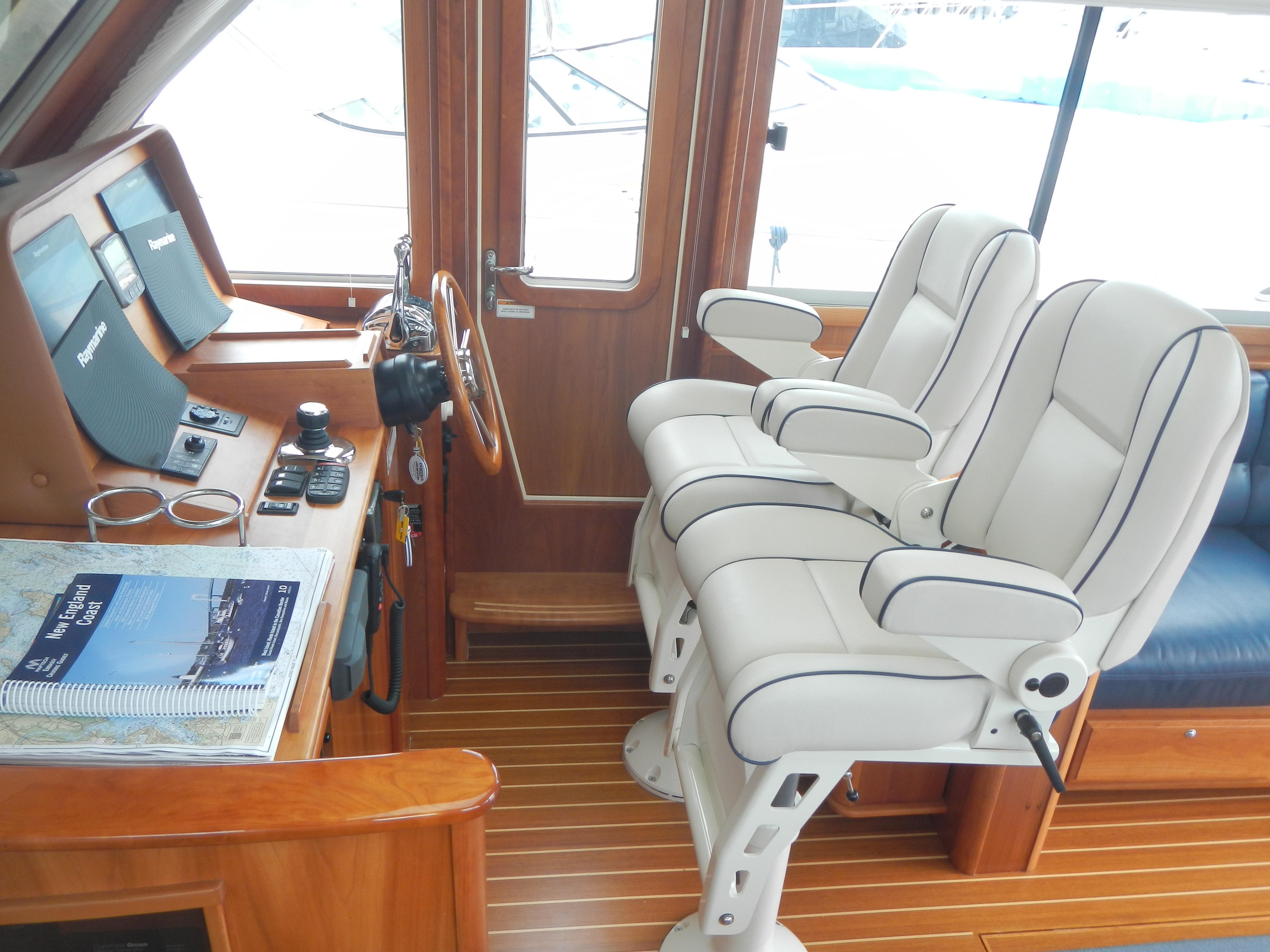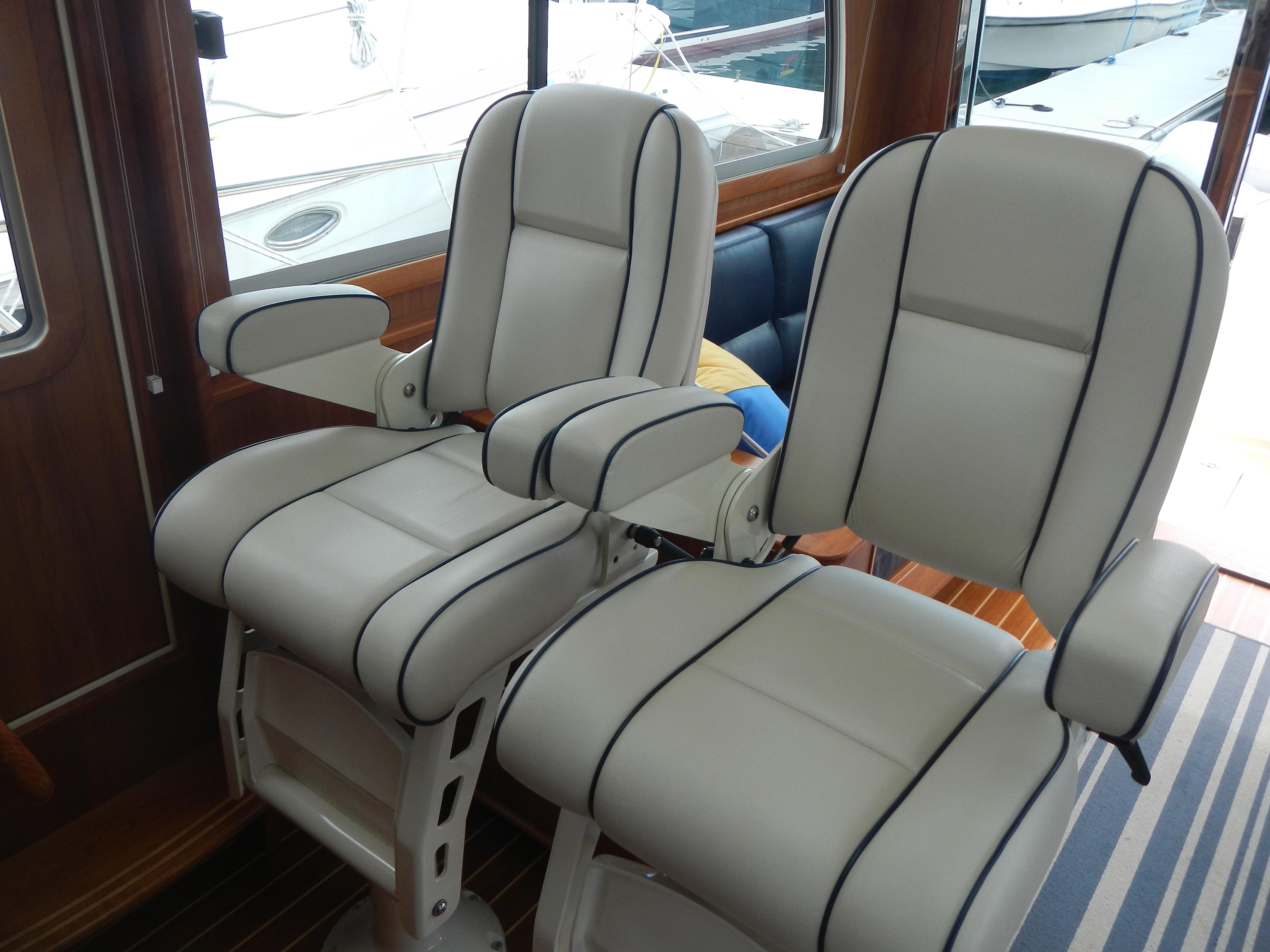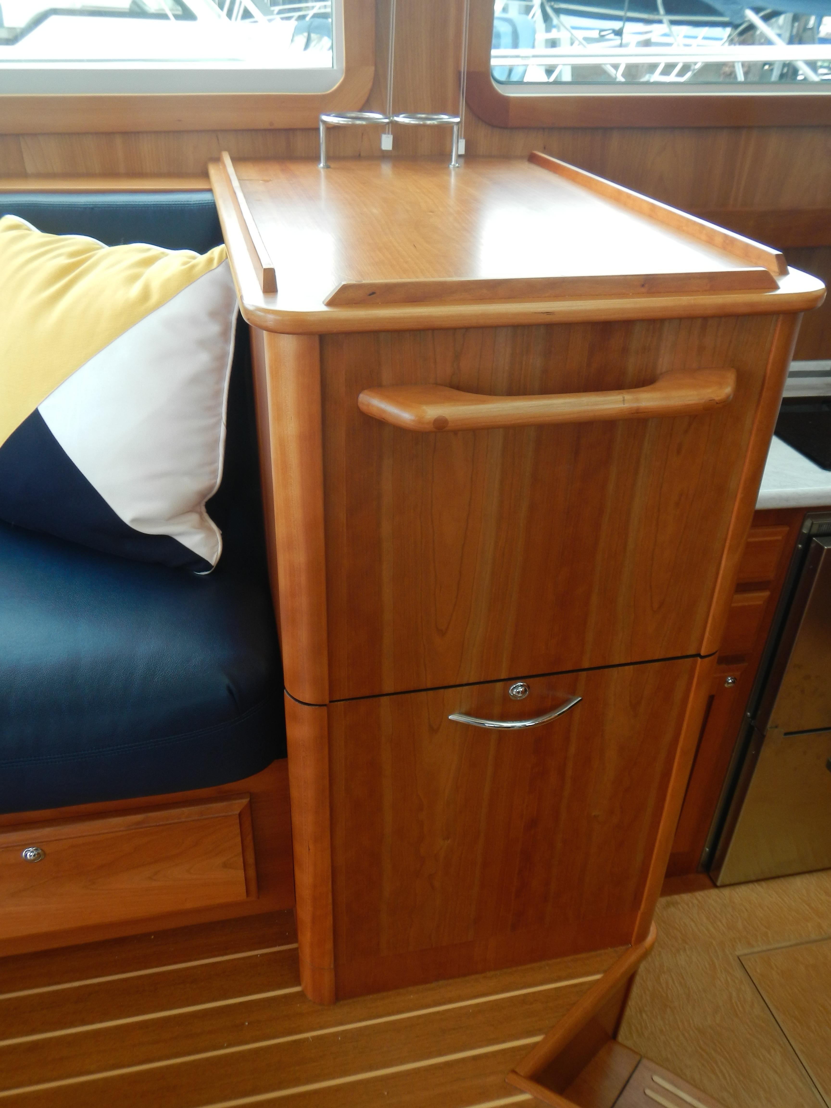 "L"-settee to port, 5" foam cushions, with storage and Sabre tool drawer under. Sunbrella fabric seat coverings;
