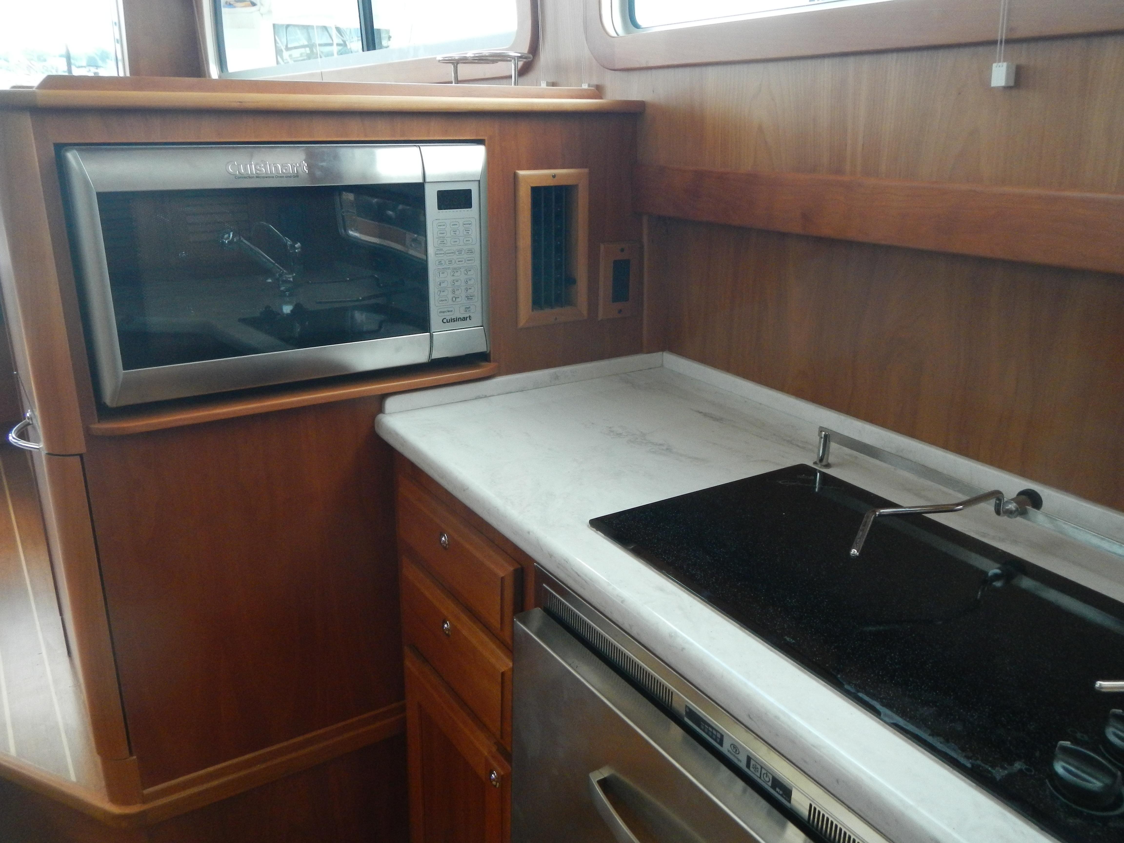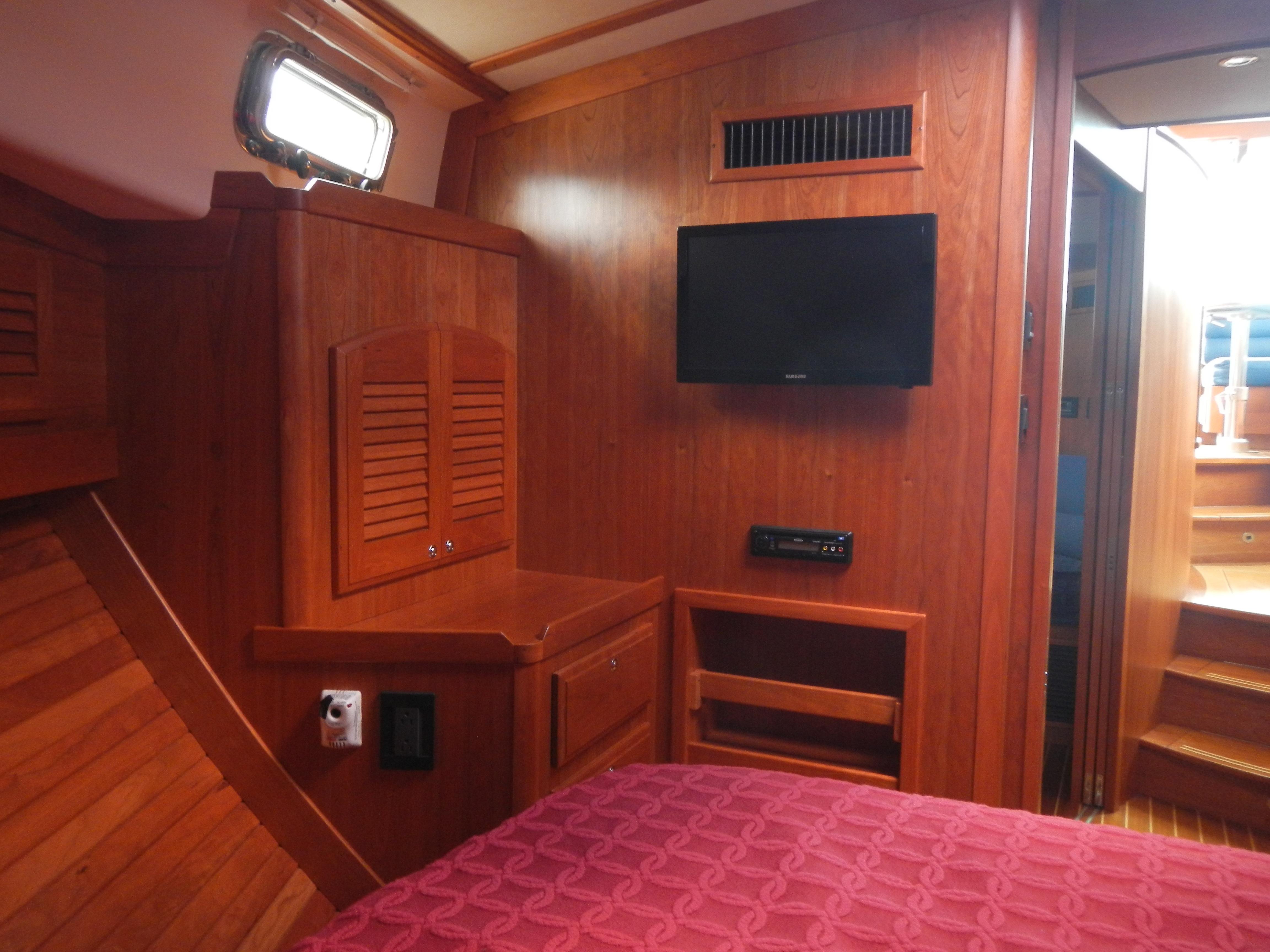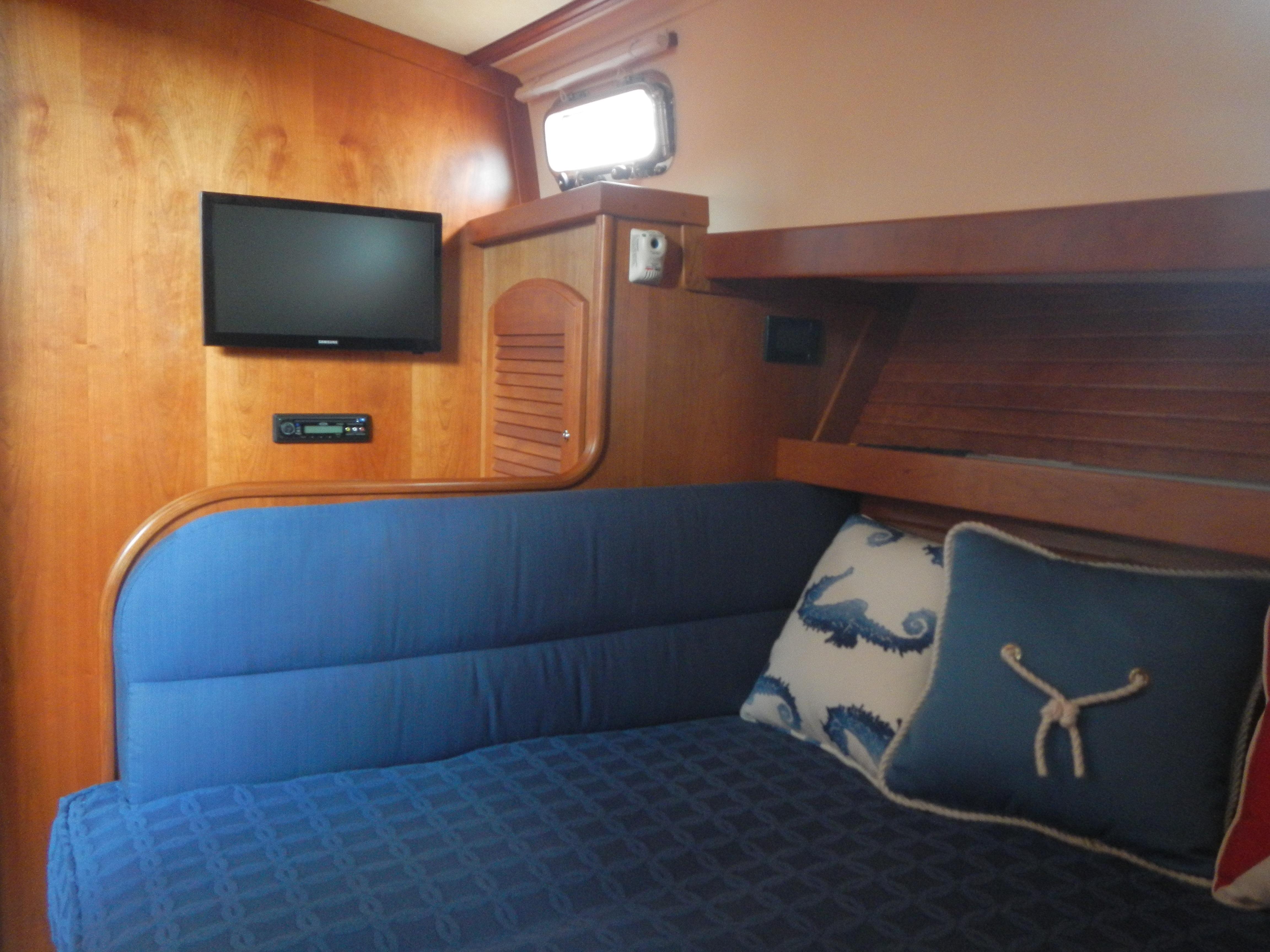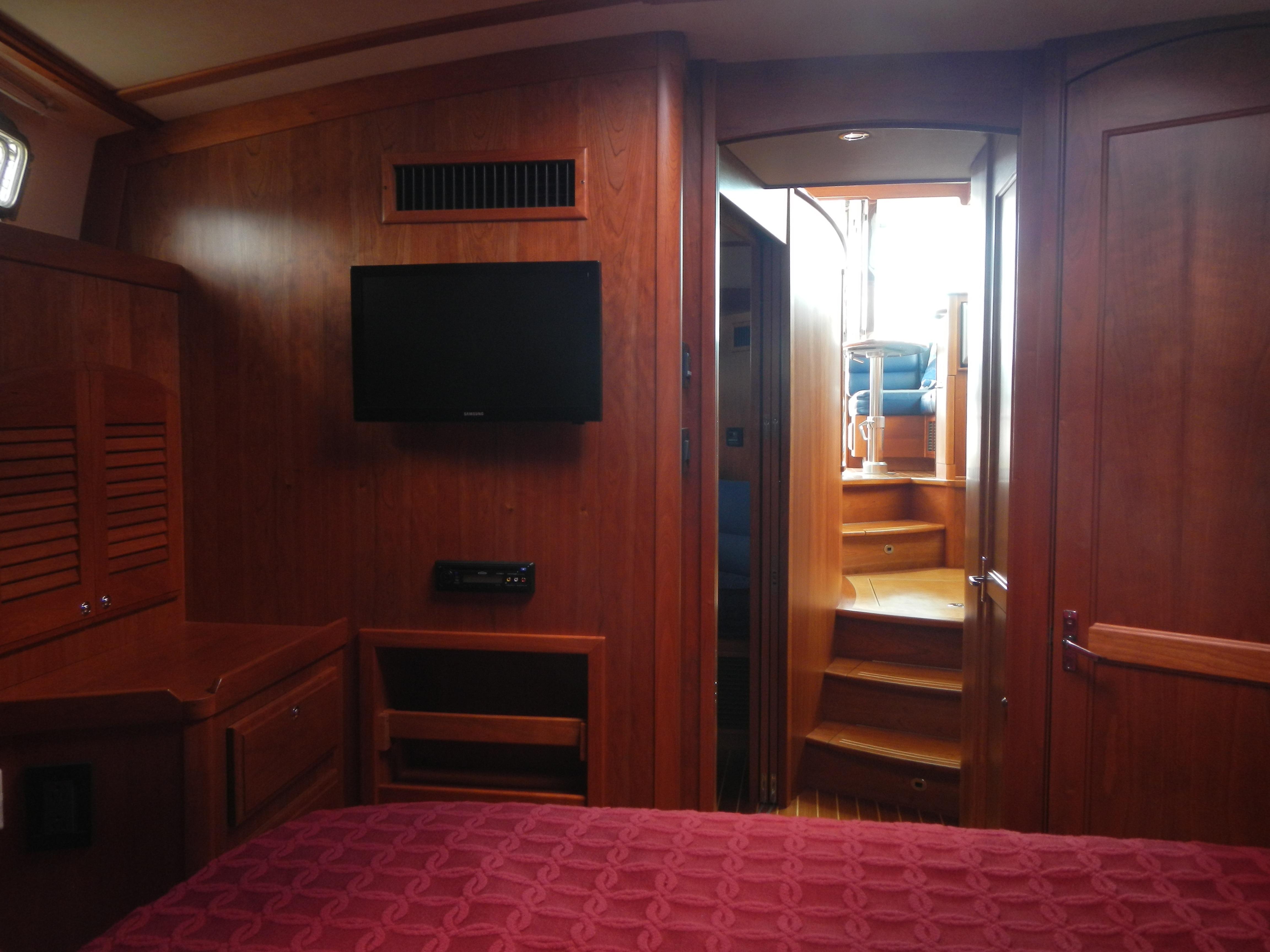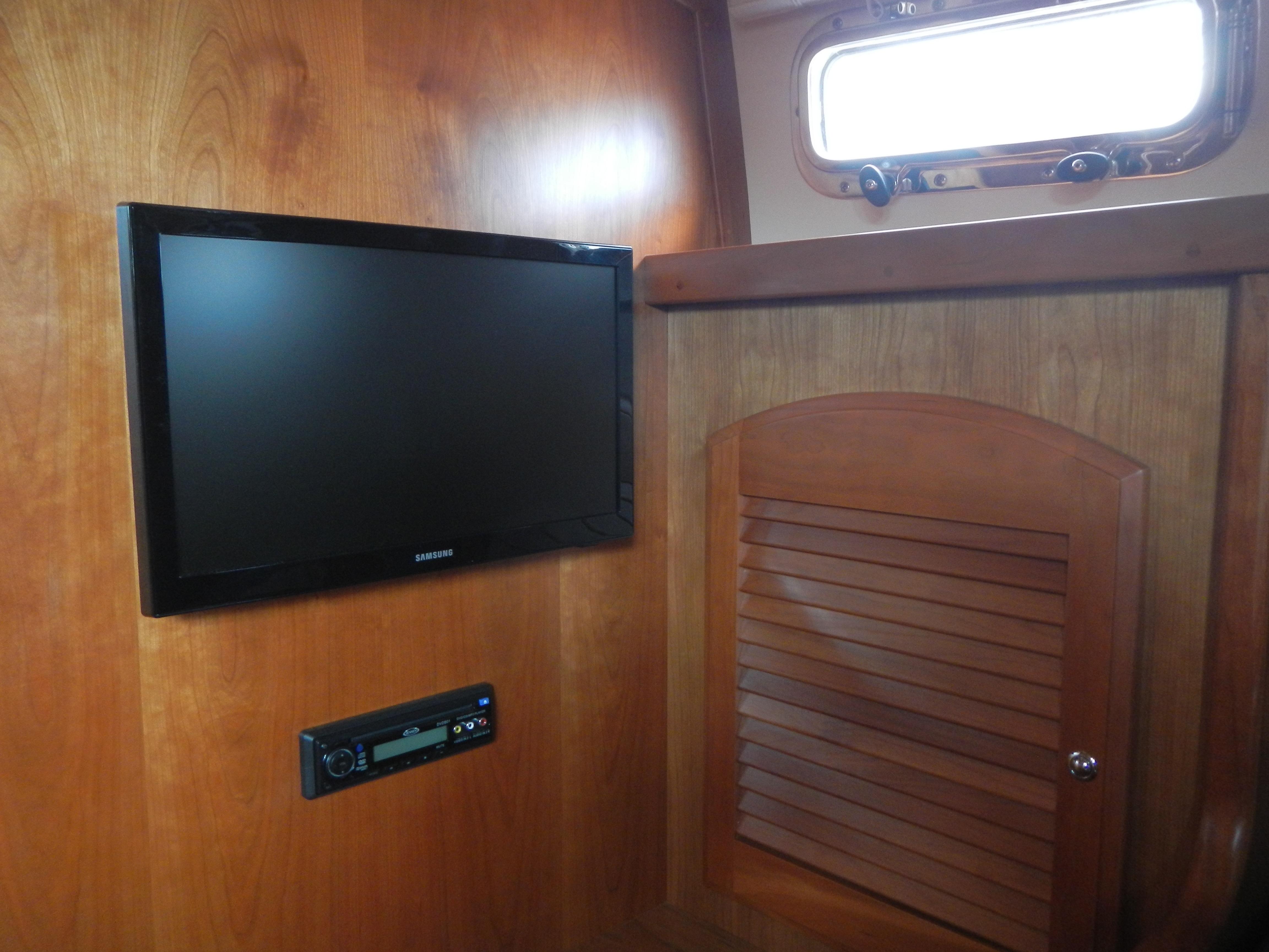 Recessed shelf with fiddle on starboard main bulkhead with 19" flat screen TV and DVD player;