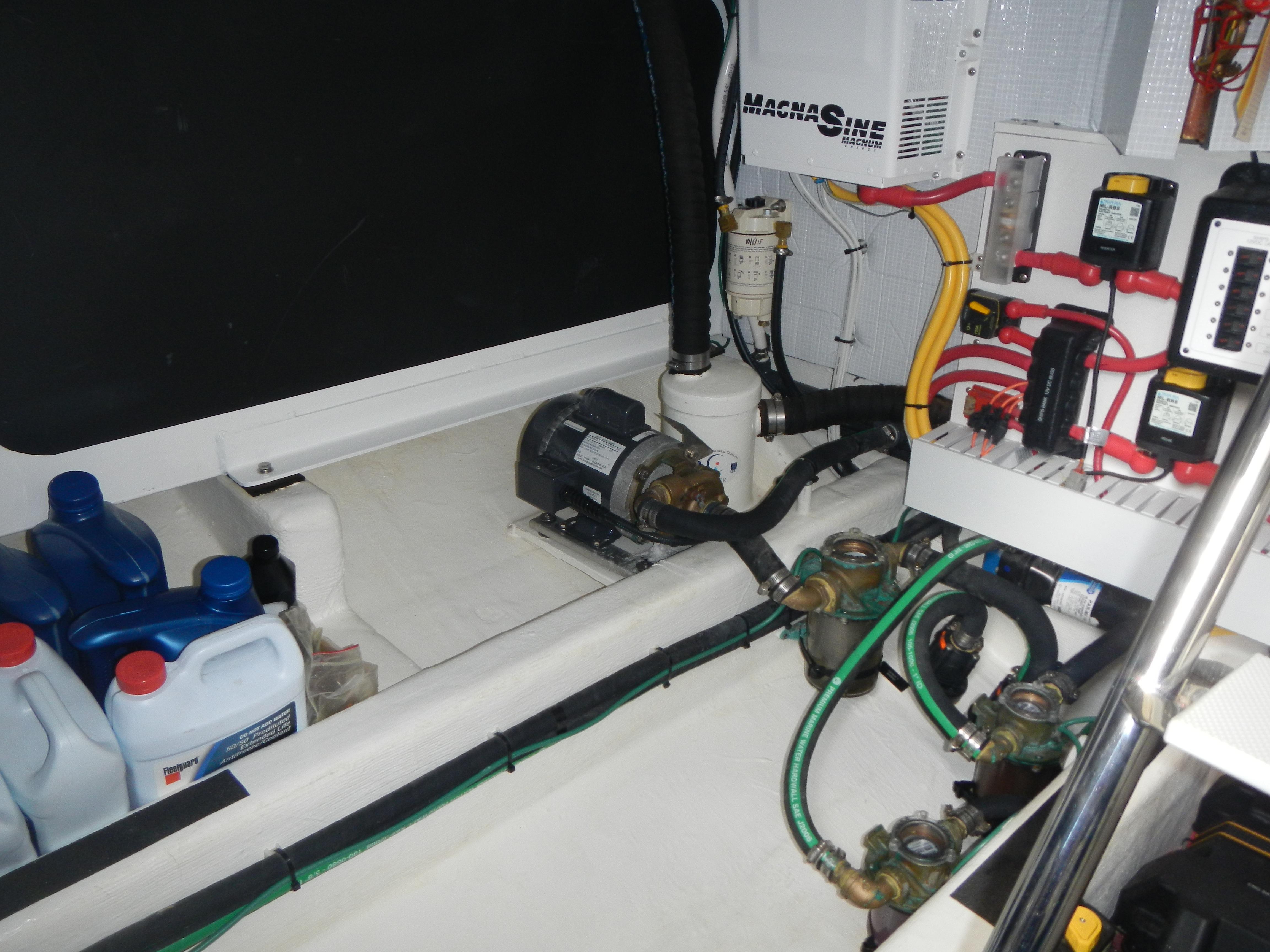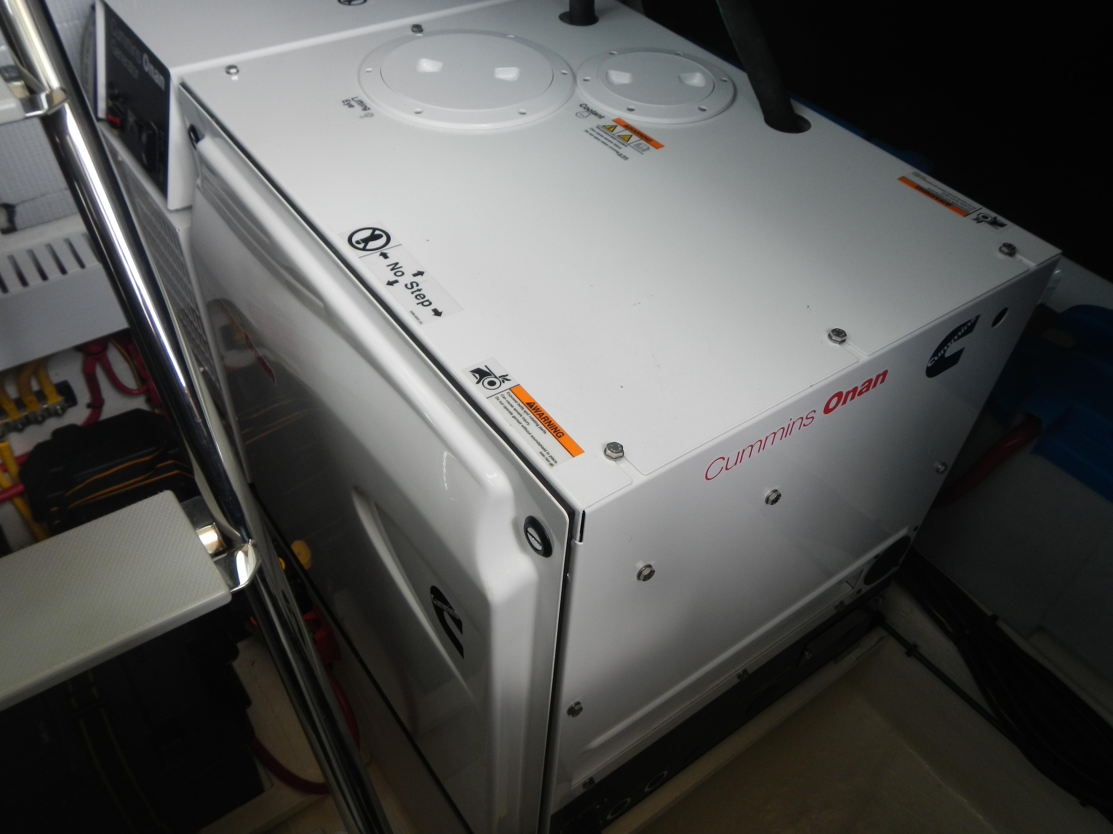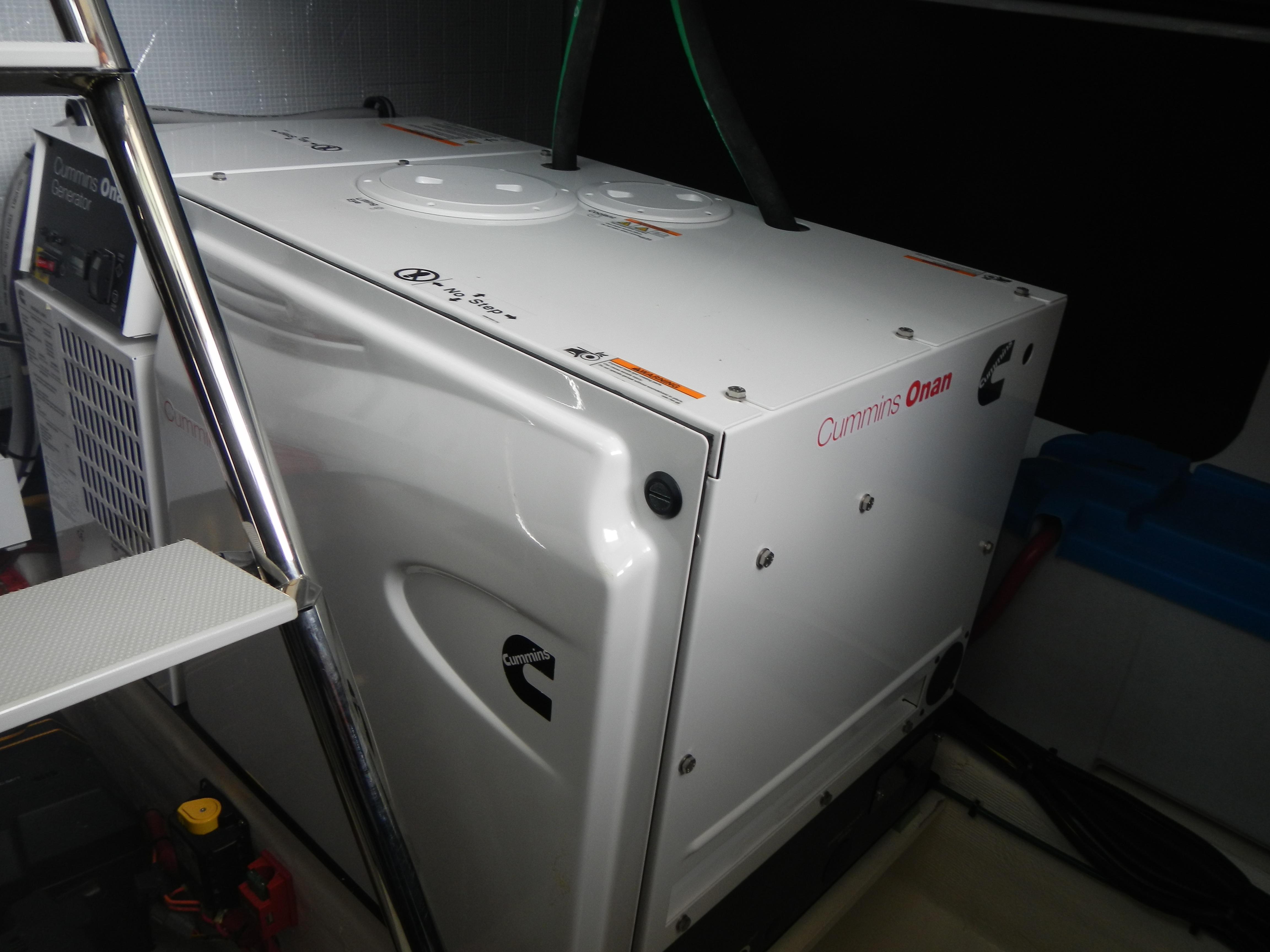 Onan 9.0 kw generator including: interface to Cummins VesselView Display, dedicated start battery, water lift muffler, cooling water intake strainer, sound shield, transfer switch.