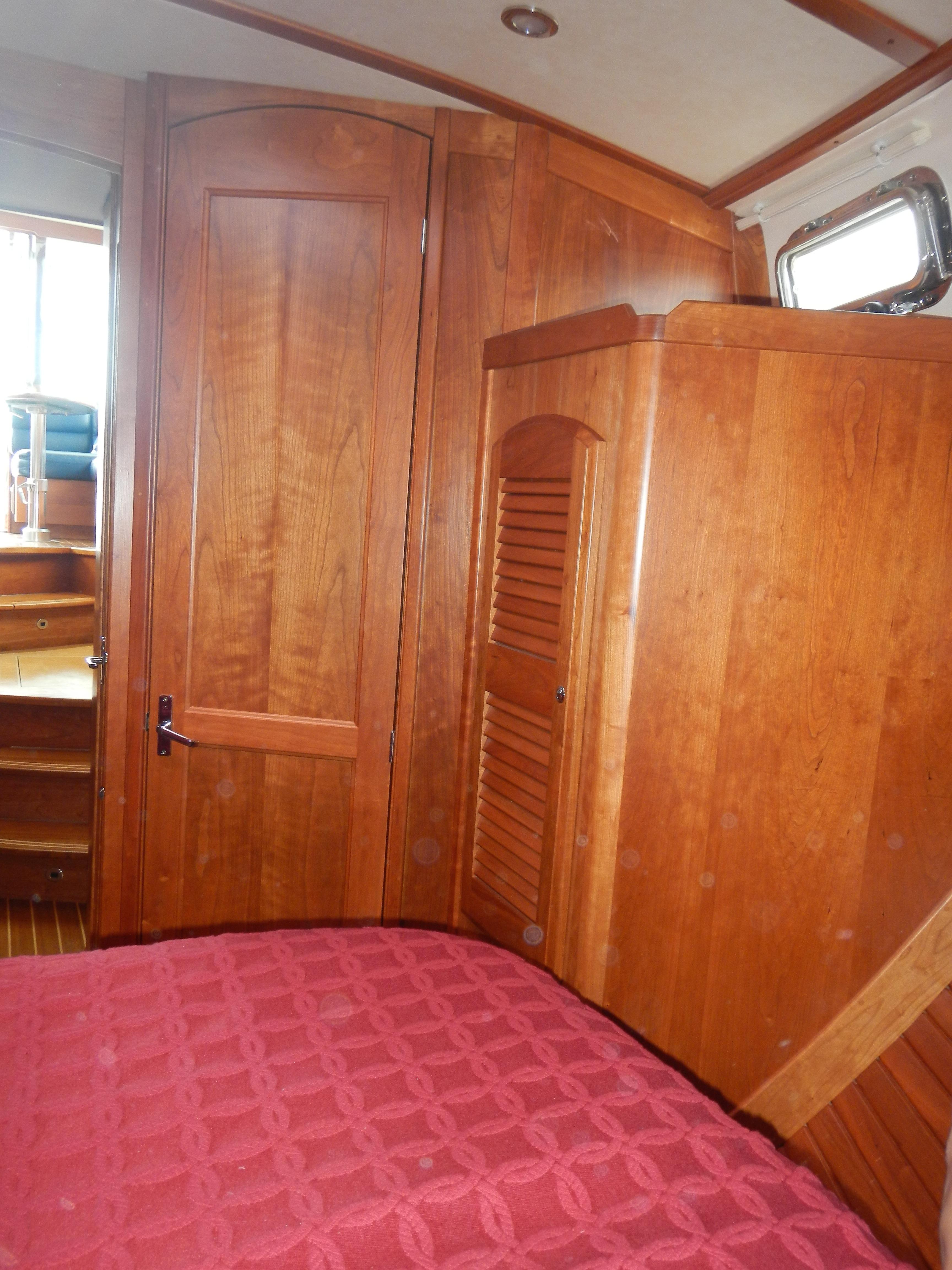 Large cedar lined hanging locker to port, with louvered door, shelf and hanger pole;
