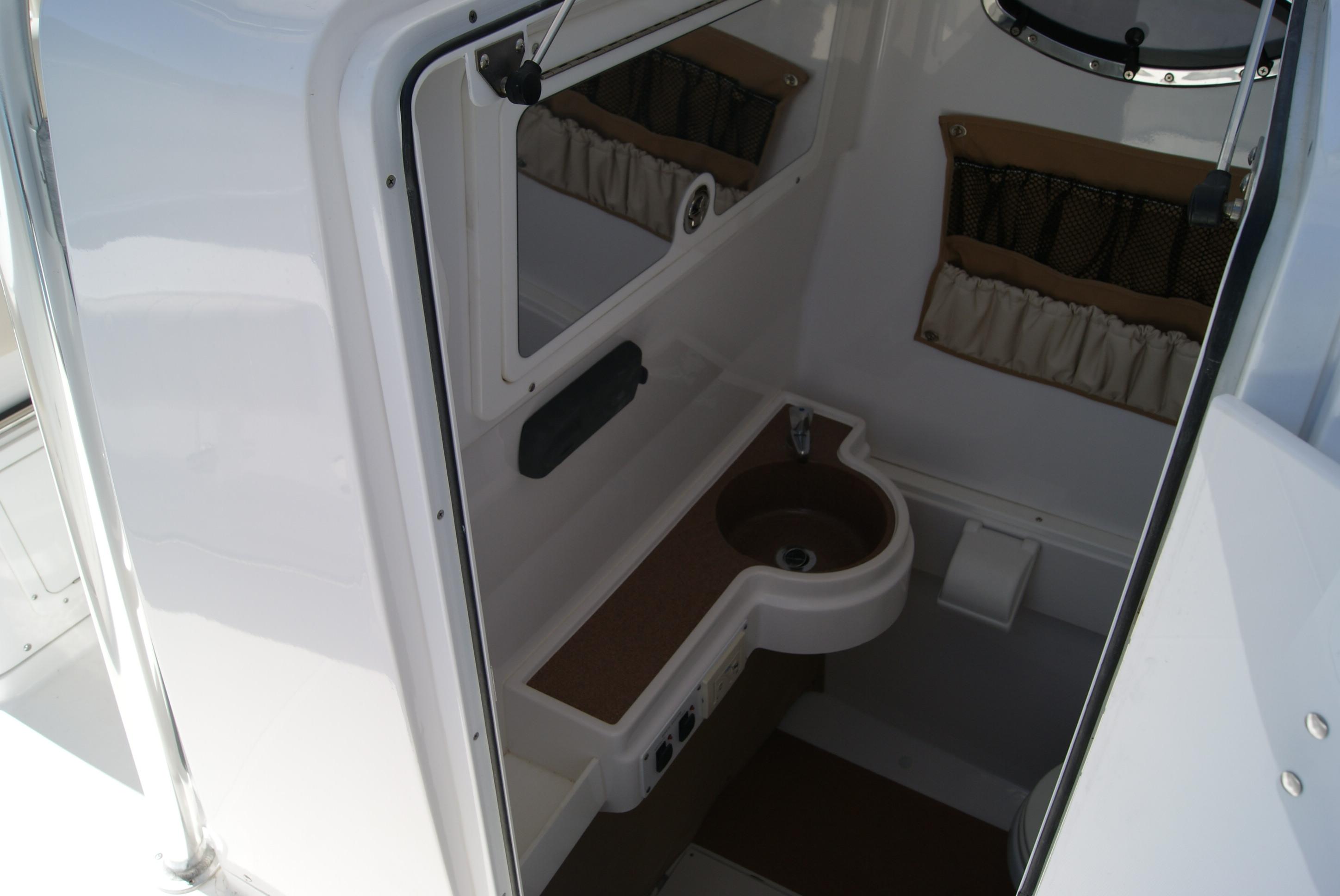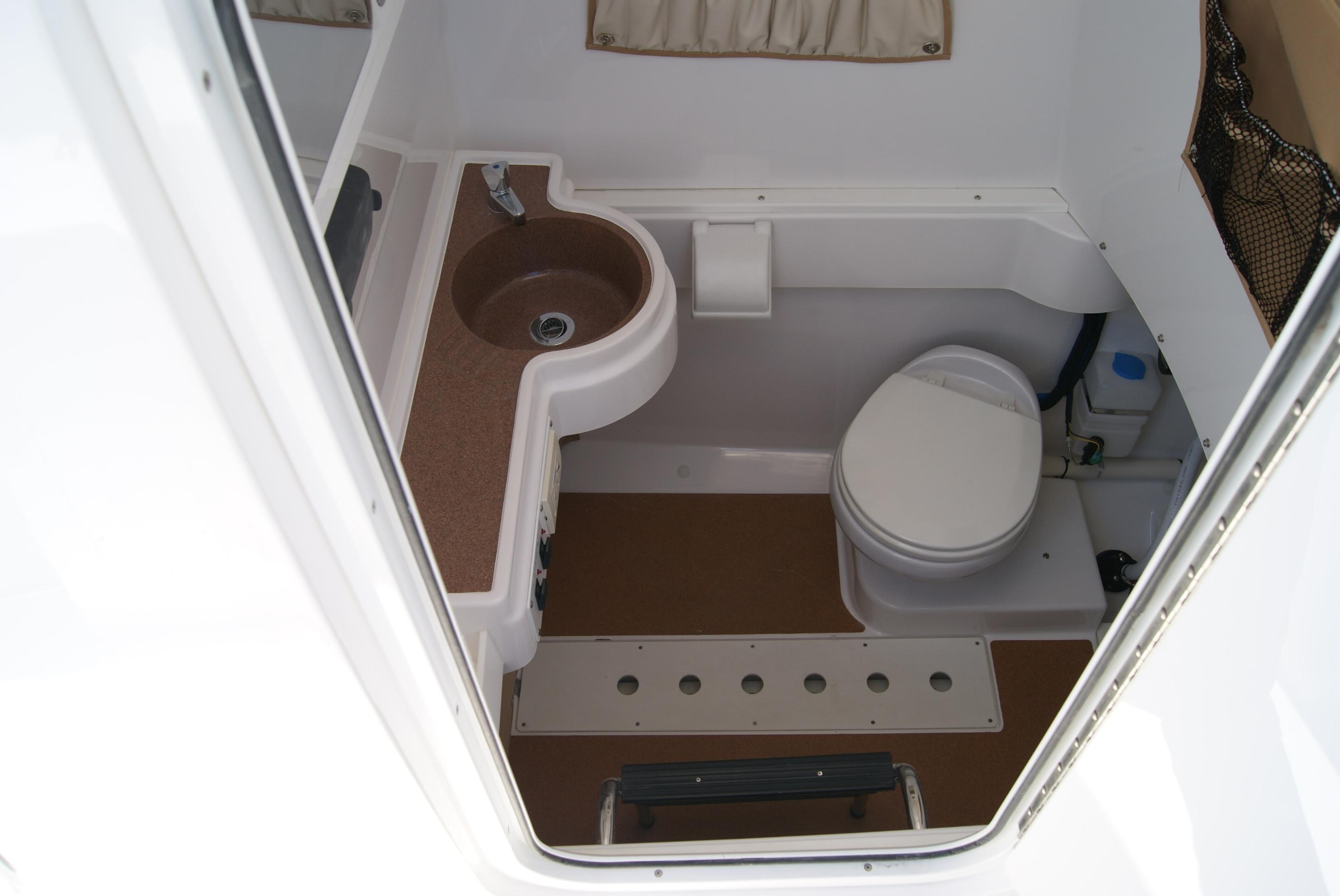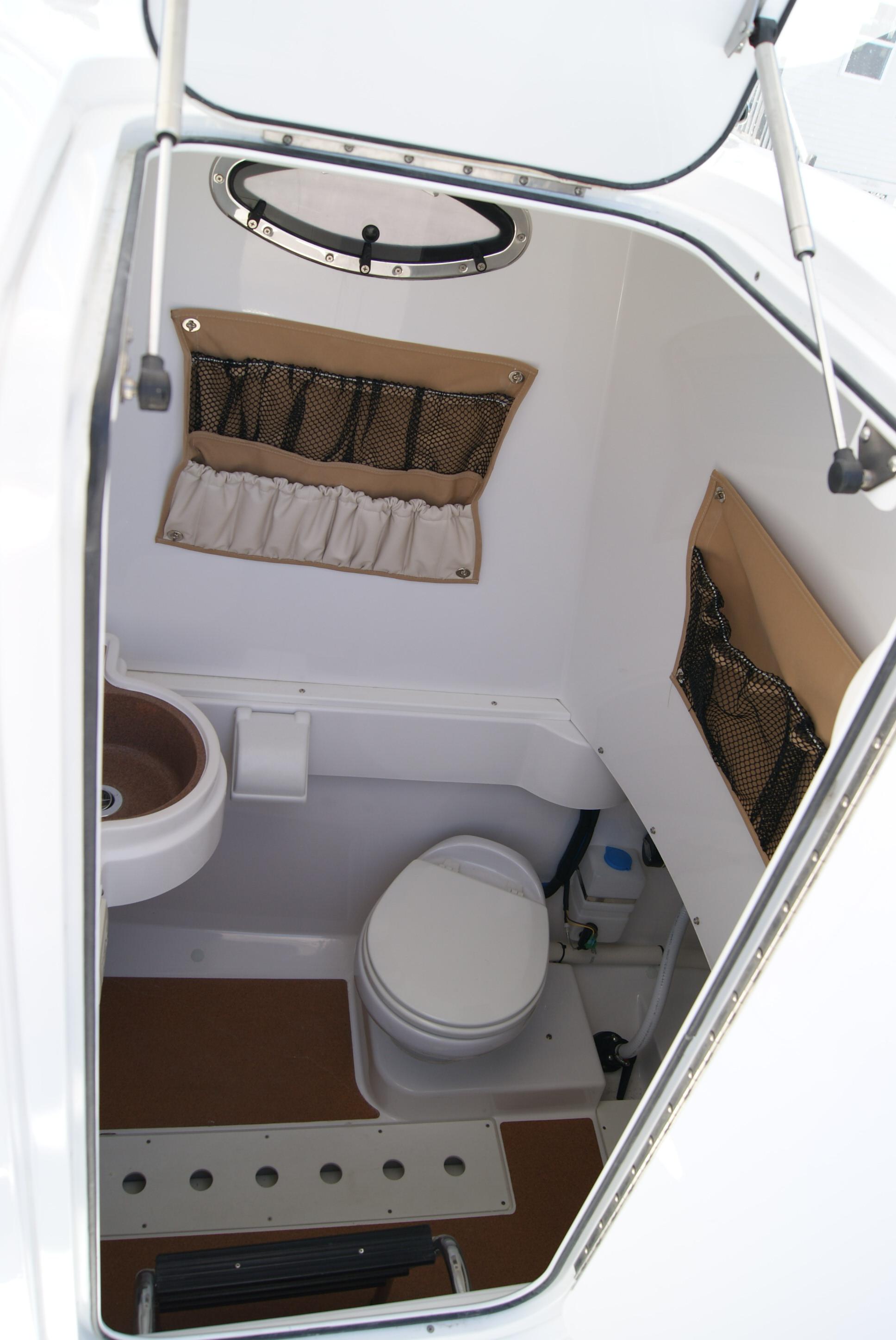 Amenities include, Vac-u-flush freshwater head, forward table with seating, upgraded helm chairs, and aft bench seat.
