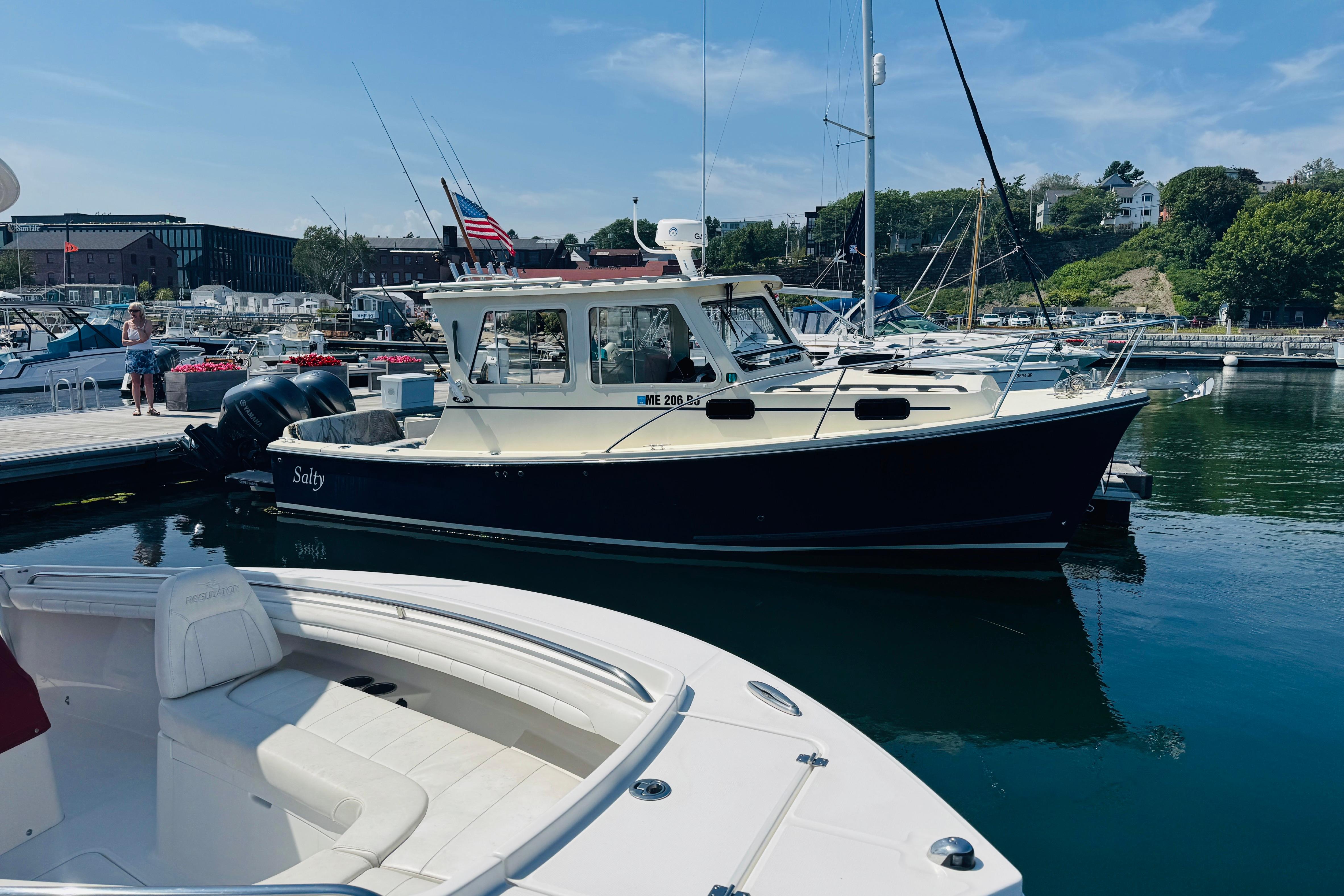 2015 Eastern 270 Islander boat docked in a marina with scenic background.