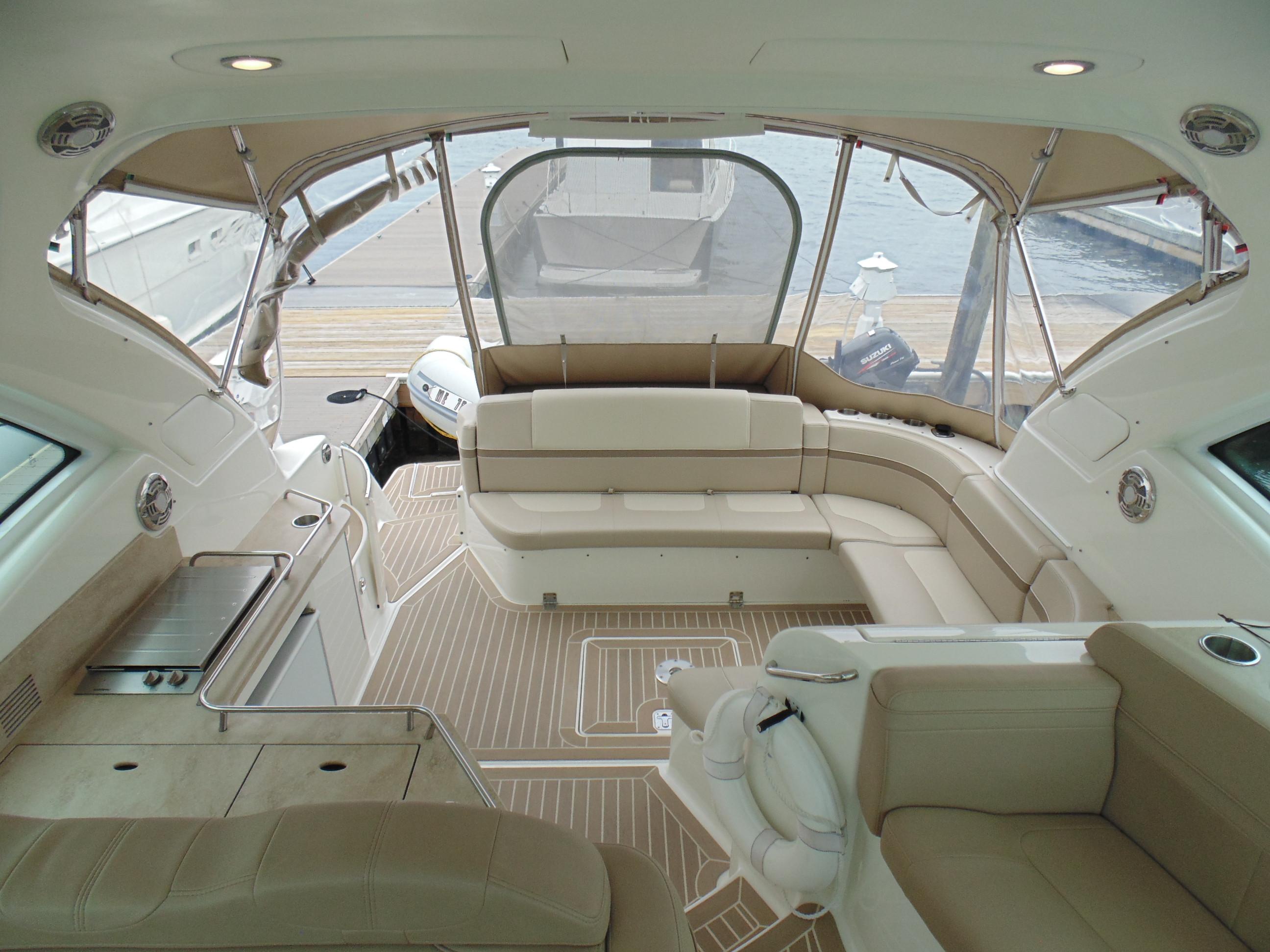 Forward cockpit drop curtain and aft curtain enclosure w/easy-mount zipper connections in color-coordinated non-fading Sunbrella acrylic fabric w/SeaMark™ vinyl undercoating