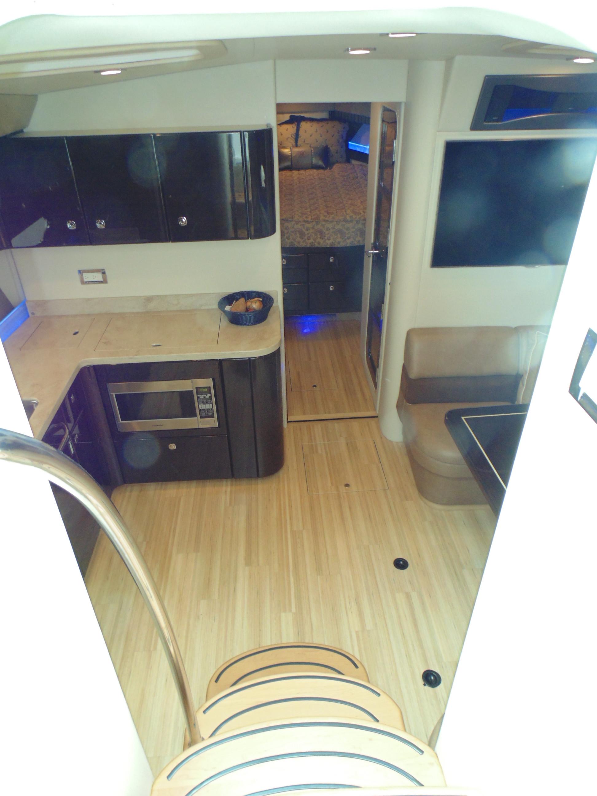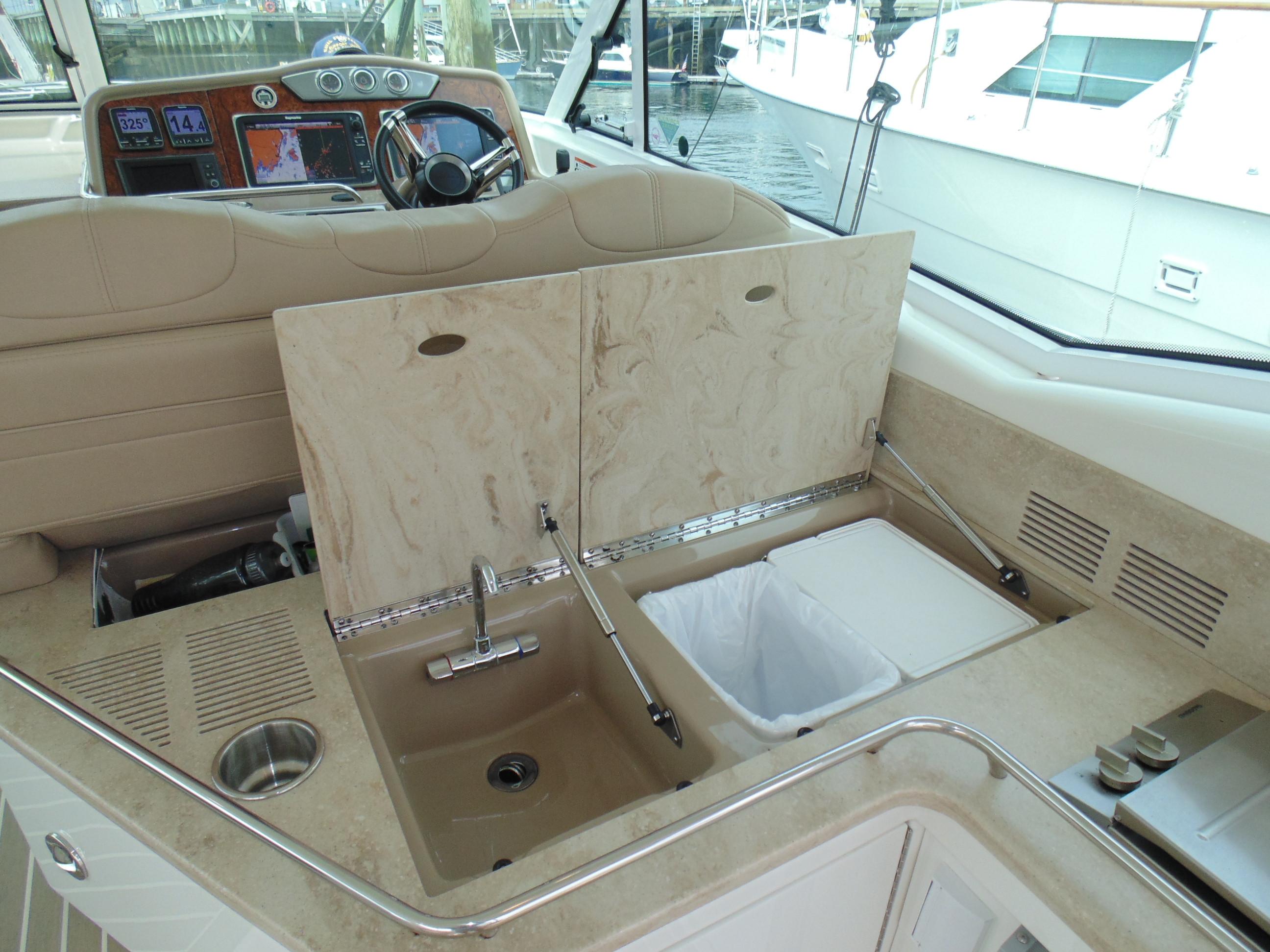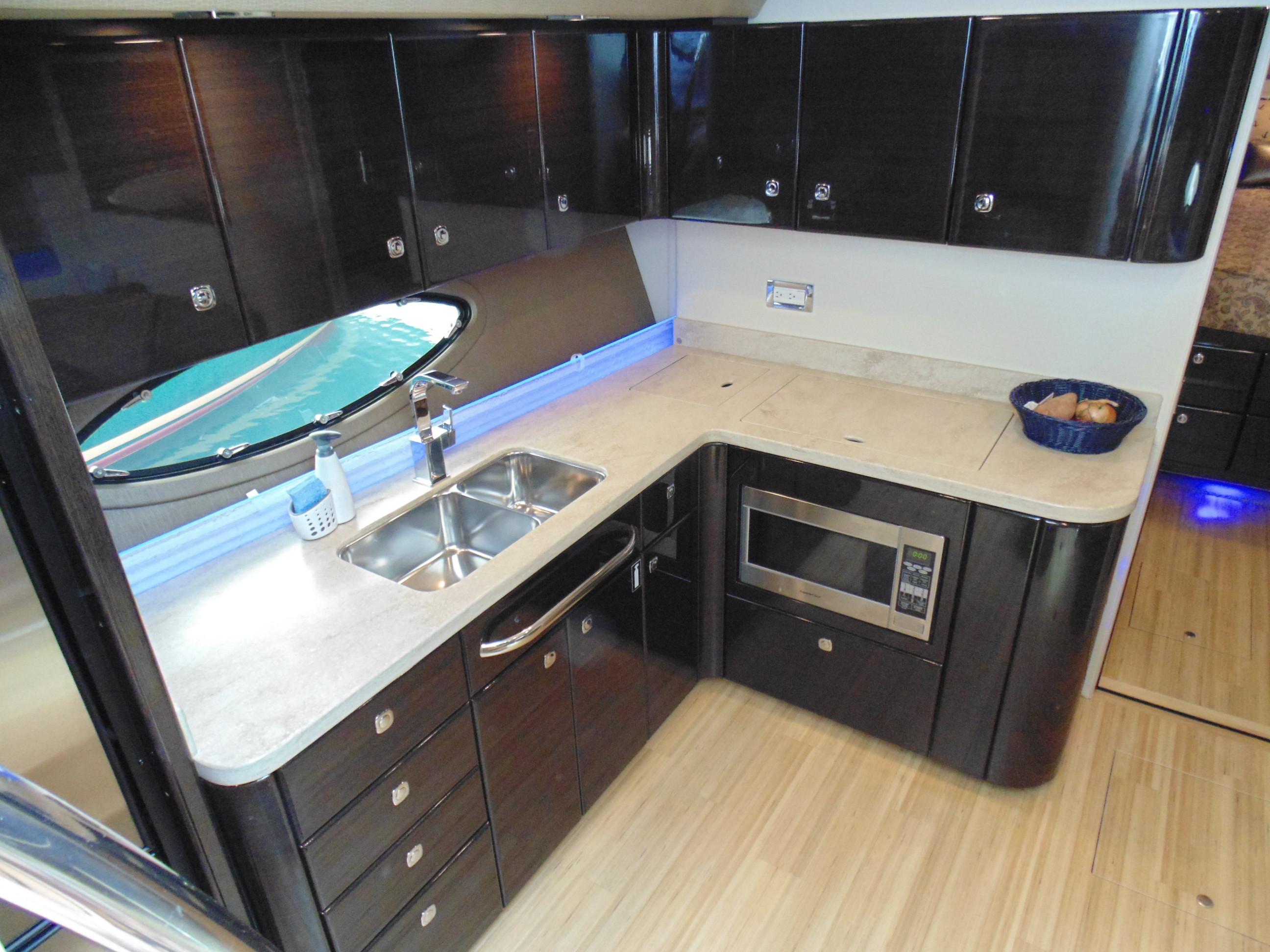 L-shaped galley w/high-gloss Deep Cherry finish cabinetry, dovetailed hardwood drawers, full Corian countertop, double-bowl stainless steel sink w/swivel faucet, 2-burner electric stove w/flush Corian cover & safety shut-off switch, exhaust fan, brushed stainless steel convection/ microwave oven, Krups® coffee maker, 120V/12V upright refrigerator/freezer w/brushed stainless panels & concealed in-counter trash container