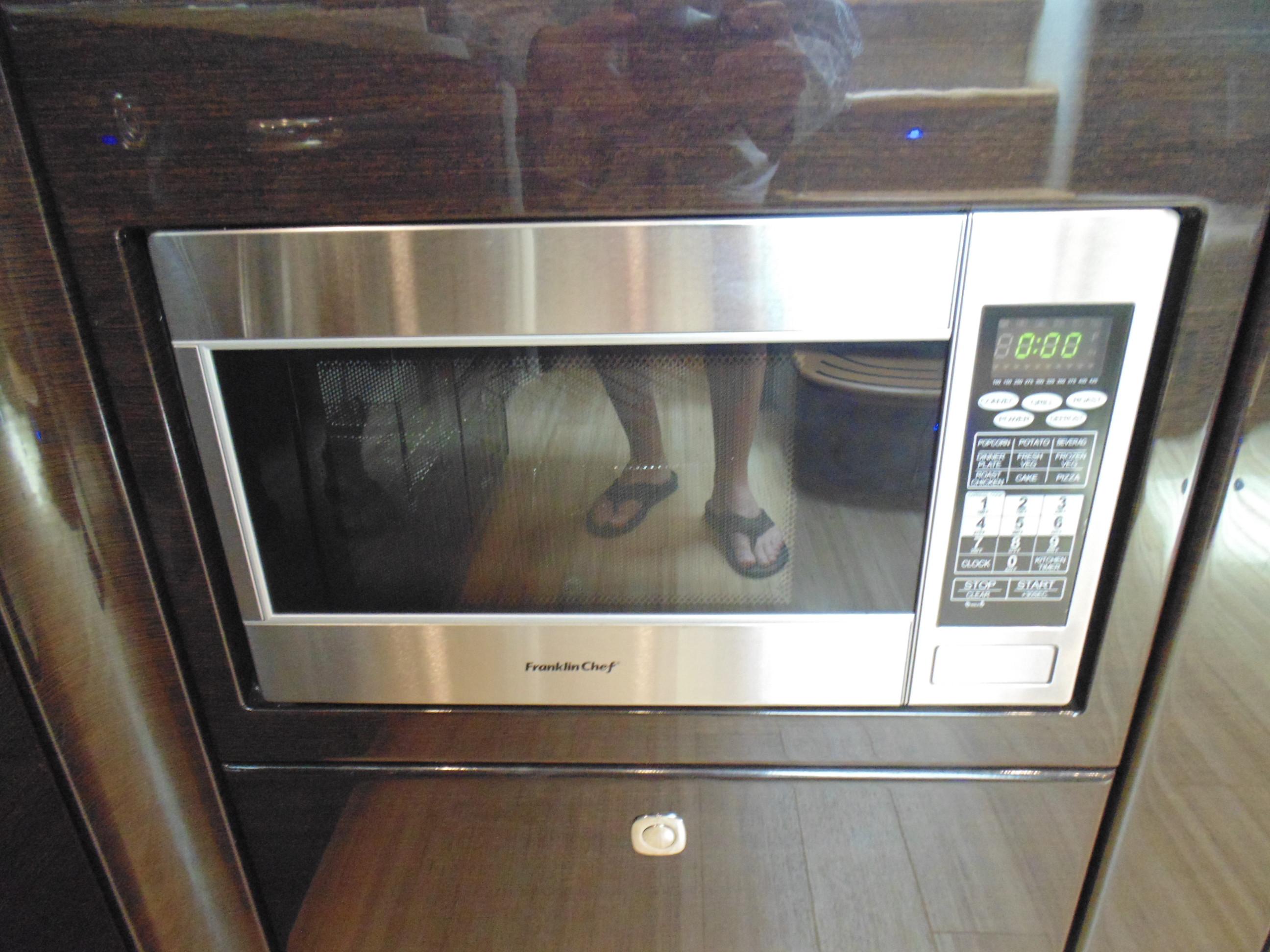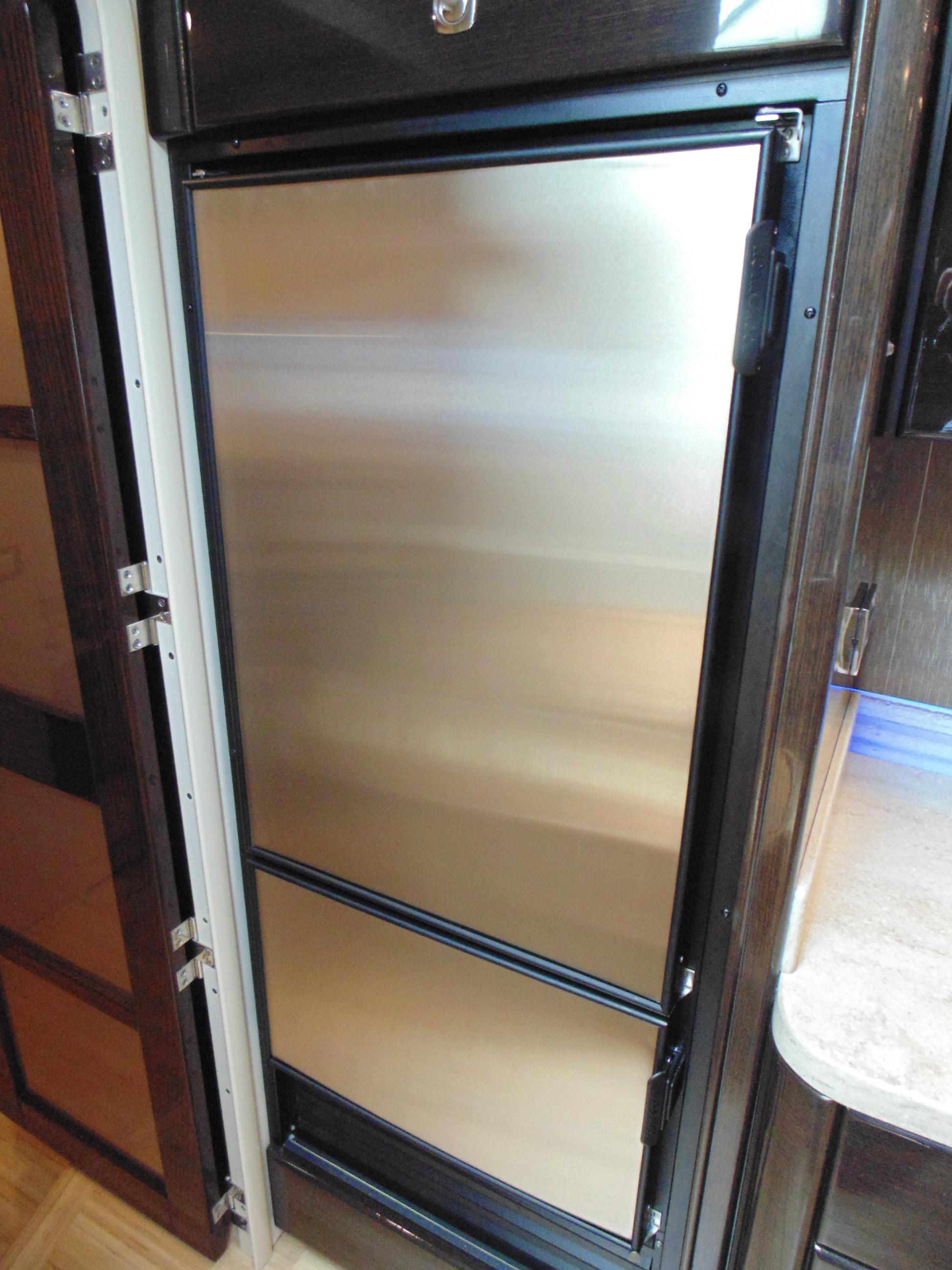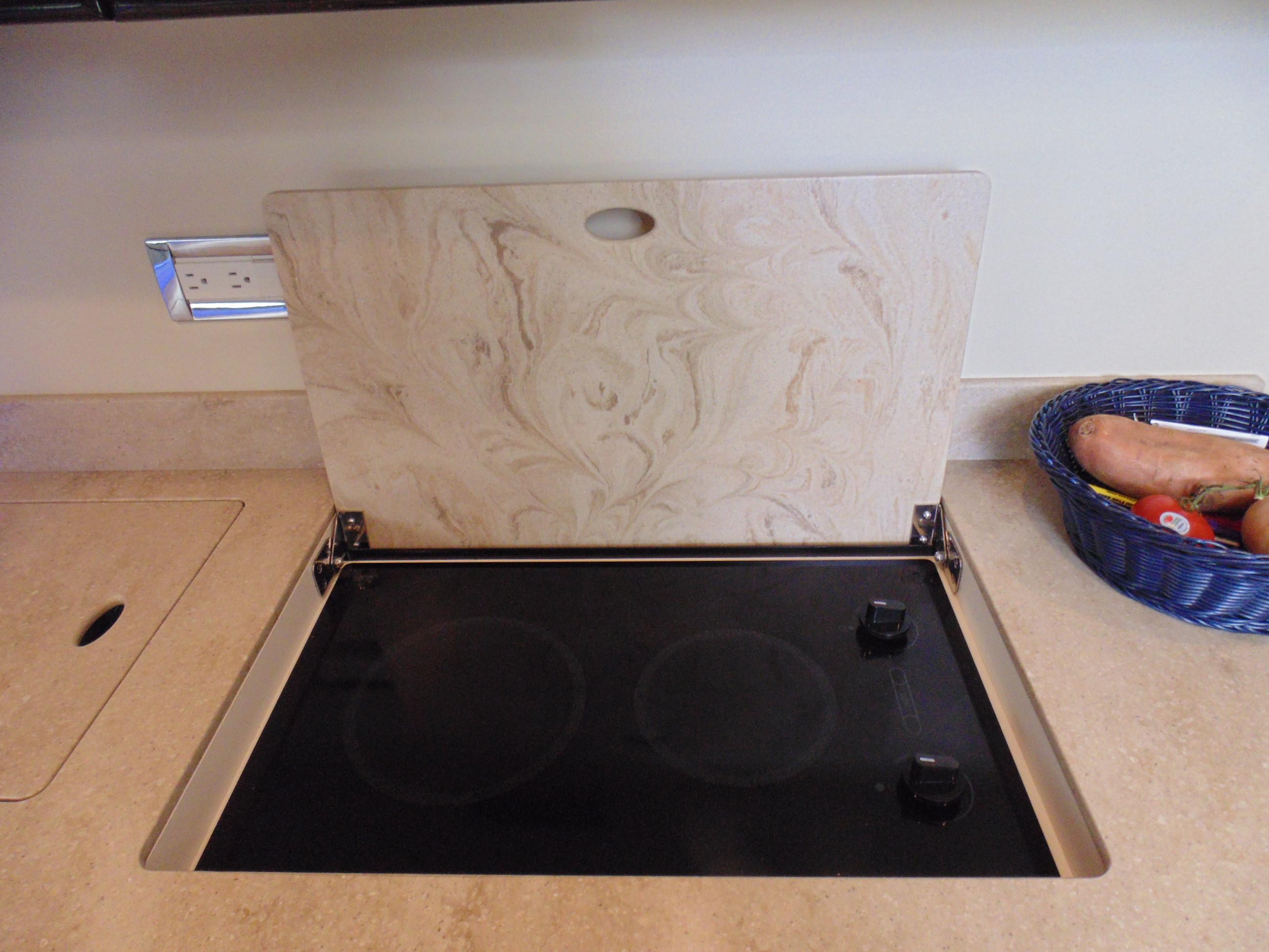 L-shaped galley w/high-gloss Deep Cherry finish cabinetry, dovetailed hardwood drawers, full Corian countertop, double-bowl stainless steel sink w/swivel faucet, 2-burner electric stove w/flush Corian cover & safety shut-off switch, exhaust fan, brushed stainless steel convection/ microwave oven, Krups® coffee maker, 120V/12V upright refrigerator/freezer w/brushed stainless panels & concealed in-counter trash container