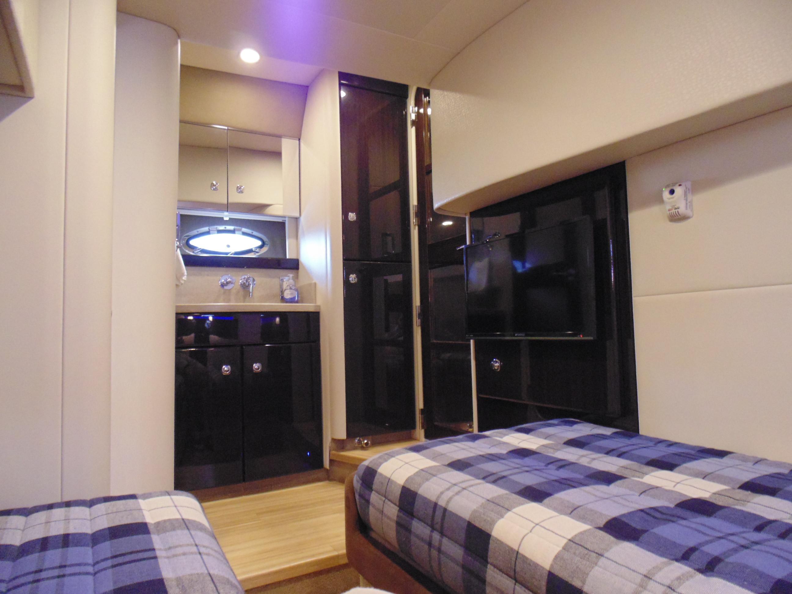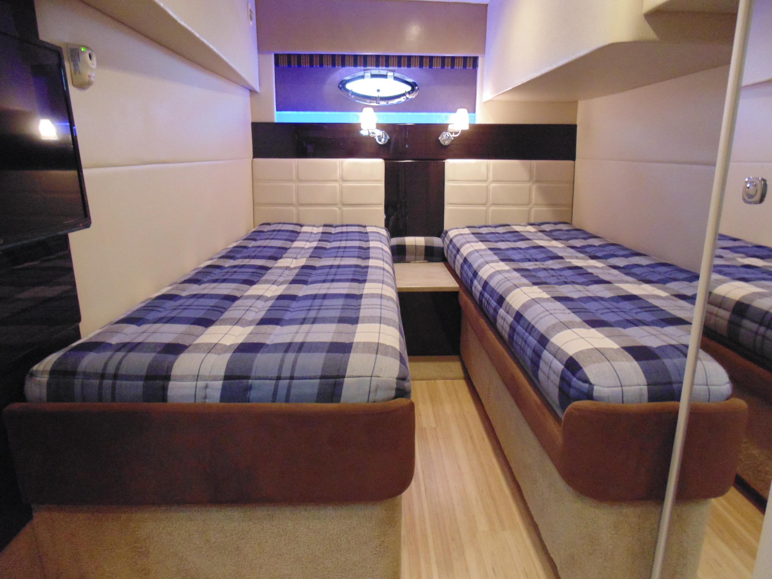 Private guest stateroom w/twin beds–adjust to queen bed w/hideaway filler cushions