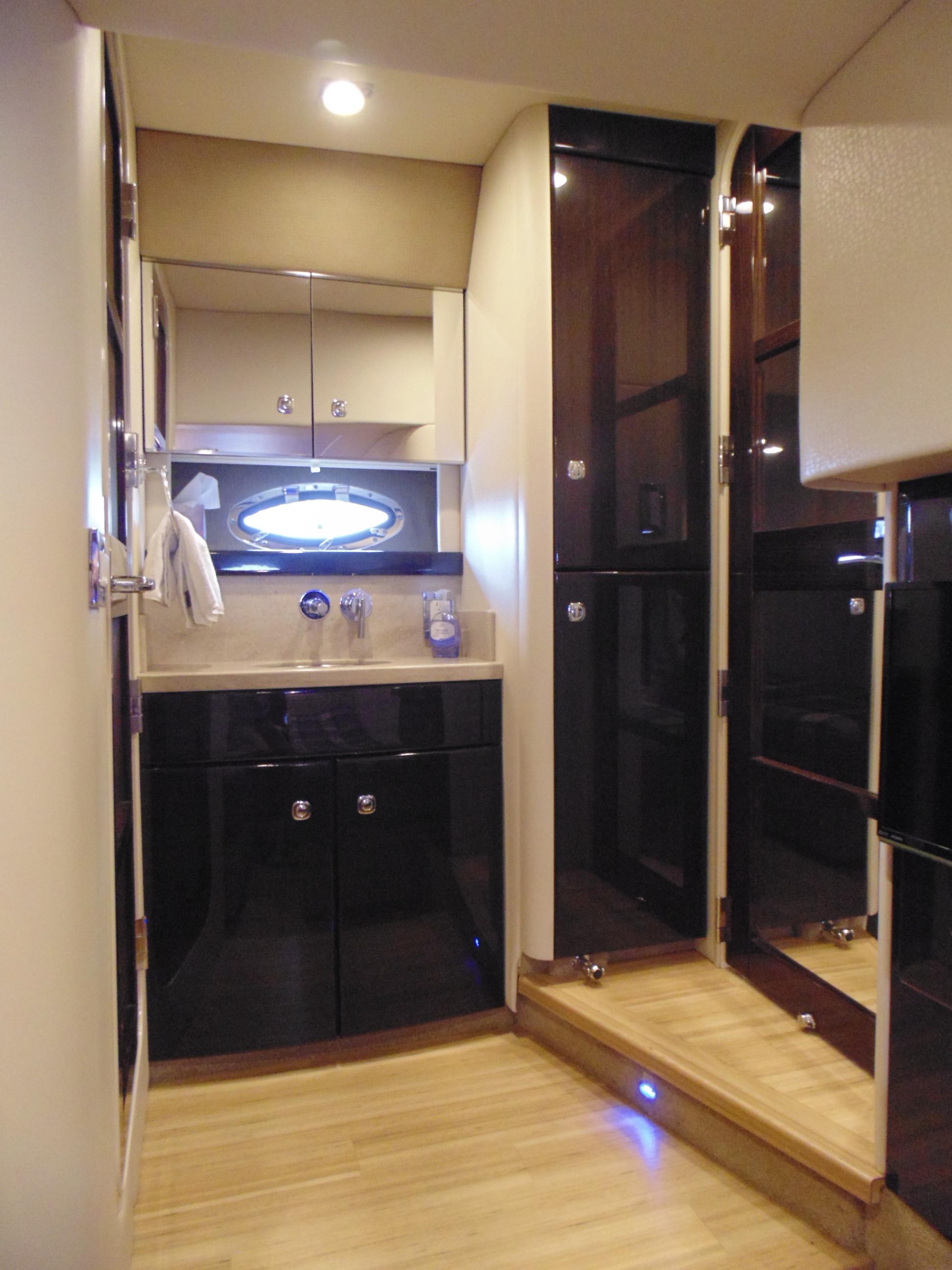Owners’ private head compartment w/contoured, high-gloss Deep Cherry finish vanity, full vanity wall mirror, Corian countertop, vanity drawer, deep custom sink w/wall-mount faucet, overhead cabinetry storage, wall mirror, Corian flooring, exhaust fan and porcelain Flush and Forget® VacuFlush® head unit w/holding tank & dockside pumpout