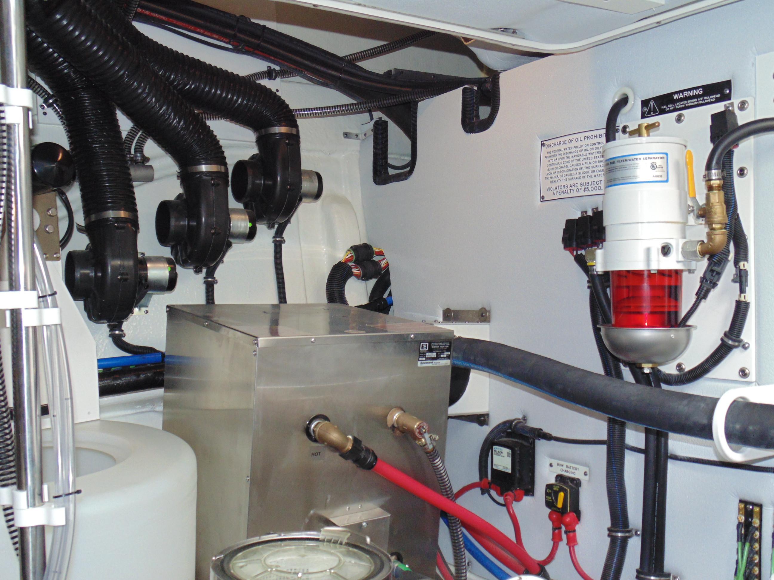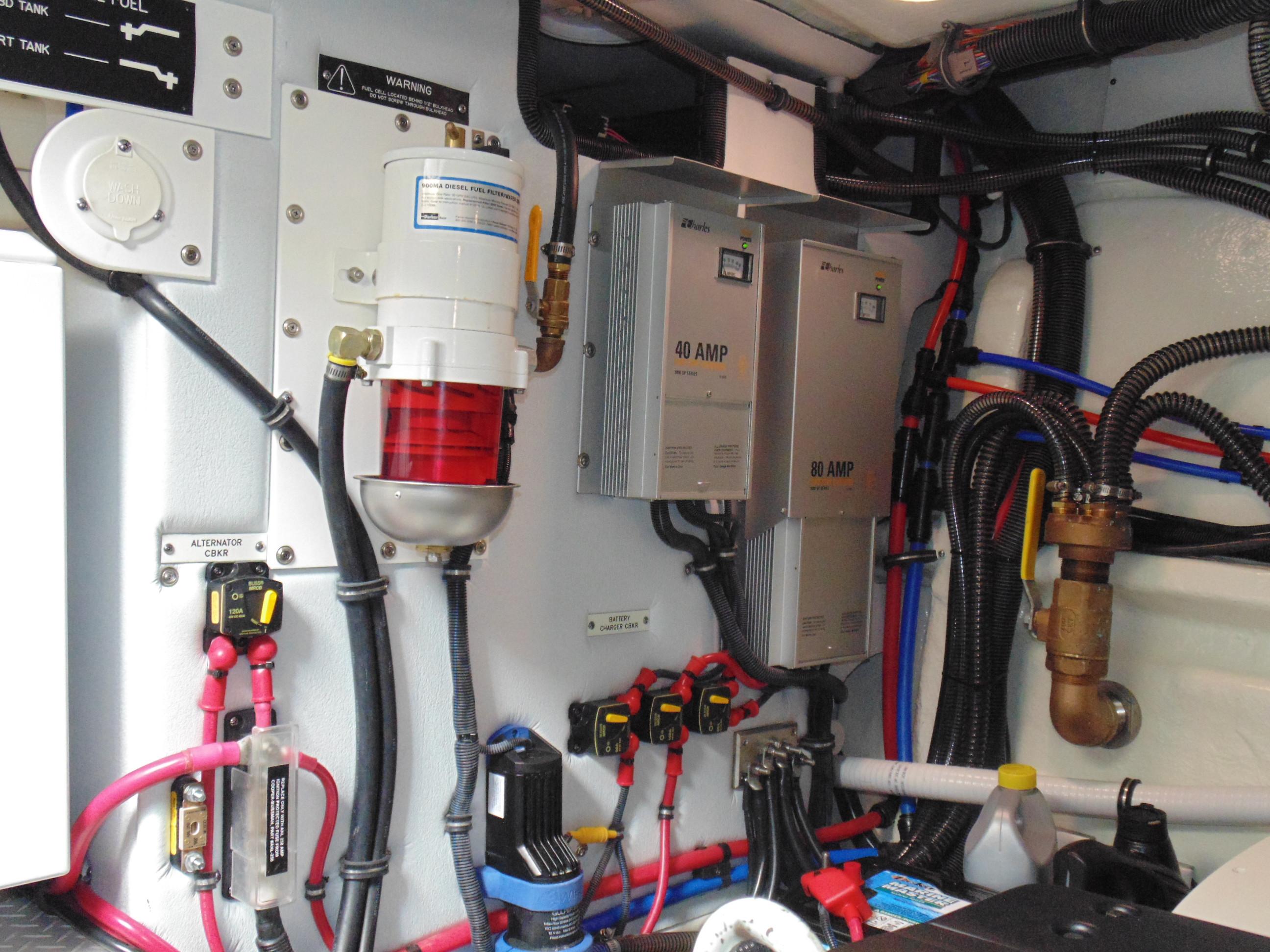 Operating systems electrical panel w/courtesy lights, 120V & 12 V monitoring panel, remote battery parallel emergency switch, generator control switching & freshwater tank gauge