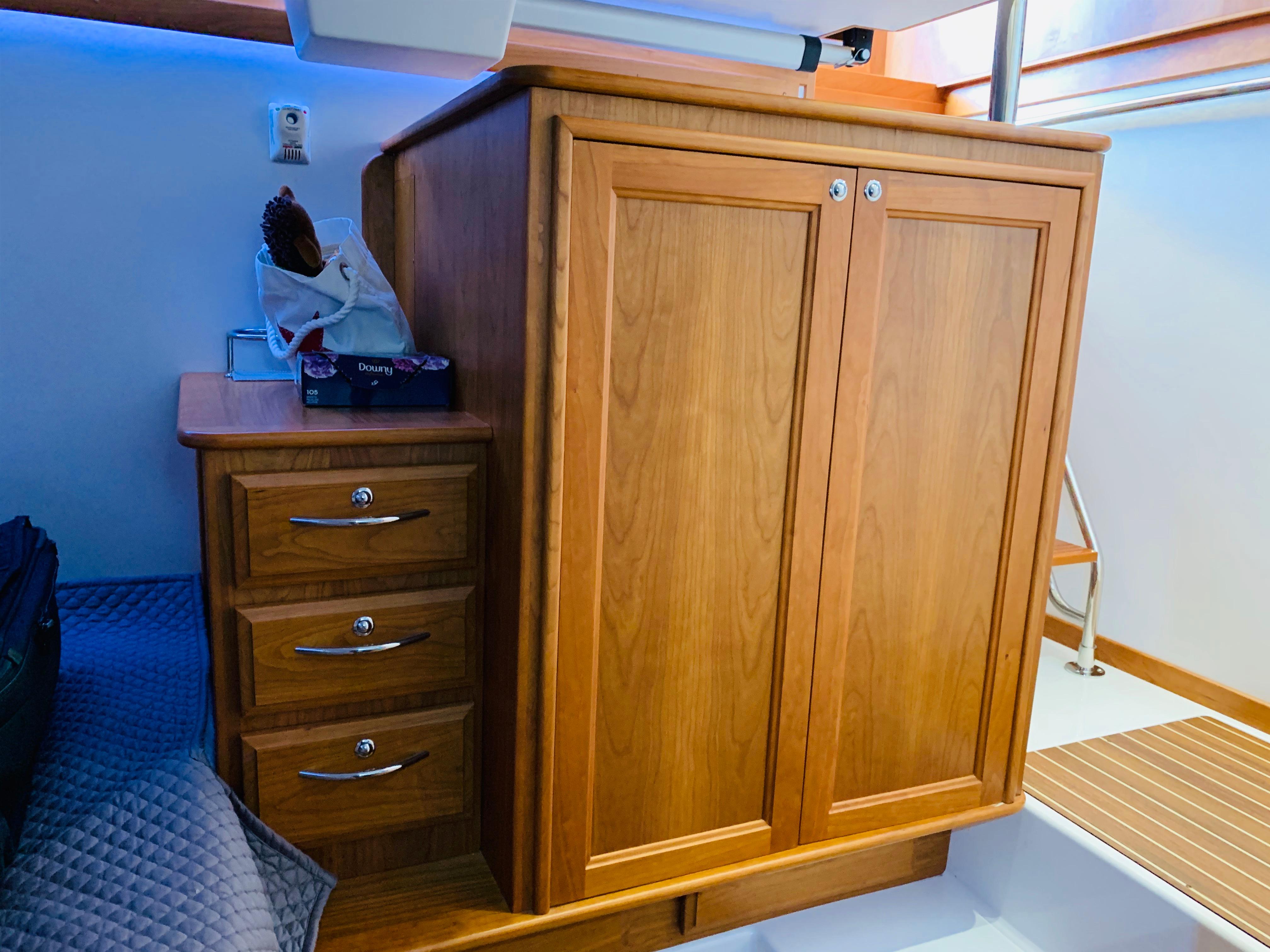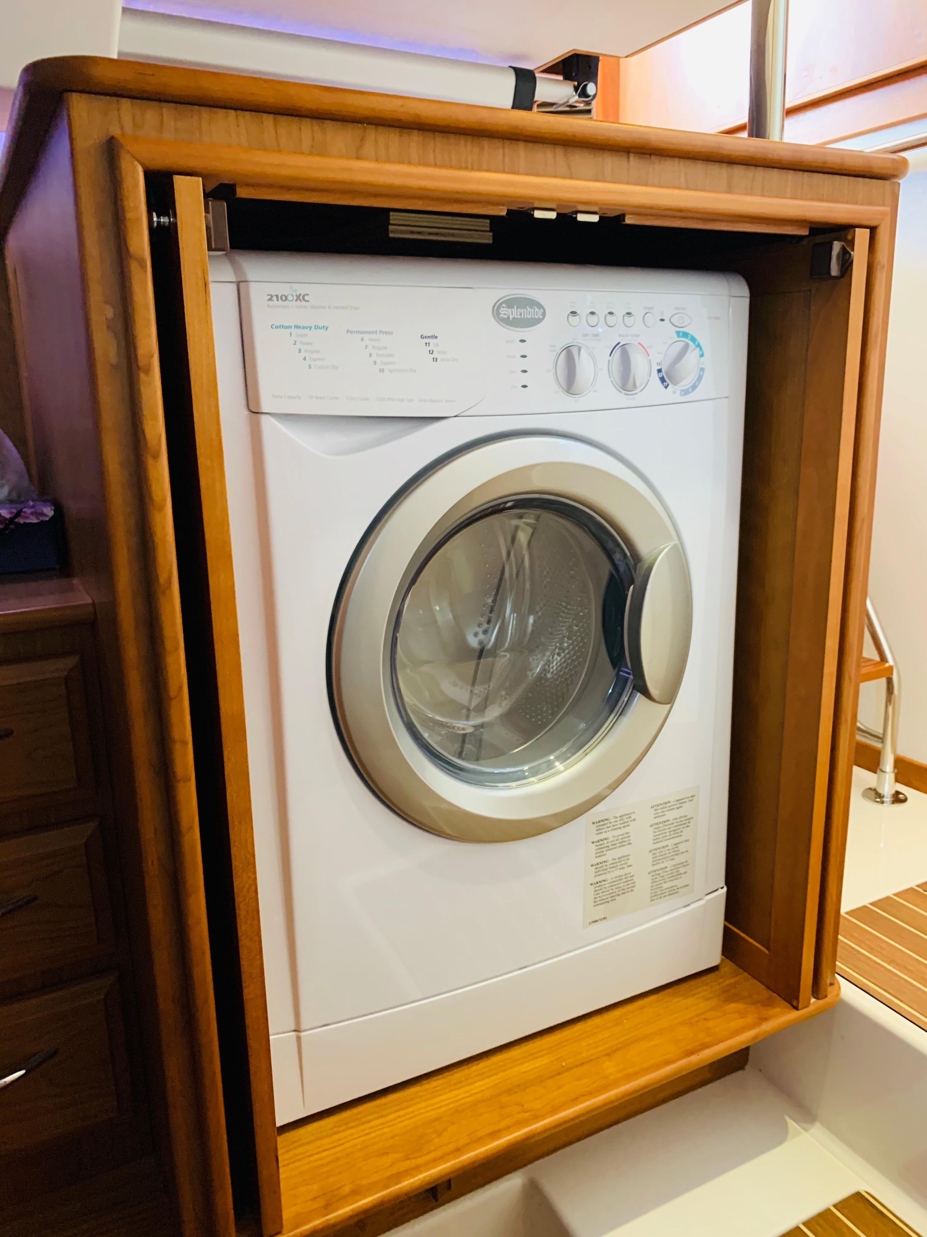 • Install Splendide combo washer/dryer enclosed with cherry cabinet. Washer/Dryer sits down on FRP and inboard next to berth. Cherry top over washer/dryer extends inboard to become top of bureau. Mirror above washer/dryer and bureau. Outlets, to be relocated.