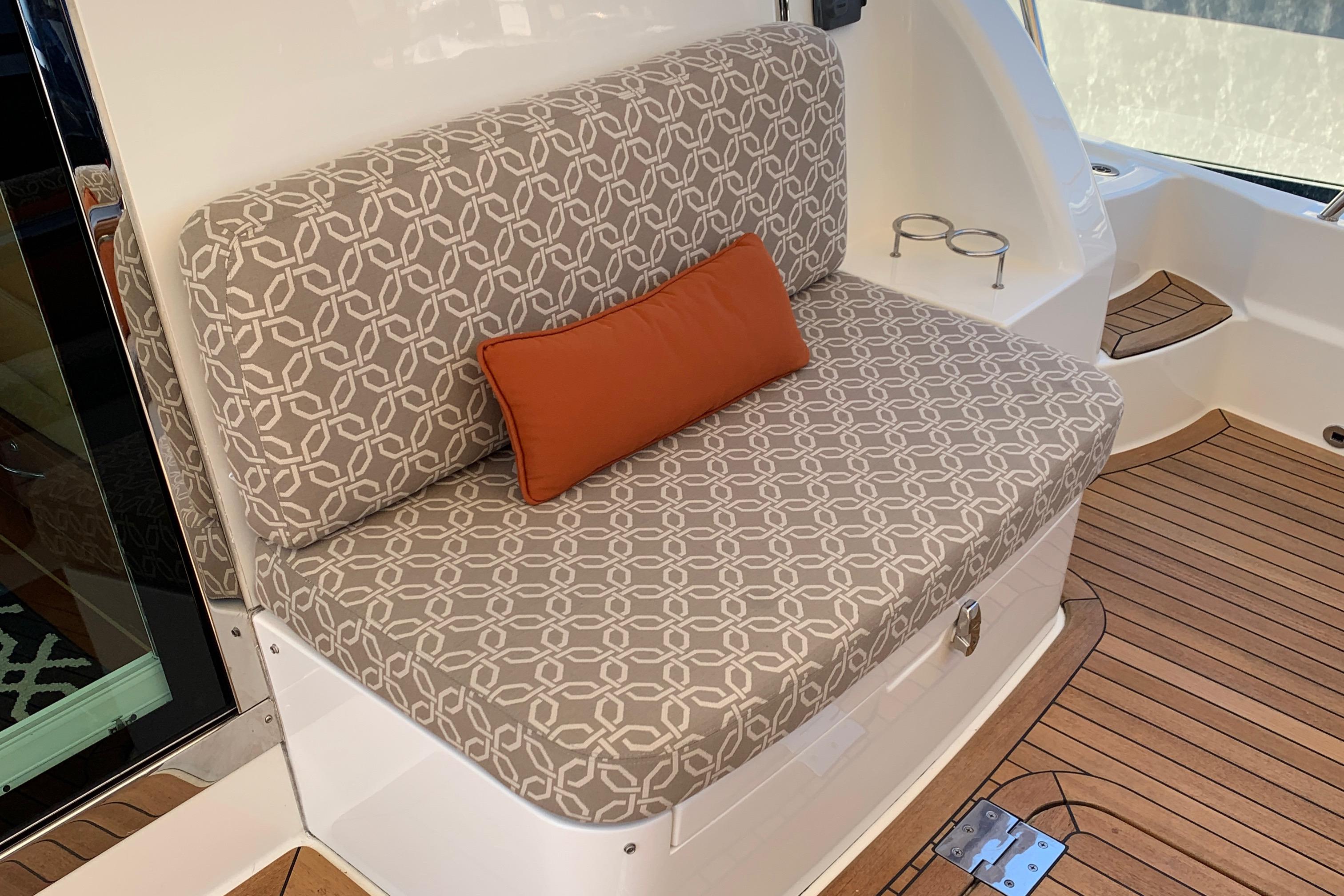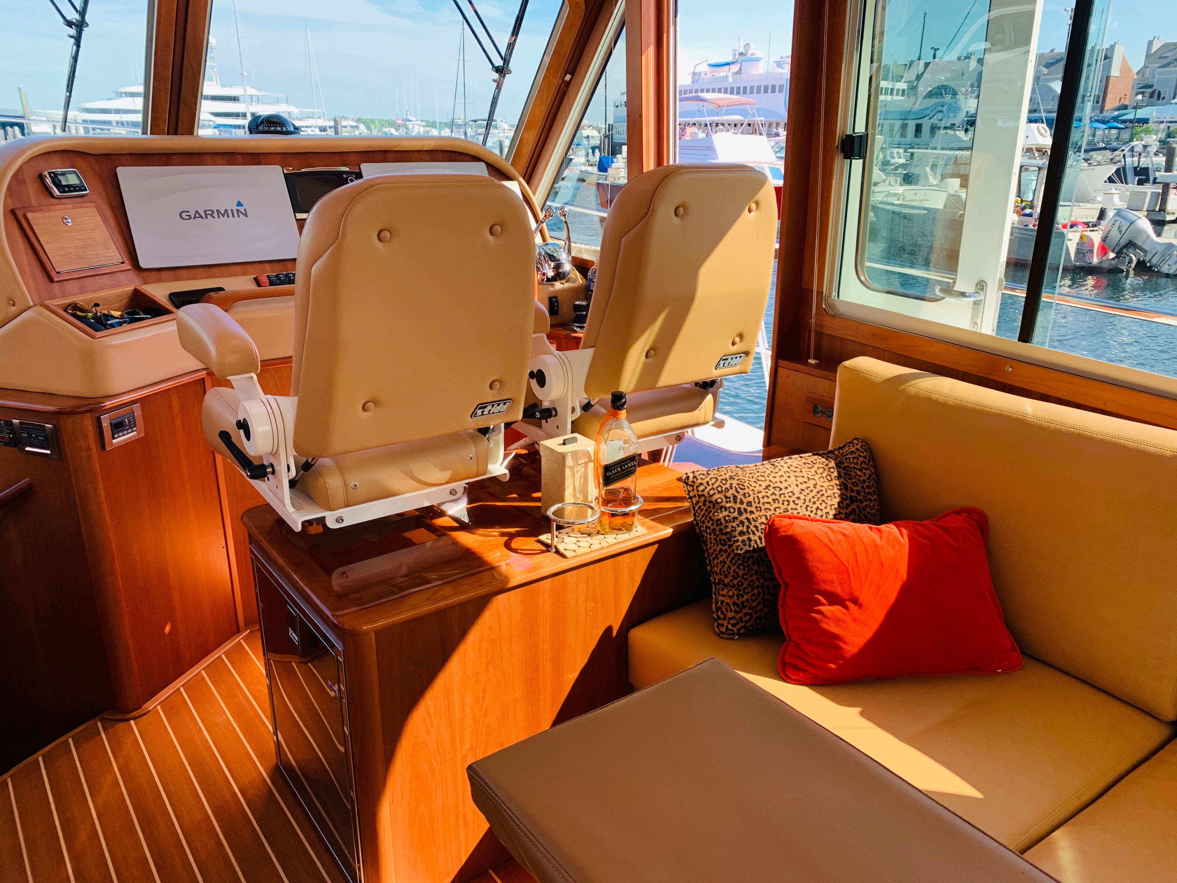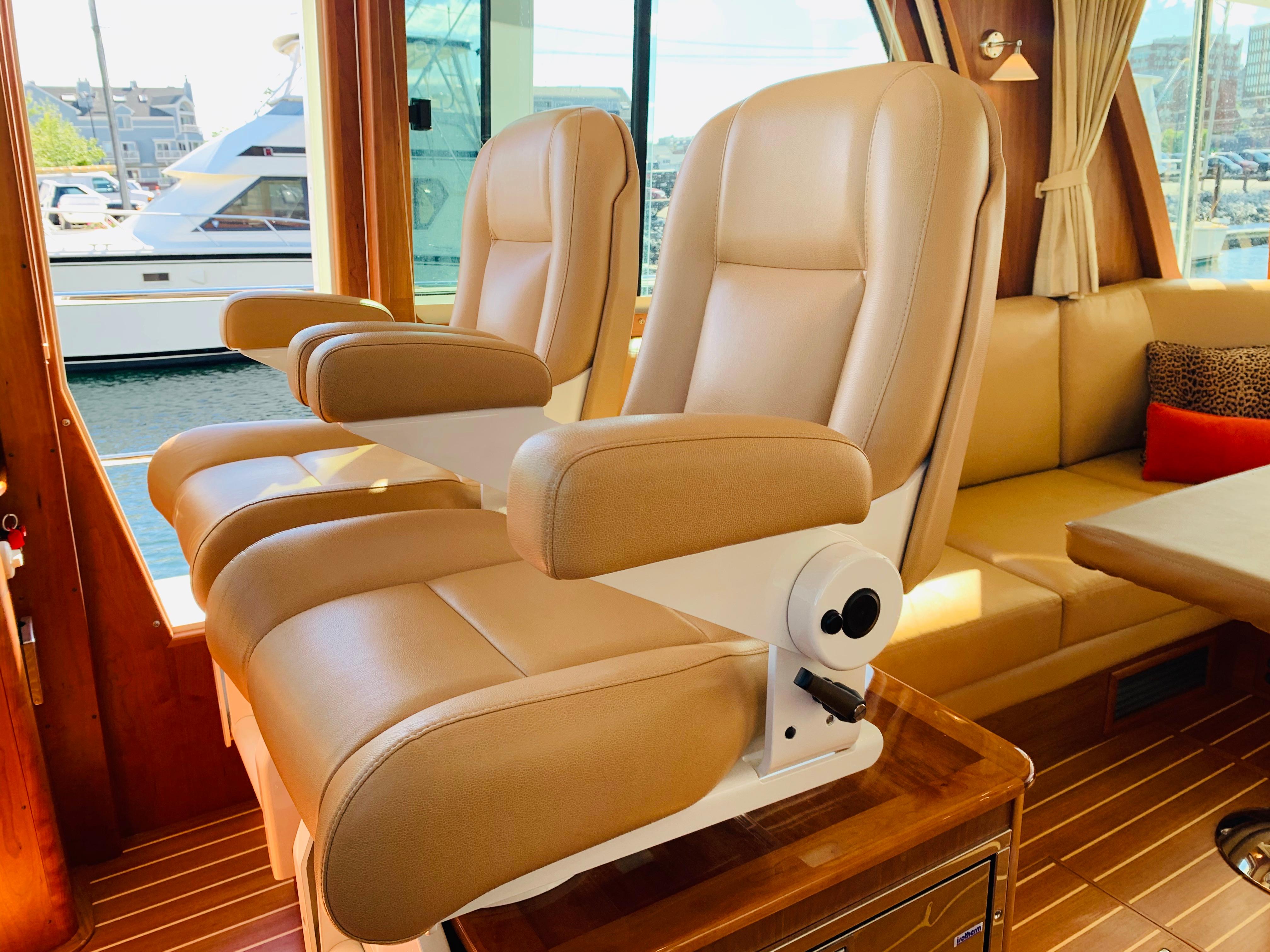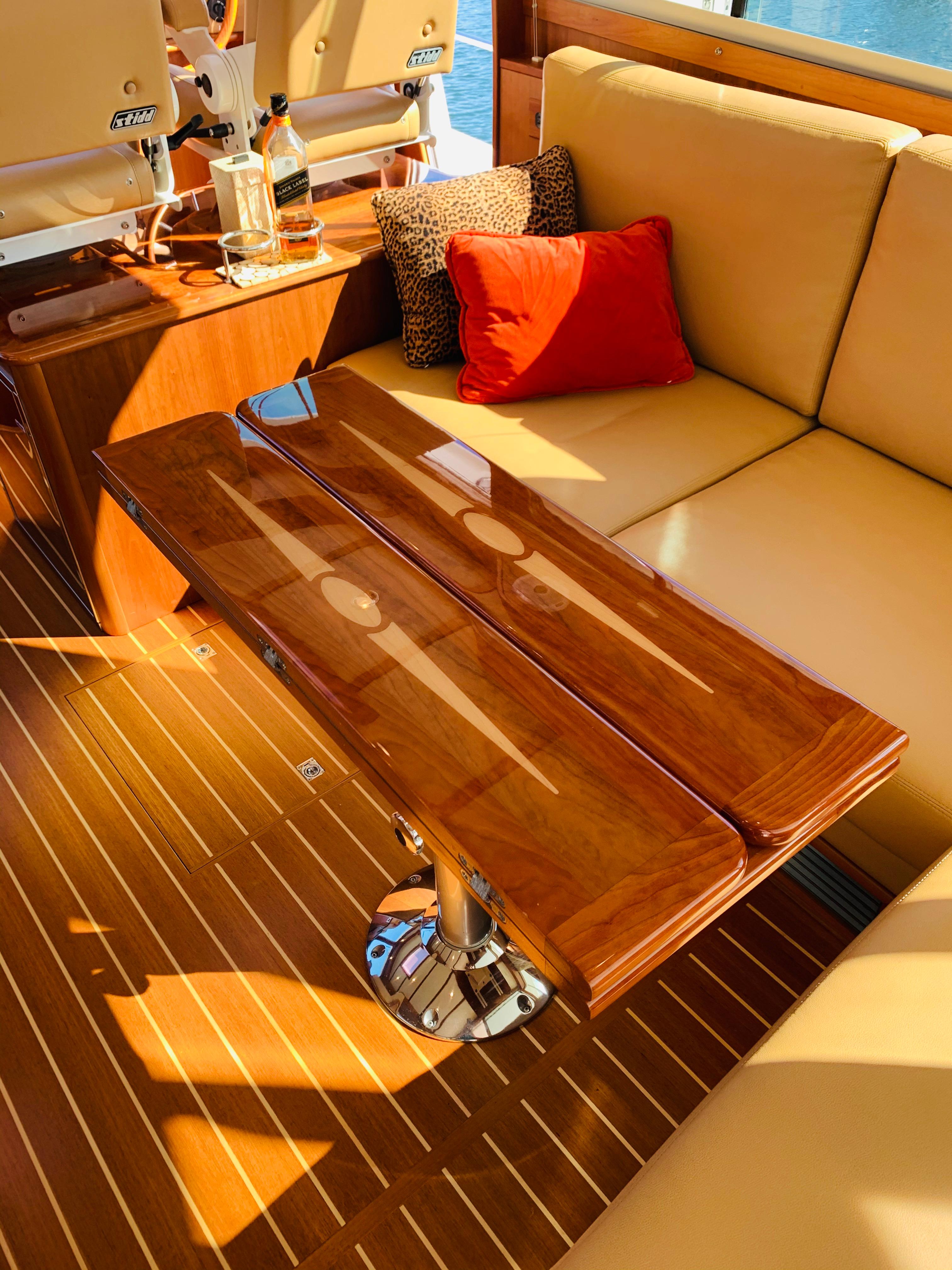 • Replace single helm chair with (2) STIDDS mounted on cabinet with hi-gloss top, Foot rest on forward face, additional refrigerator, starboard settee becomes longer with more seating