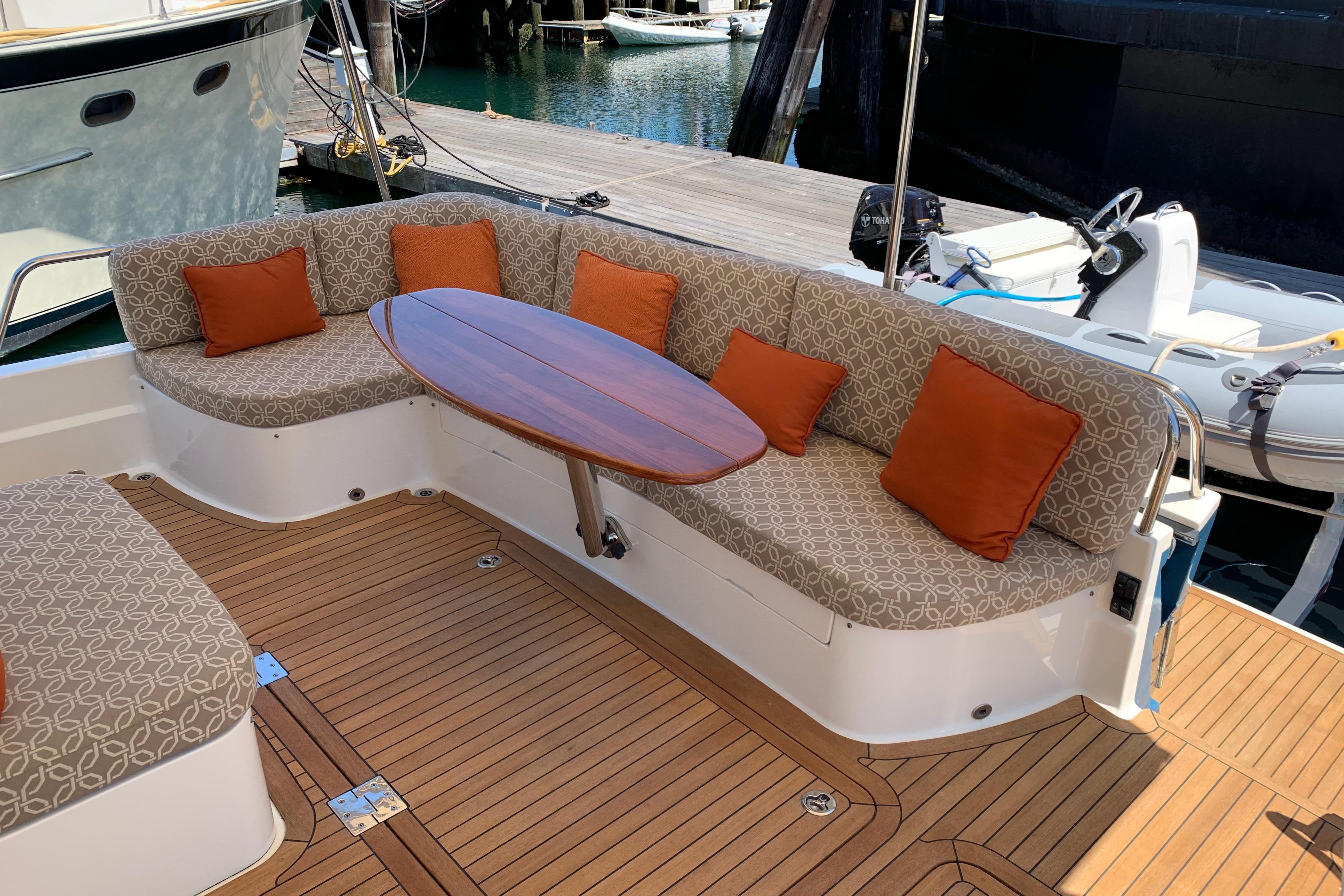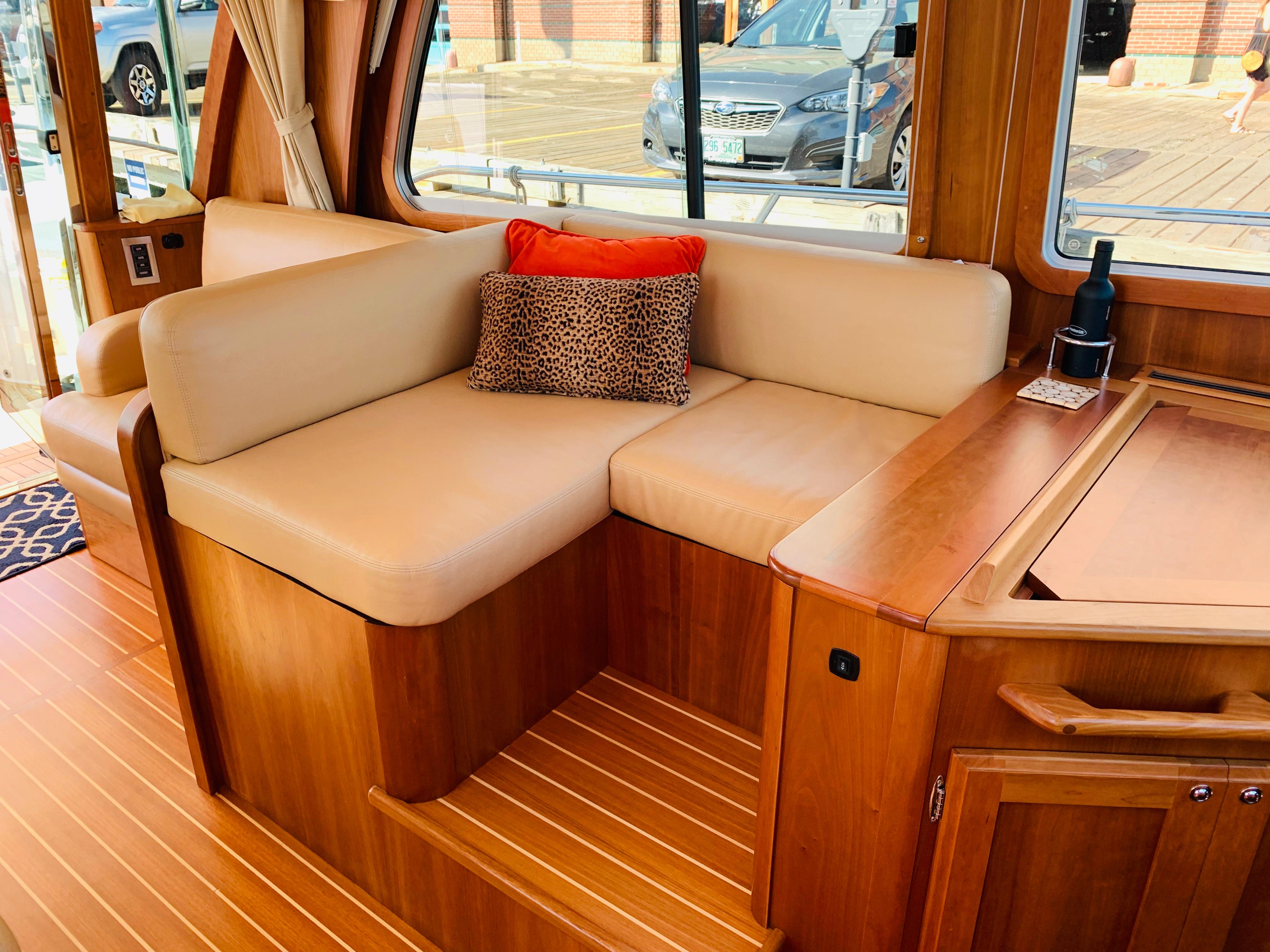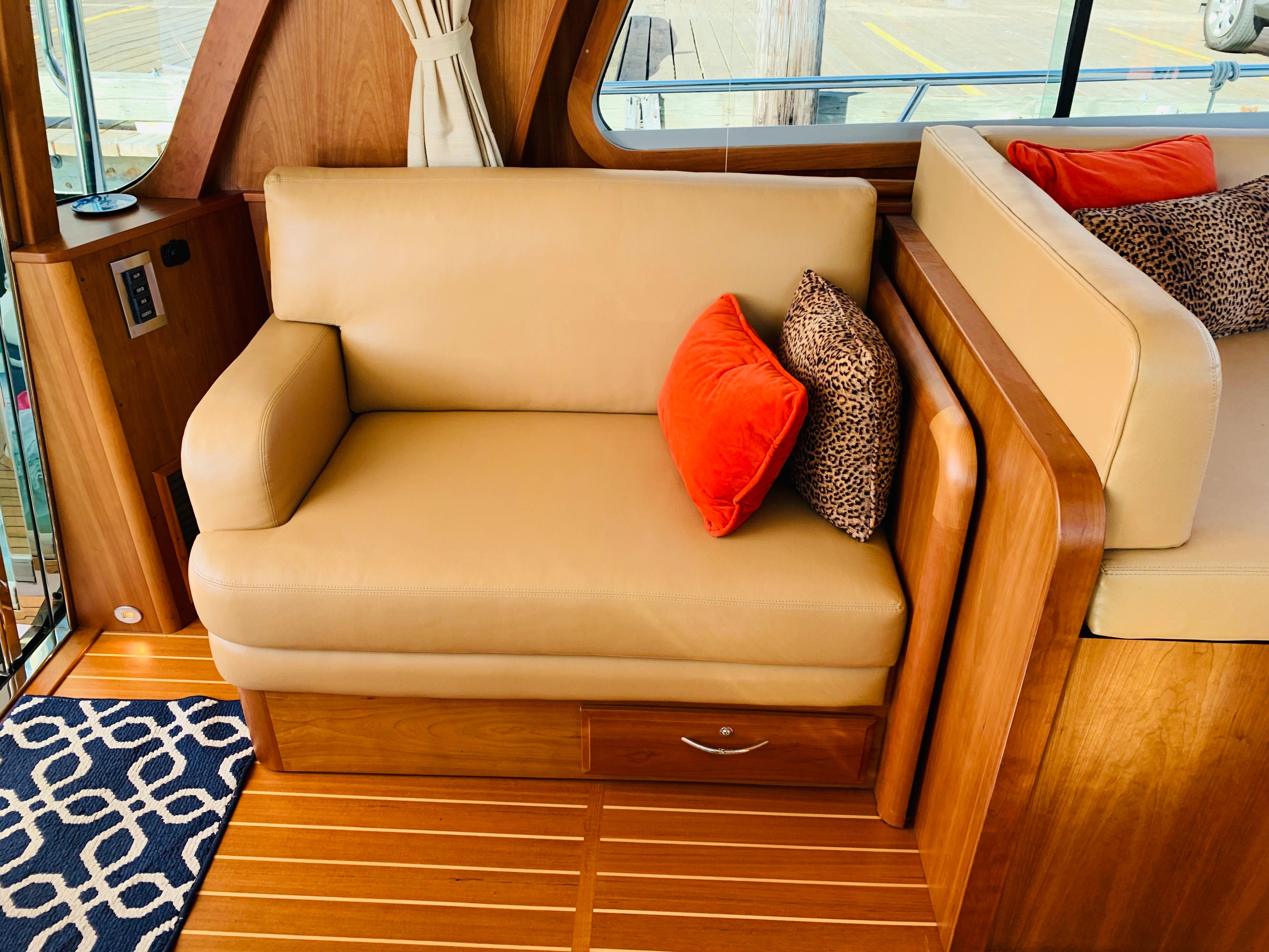 • Replace single helm chair with (2) STIDDS mounted on cabinet with hi-gloss top, Foot rest on forward face, additional refrigerator, starboard settee becomes longer with more seating