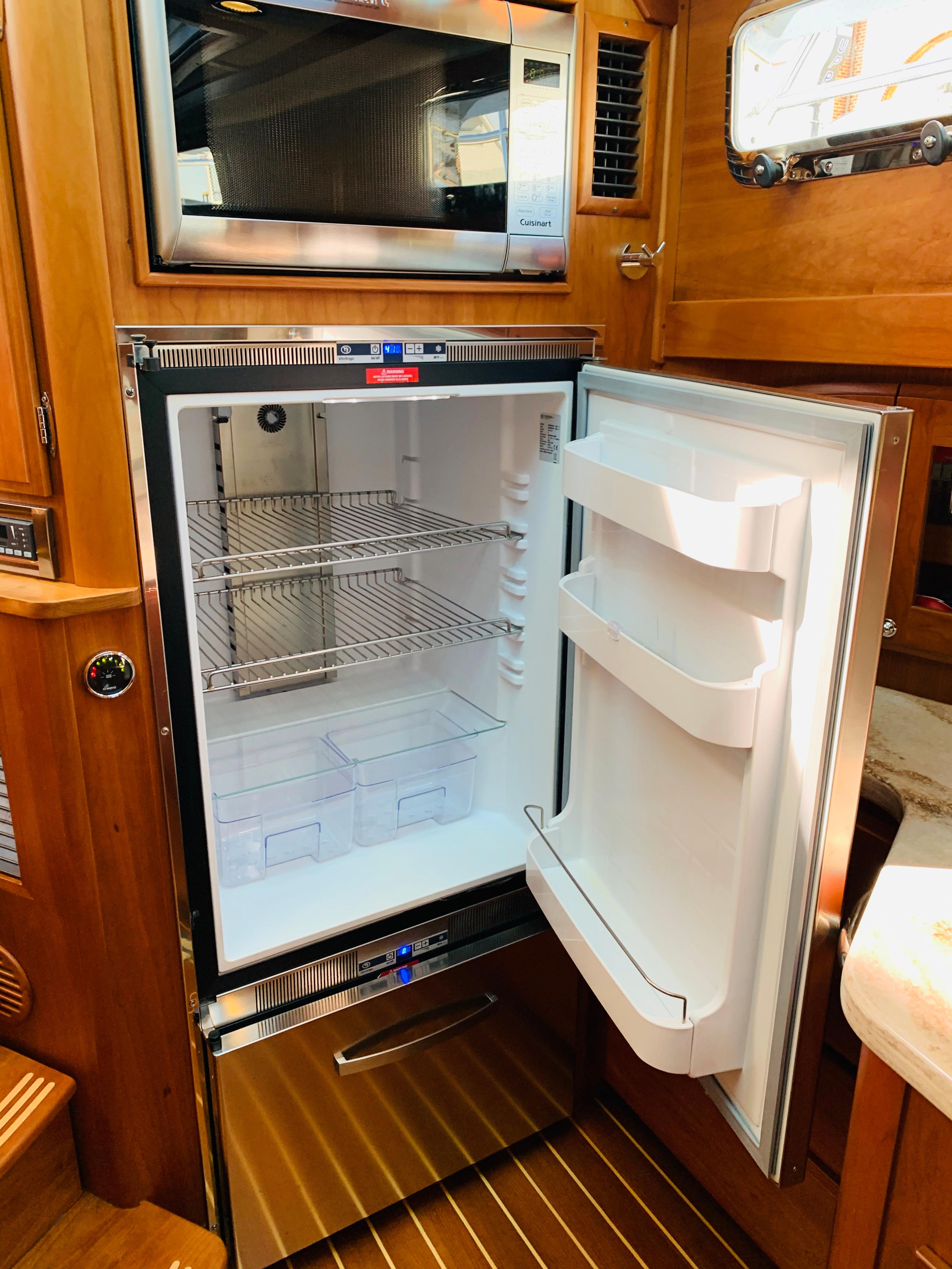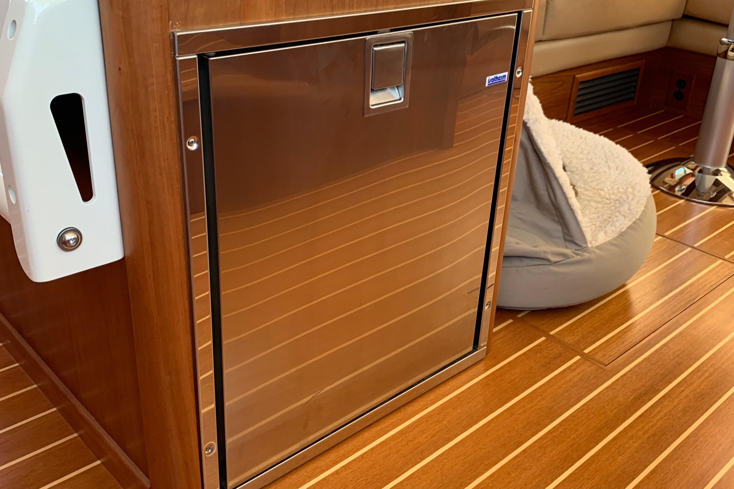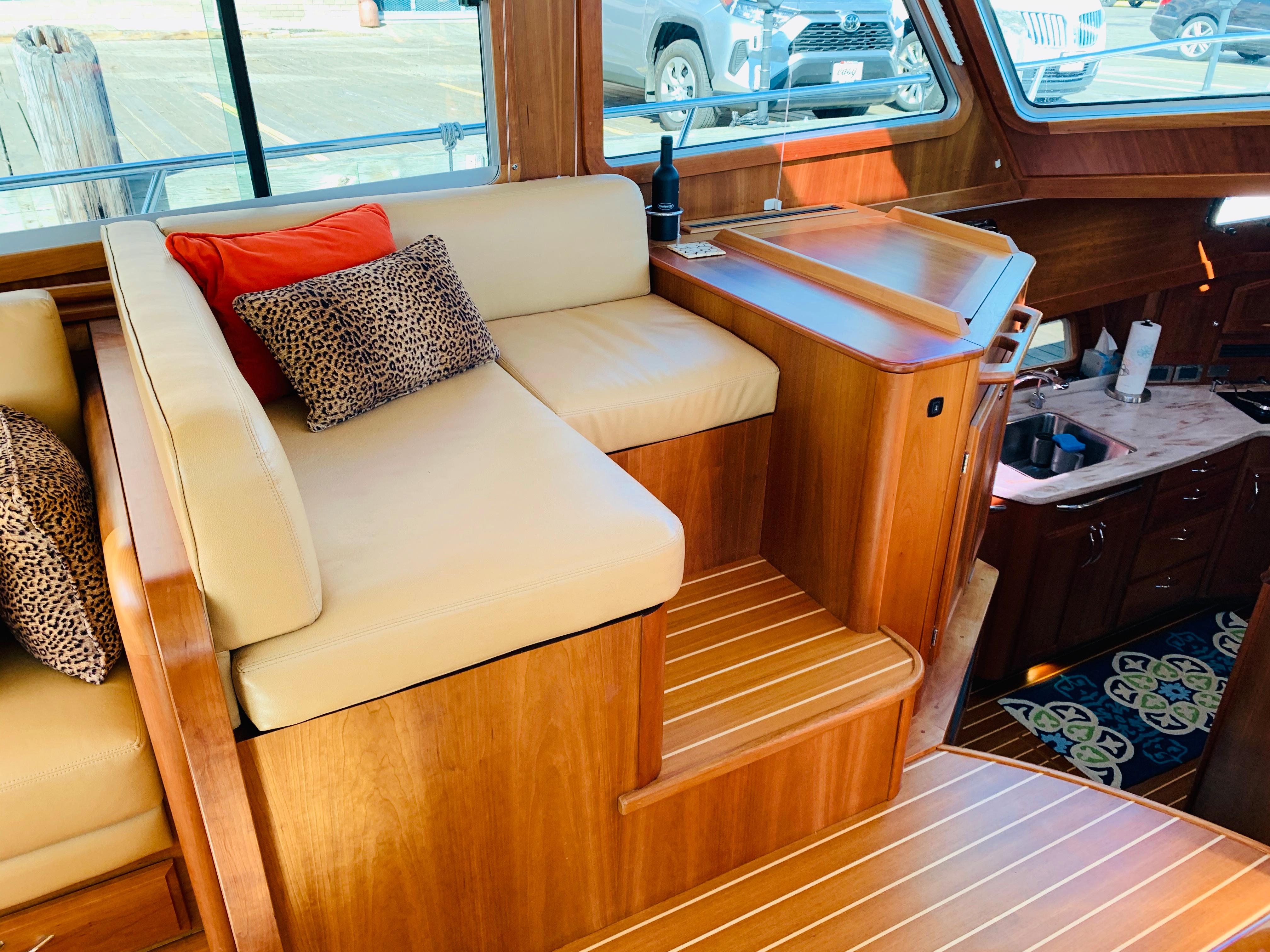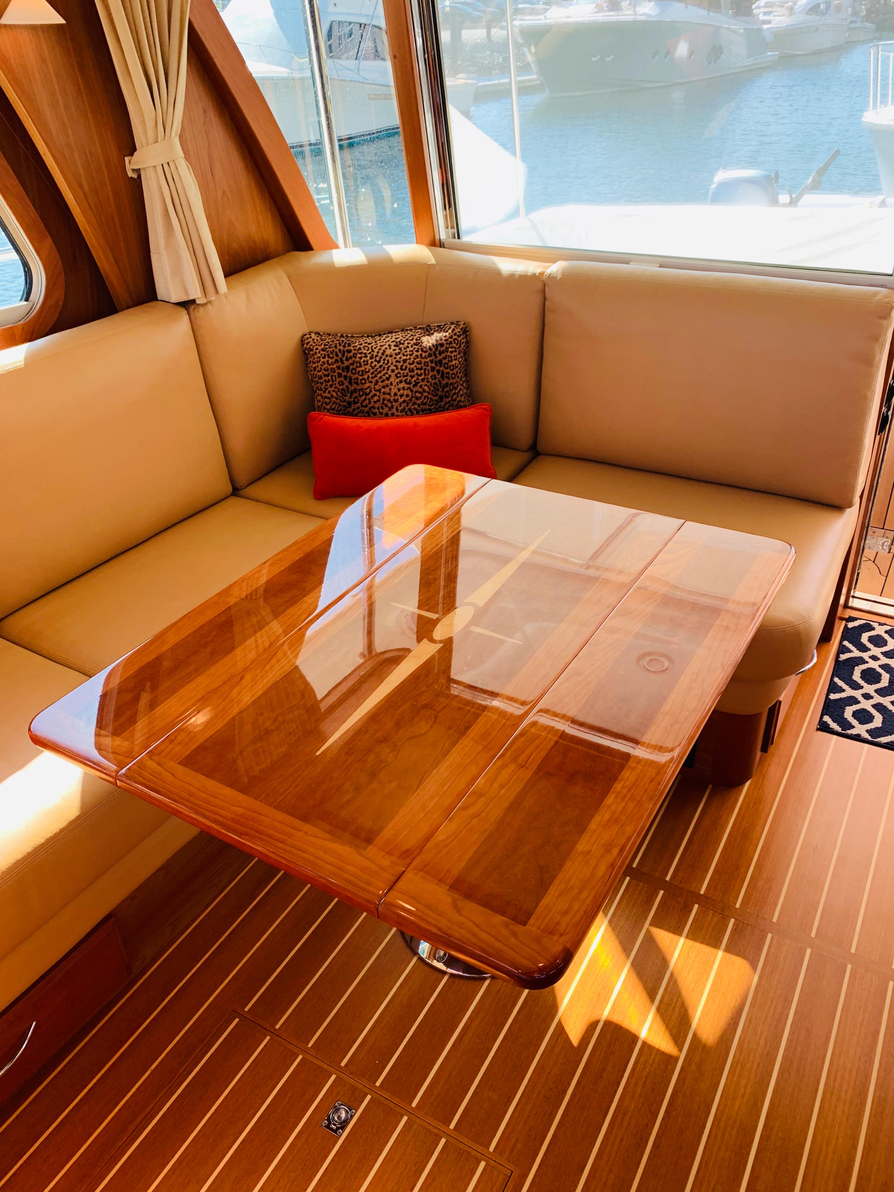 • Replace single helm chair with (2) STIDDS mounted on cabinet with hi-gloss top, Foot rest on forward face, additional refrigerator, starboard settee becomes longer with more seating